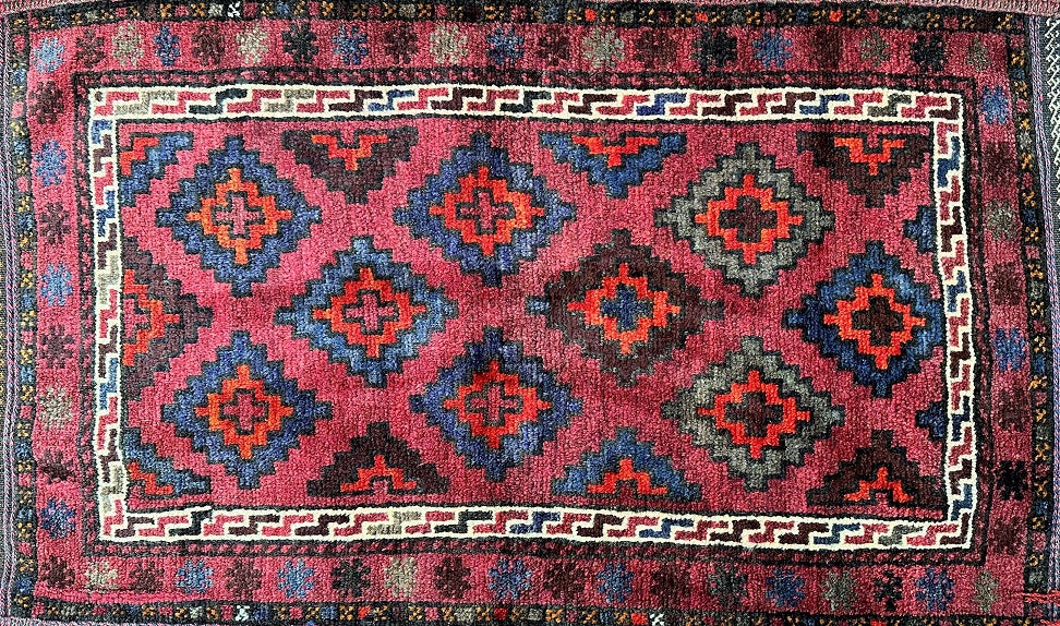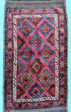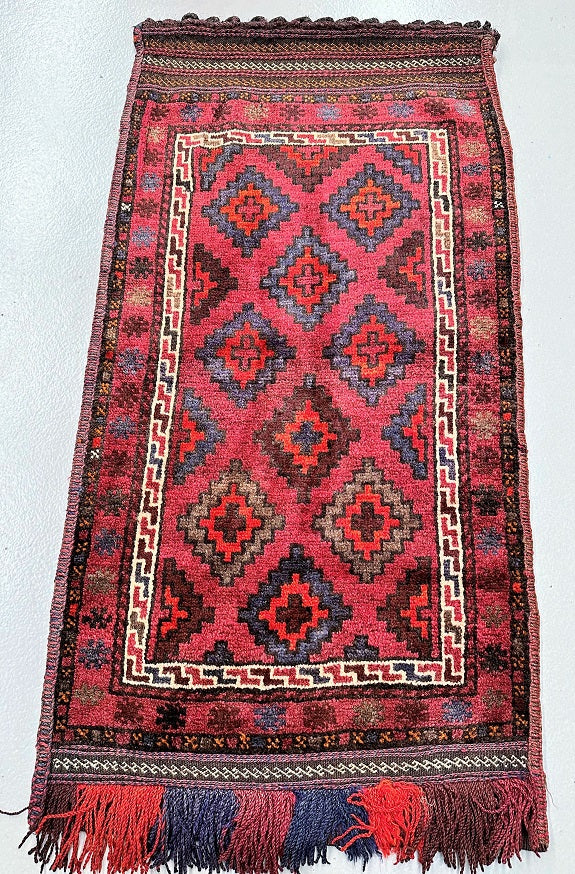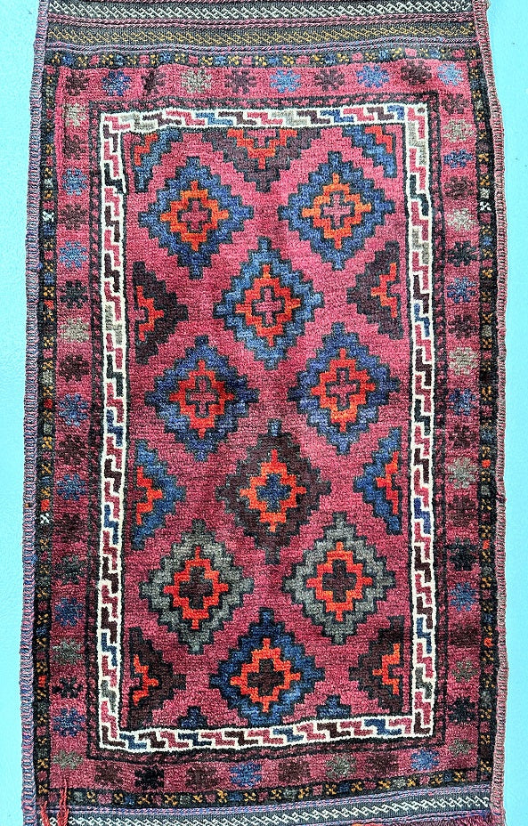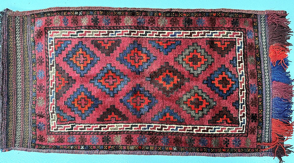 Introducing the Authentic Handmade Afghan Mishwani Balouchi Saddle Rug/Pillow Case. This nomadic piece features a Kilim backing, making it versatile as a large cushion, pillow, or floor rug. The rug/pillow case boasts a pure hand-spun wool pile on a wool base, providing a luxurious feel. The rustic red, blue, beige, black, brown, and orange tones are achieved through traditional dyeing methods. Its geometric tribal design adds a touch of cultural charm. Crafted with utmost care, it took a skilled weaver approximately 2 weeks to complete this masterpiece. Hand-woven in Afghanistan, this rug/pillow case measures 113 x 62 cm and holds a gallery replacement value of $699.