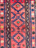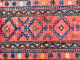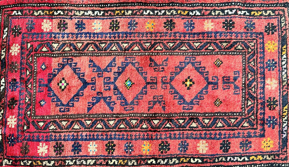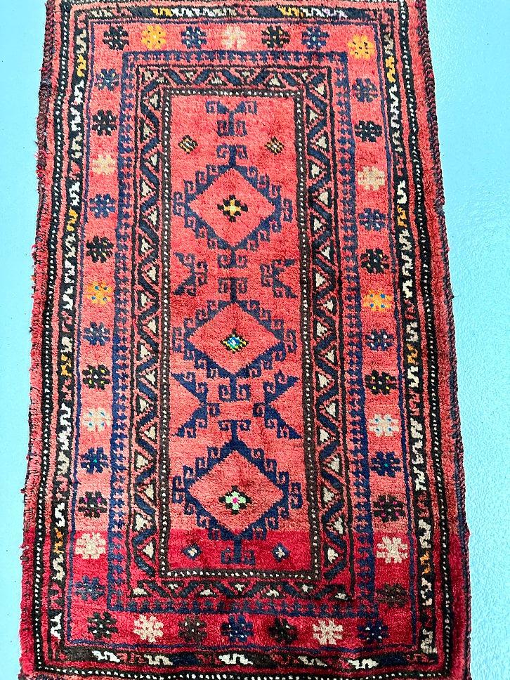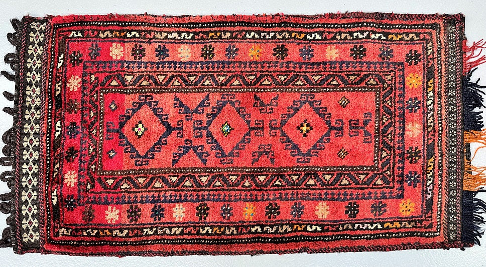 Authentic Handmade Afghan Mishwani Balouchi Saddle Rug/Pillow Case. This versatile piece features a kilim backing, allowing it to be filled and used as a large cushion, pillow, or even as a floor rug. Crafted with a pure hand-spun wool pile on a wool base. Oxidized red, black, indigo blue and orange tones are achieved through traditional dyeing methods, adding to its authentic appeal. With a geometric tribal design, this rug embodies the rich cultural heritage of Afghanistan. It is worth noting that the weaver dedicated approximately 2 weeks to complete this remarkable piece. Hand-woven in Afghanistan, this rug measures 120 x 64 cm and holds a gallery replacement value of $699.