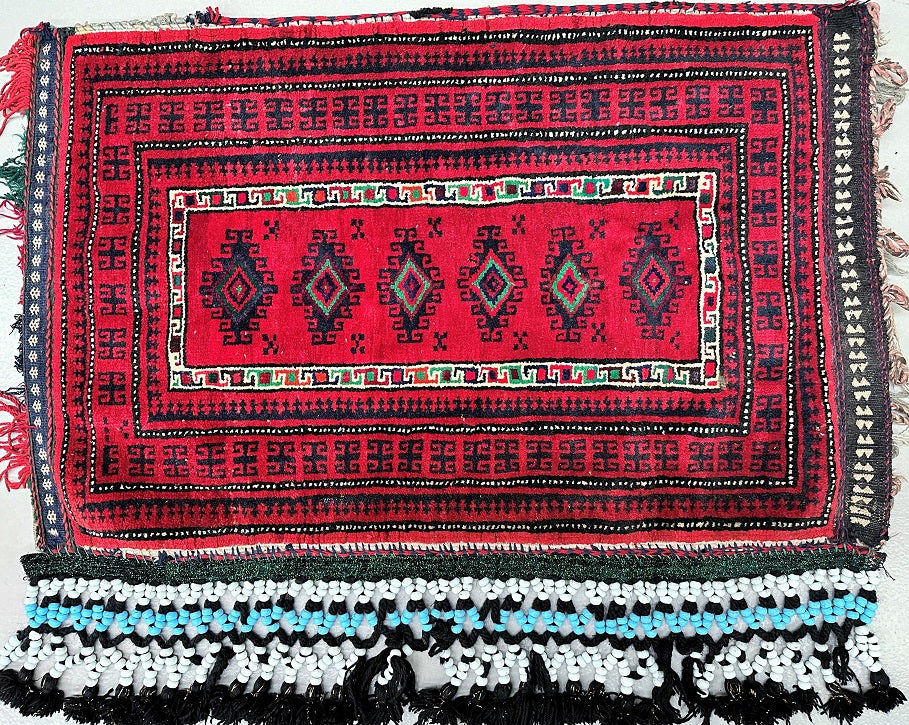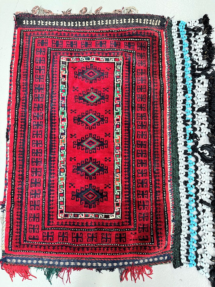 Large Authentic Handmade Afghan Mishwani Balouchi Saddle Rug/Pillow Case. Above All It Has The Kilim Backing And Could Be Filled And Used As A Large Cushion, Pillow Or As A Floor Rug. It Also Has A Pure Hand Spun Wool Pile On Wool Base. Red, Beige, Black, Orange, Green And Blue Tone Dyed Using Traditional Methods.