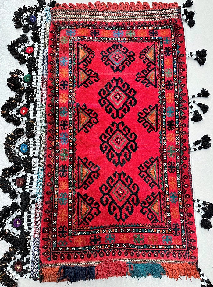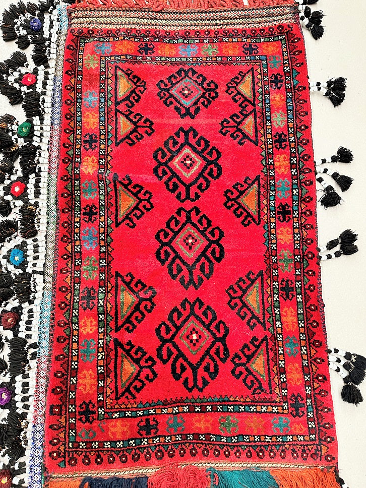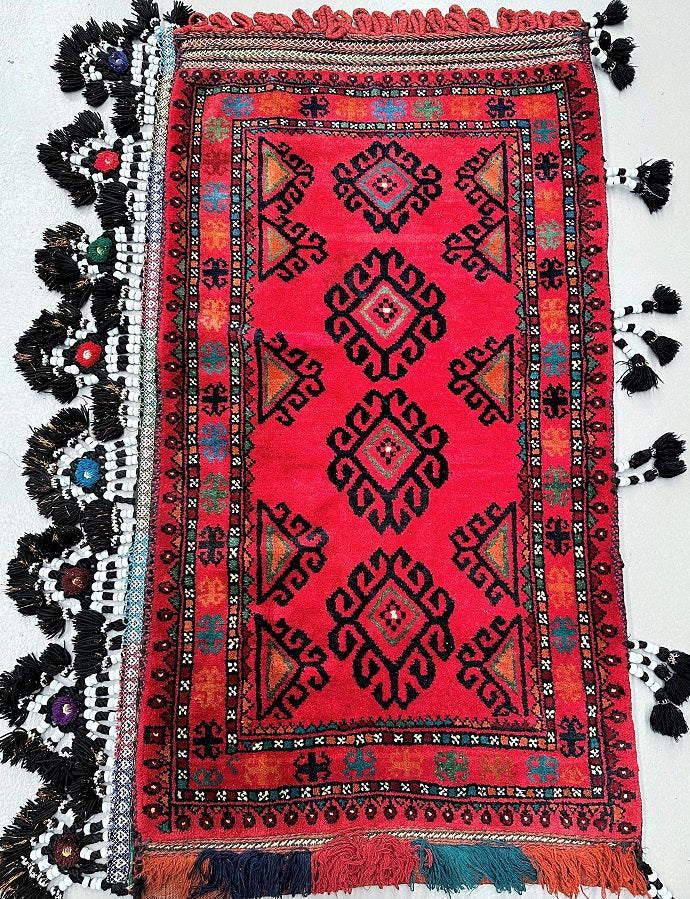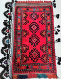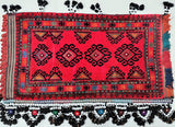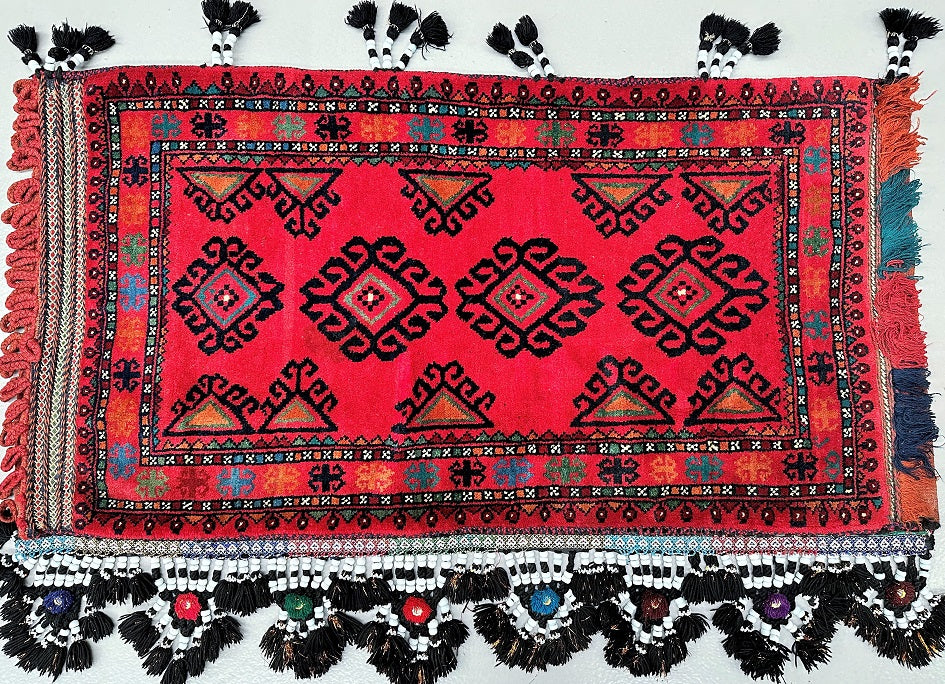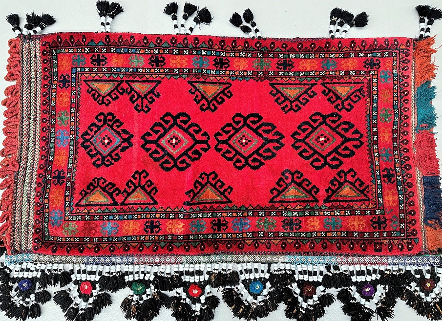 Large Authentic Handmade Afghan Mishwani Balouchi Saddle Rug/Pillow Case. Above All It Has The Kilim Backing And Could Be Filled And Used As A Large Cushion, Pillow Or As A Floor Rug. It Also Has A Pure Hand Spun Wool Pile On Wool Base. Red, Black And Orange Tones Dyed Using Traditional Methods.