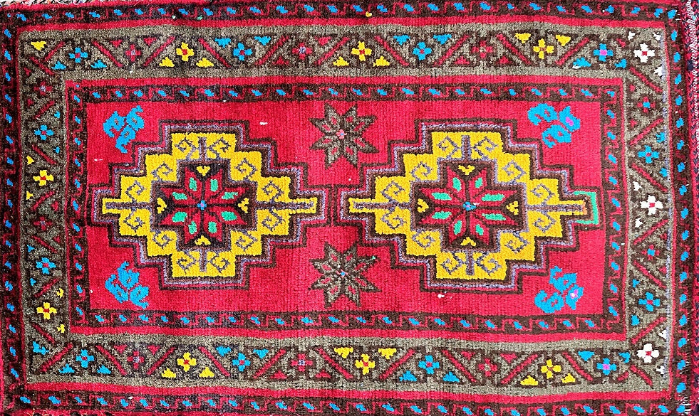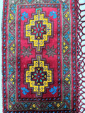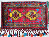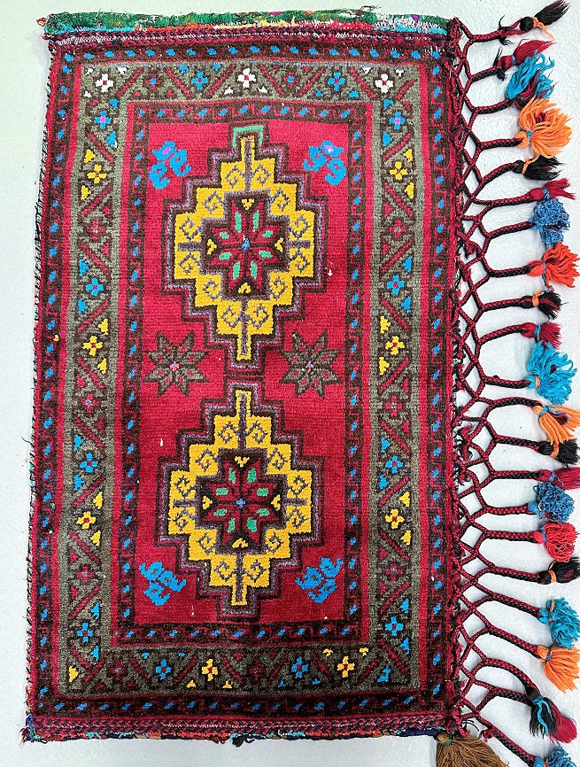 Authentic Handmade Vintage Afghan Mishwani Balouchi Saddle Rug/Pillow Case. Above All It Has The Kilim Backing And Could Be Filled And Used As A Large Cushion, Pillow Or As A Floor Rug. It Also Has A Pure Hand Spun Wool Pile On Wool Base. Red, Black, Blue, Yellow And Brown Tones Dyed Using Traditional Methods.