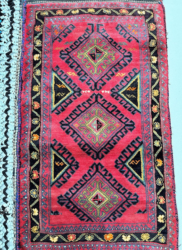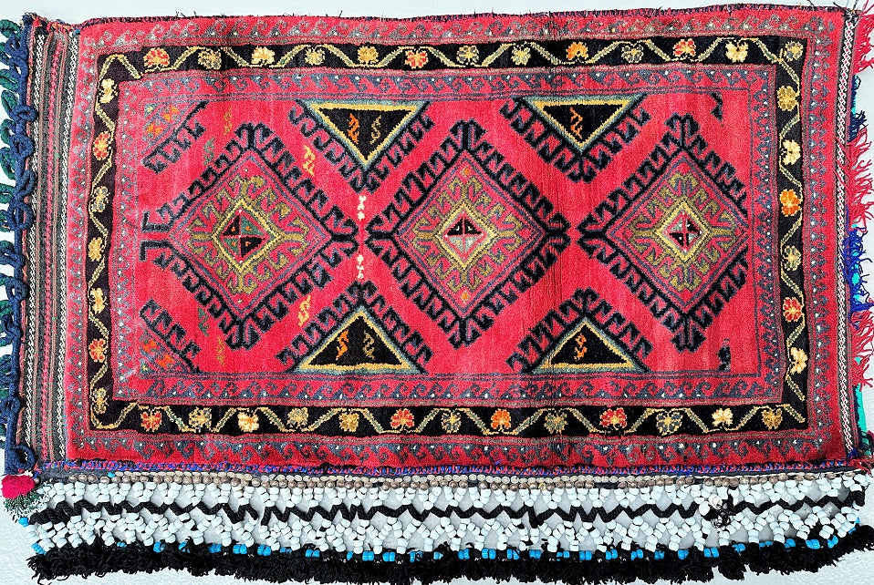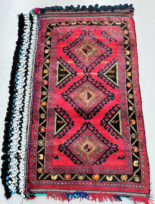 Authentic Handmade Afghan Mishwani Balouchi Saddle Rug/Pillow Case. Above All It Has The Kilim Backing And Could Be Filled And Used As A Large Cushion, Pillow Or As A Floor Rug. It Also Has A Pure Hand Spun Wool Pile On Wool Base. Rustic Red, Beige, Black, Green And Orange Tone Dyed Using Traditional Methods.