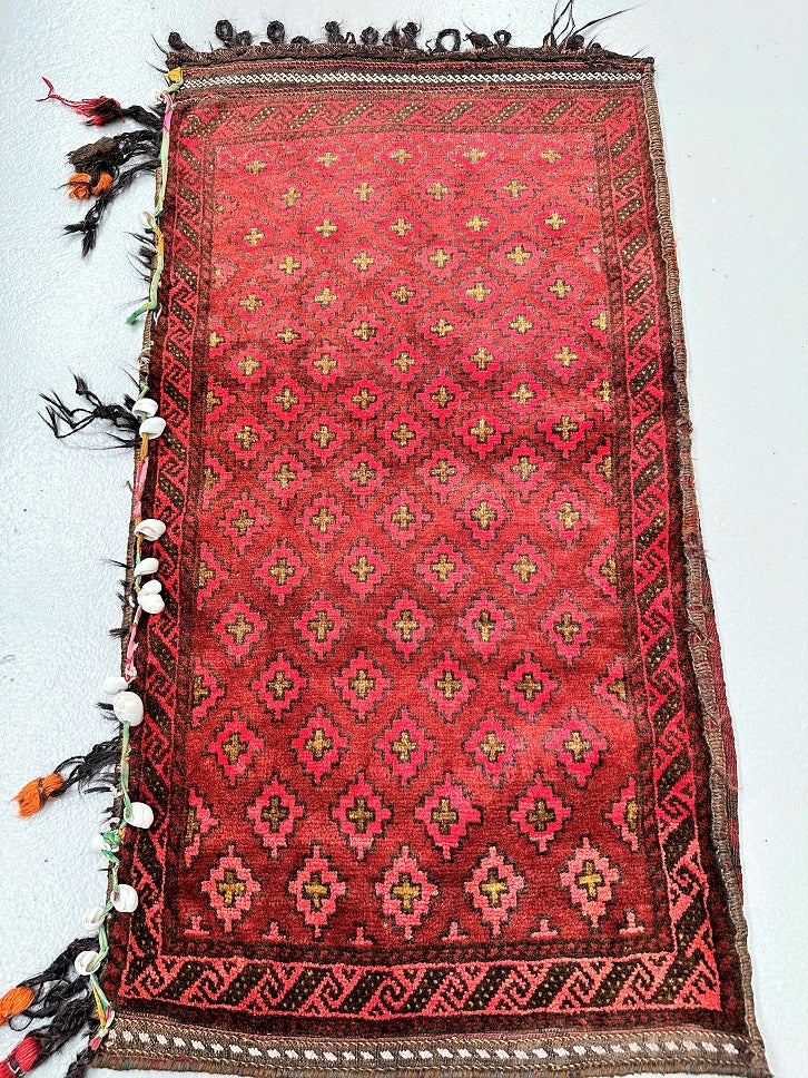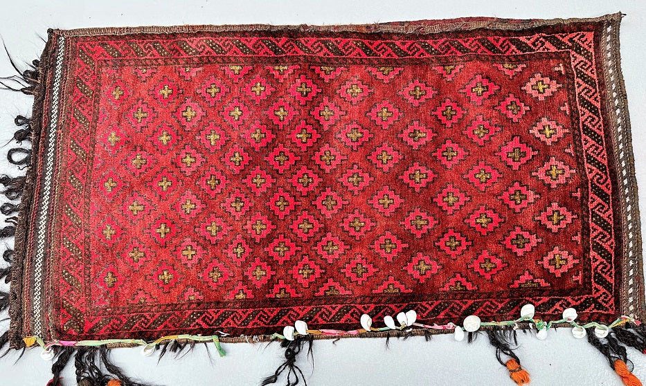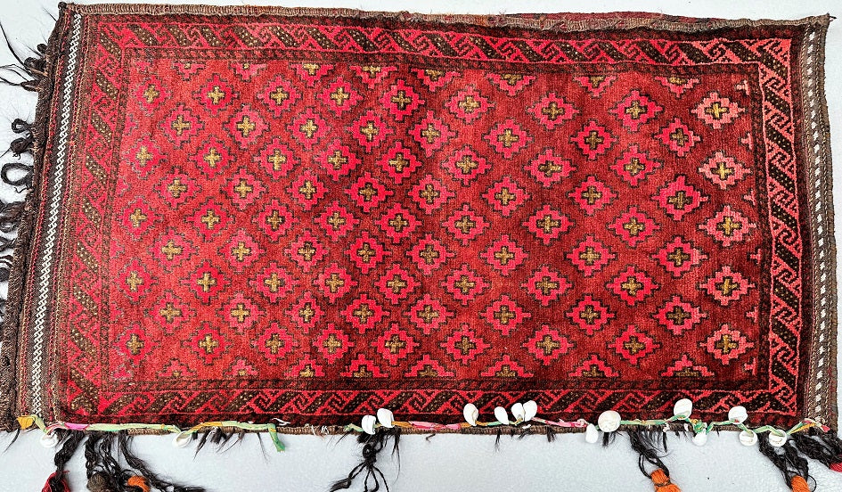 Authentic Handmade Vintage Afghan Mishwani Balouchi Saddle Rug/Pillow Case. Above All It Has The Kilim Backing And Could Be Filled And Used As A Large Cushion, Pillow Or As A Floor Rug. It Also Has A Pure Hand Spun Wool Pile On Wool Base. Oxidised Red, Black, And Orange Tones Dyed Using Traditional Methods.