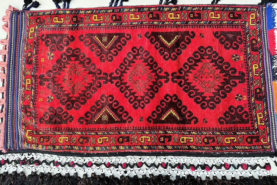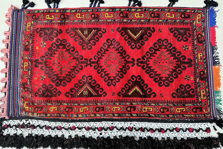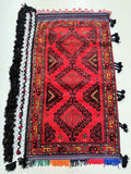 Authentic Handmade Vintage Afghan Mishwani Balouchi Saddle Rug/Pillow Case. Above All It Has The Kilim Backing And Could Be Filled And Used As A Large Cushion, Pillow Or As A Floor Rug. It Also Has A Pure Hand Spun Wool Pile On Wool Base. Red, Black, Beige, Chocolate Brown, Green And Orange Tone Dyed Using Traditional Methods.