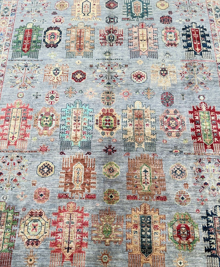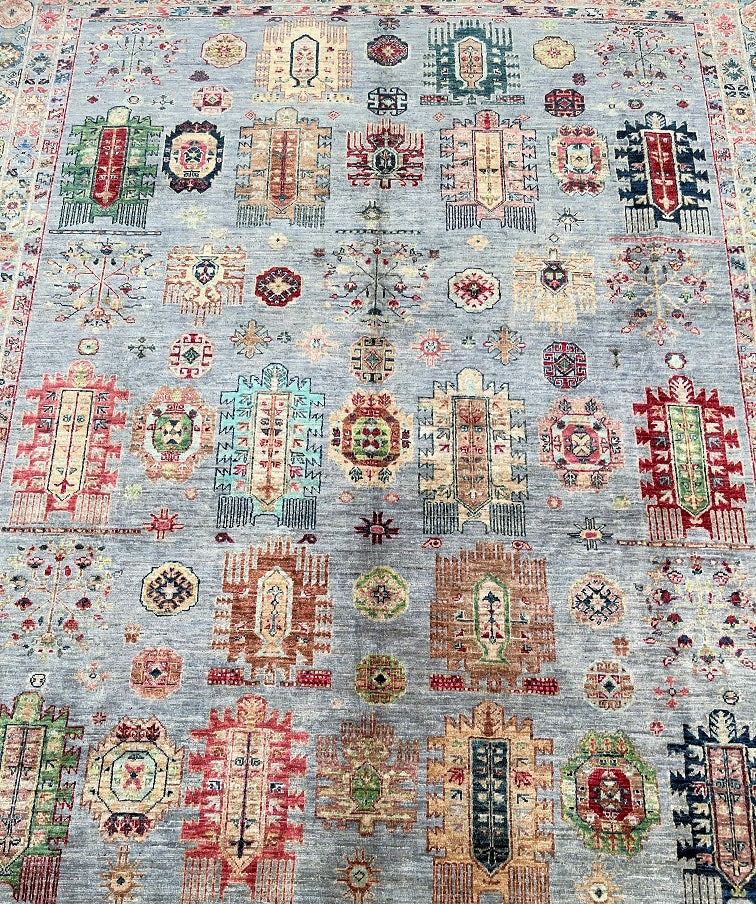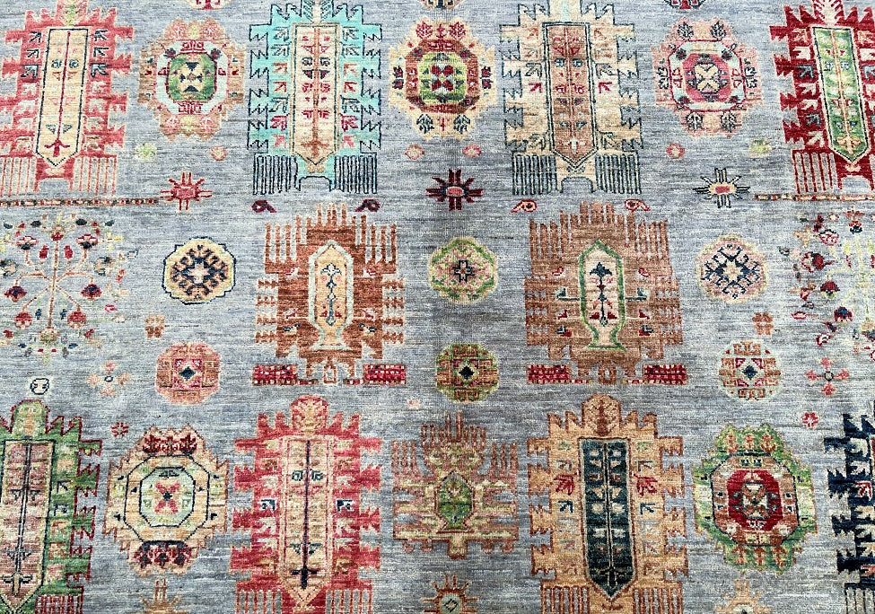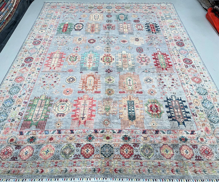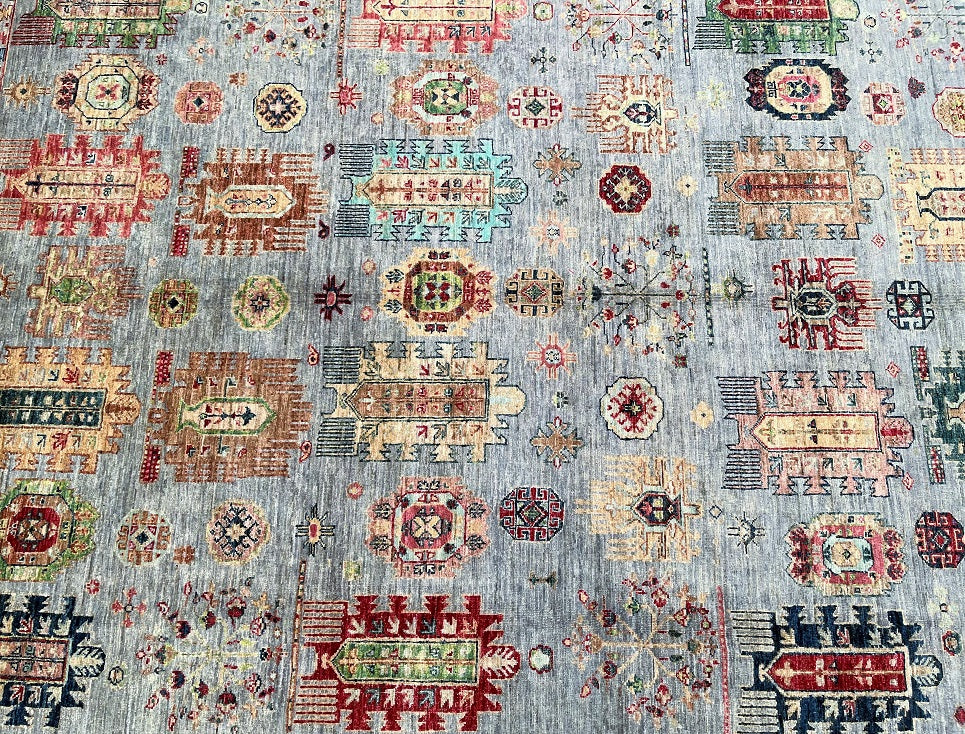Large Room Size Handmade Afghan Super Kazak Rug. Above All It Has a Pure Hand Spun Wool Pile On Cotton Base. Grey Blue, Beige, Maroon, Green, Orange, Brown And Terracotta Tone Dyed Using Traditional Methods (Vegetable Dyes). Last Of True Woven Tribal Art.