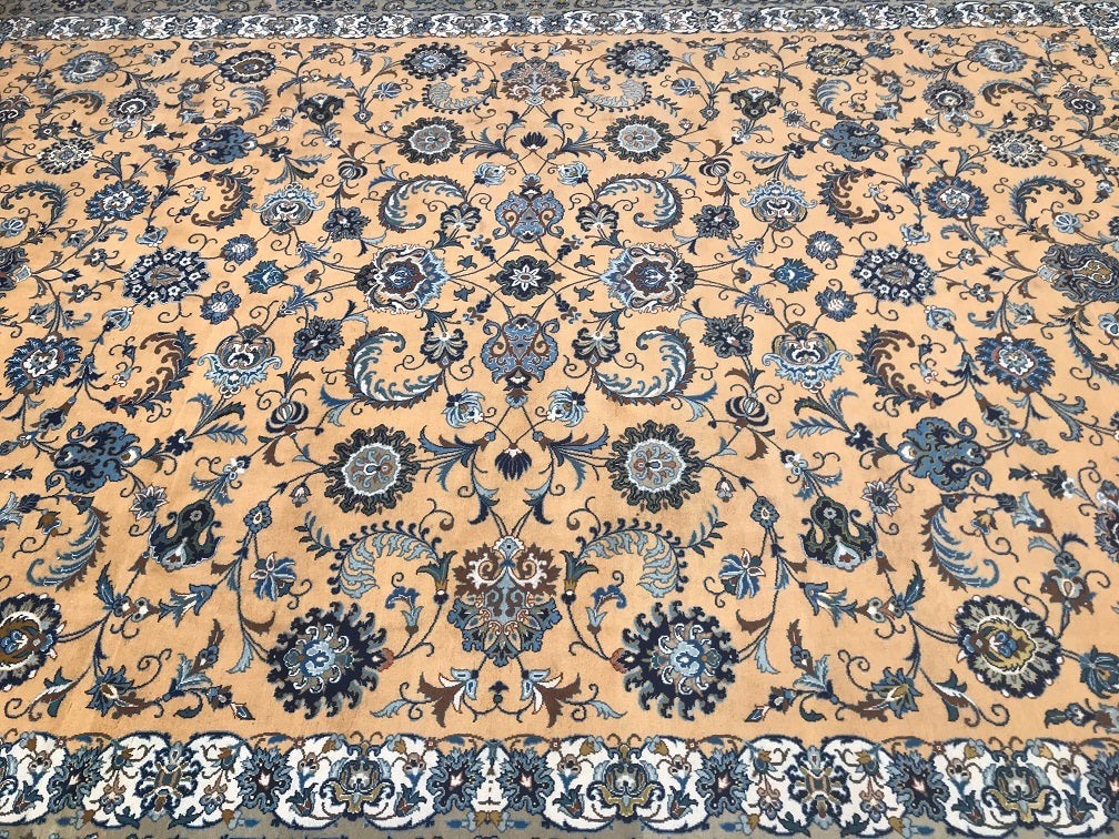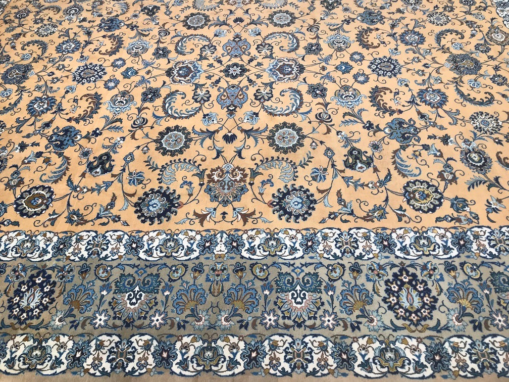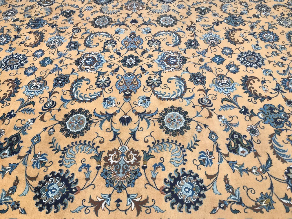 Top Quality Antique Large Room Size Authentic Persian Kashan Carpet in Mint Condition. Above All It Is A Collector's Dream. One Of The Best One I Have Seen In Last 20 Years. Pure Lamb’s Pile on Cotton Base. Stunning Caramel And Blue Dyed Using Traditional Methods. Superb Quality Piece from Weaving House of “Asoudegi-Kashan” (Woven Circa 1950's).