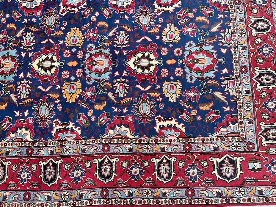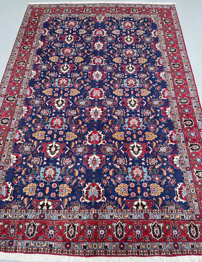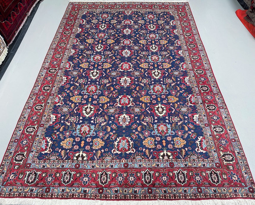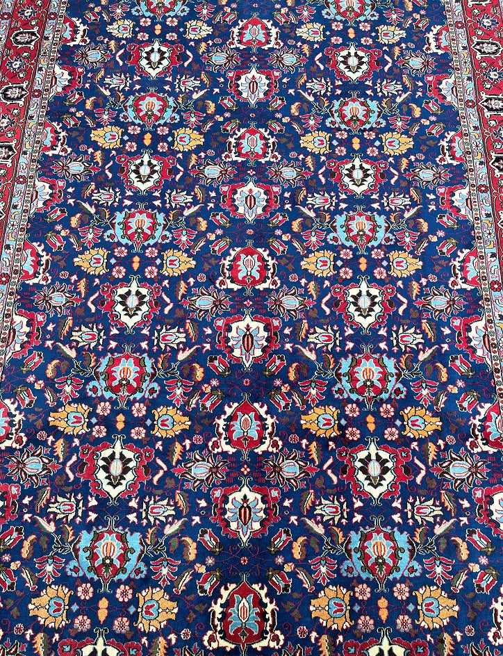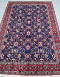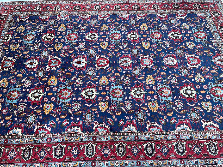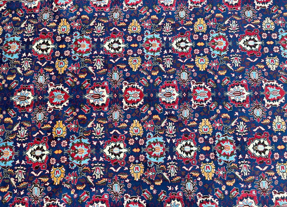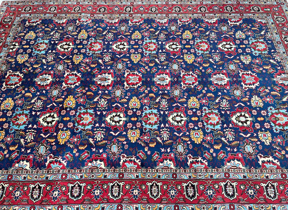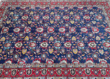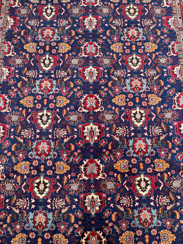 Rare And Collectible Full Room Size Authentic Handmade Antique Persian Varamin Rug Circa 1960’s. This Rug Has a Pure Lamb’s Wool Pile On Cotton Base. Navy Blue, Beige, Red, Brown, Orange And Black Tones Dyed Using Traditional Methods. One Of Kind Design And Colour Combination Which Make This Rug Very Unique.