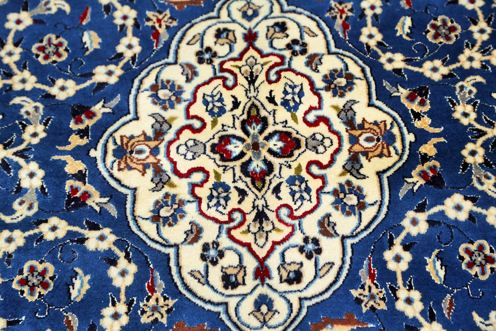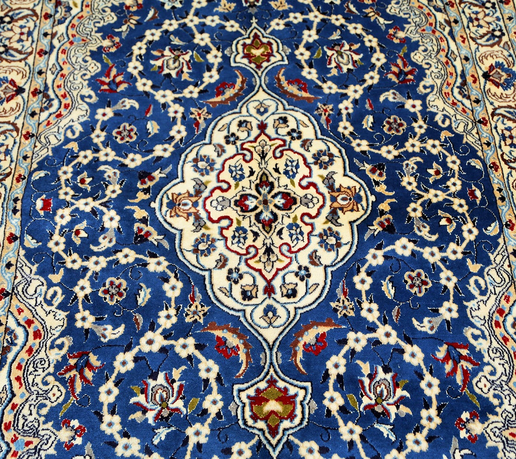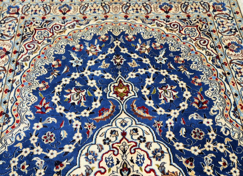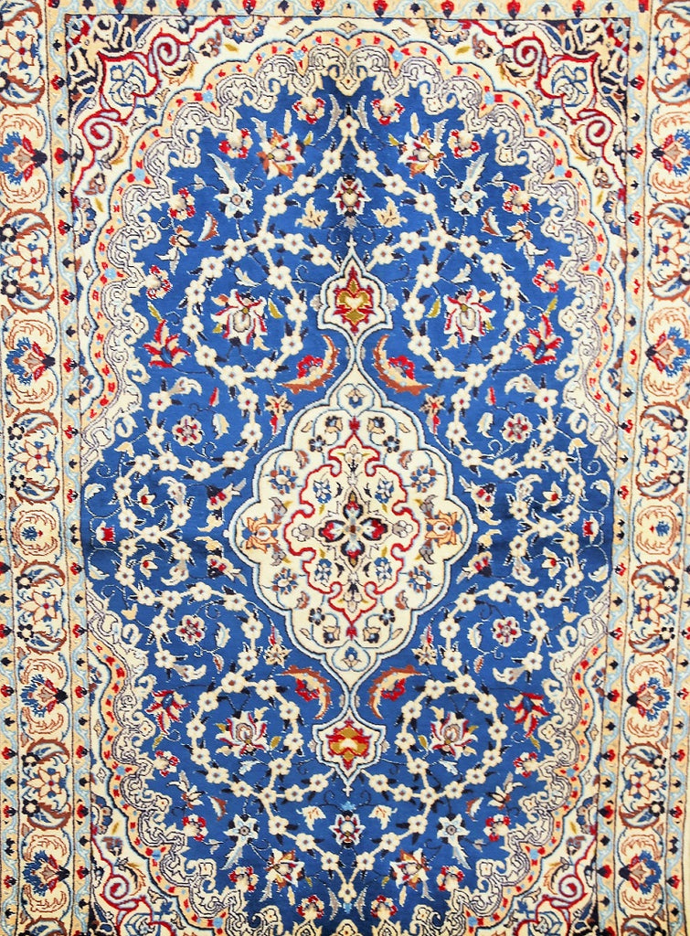 Superb Quality Coffee Table Size Authentic Persian Nain Carpet. Above All It Is Hard To Get This Quality Hand Made Rug. It Also Has Lamb’s Wool And Silk Inlaid On Cotton Base. French Blue And Beige Tones Dyed Using Traditional Methods. Superb Quality Piece From City Of Nain.