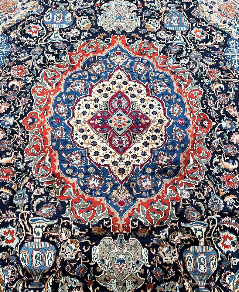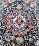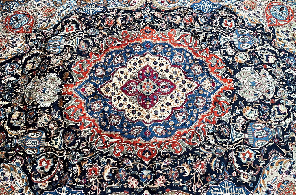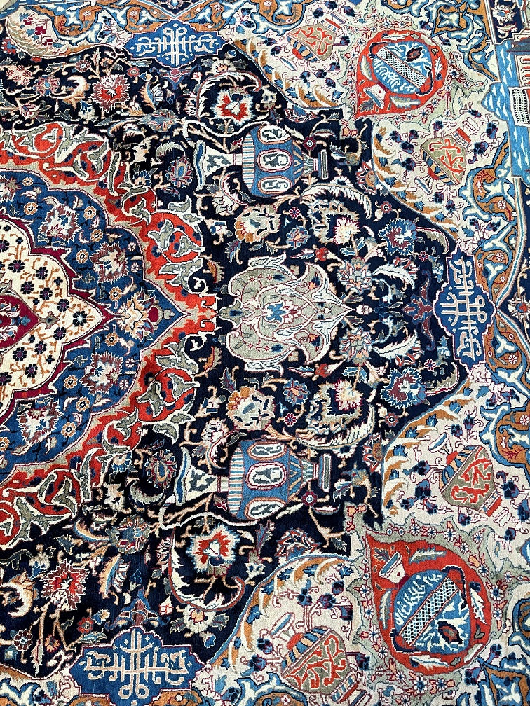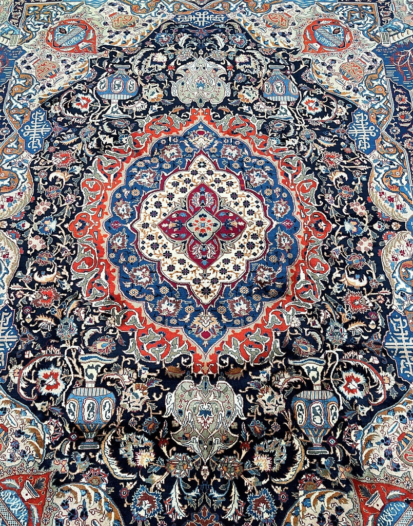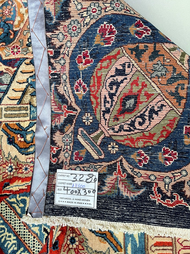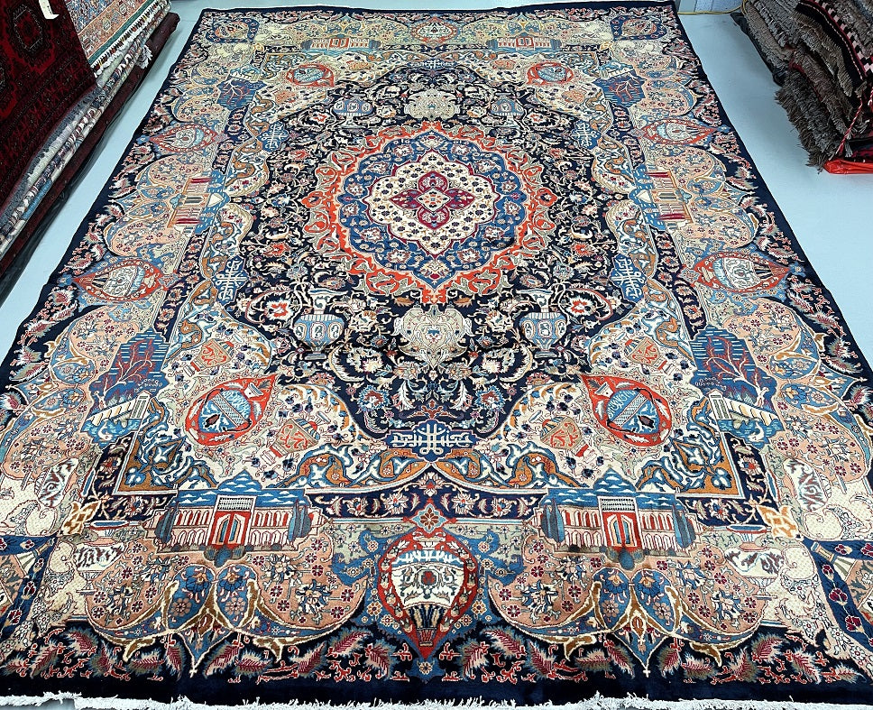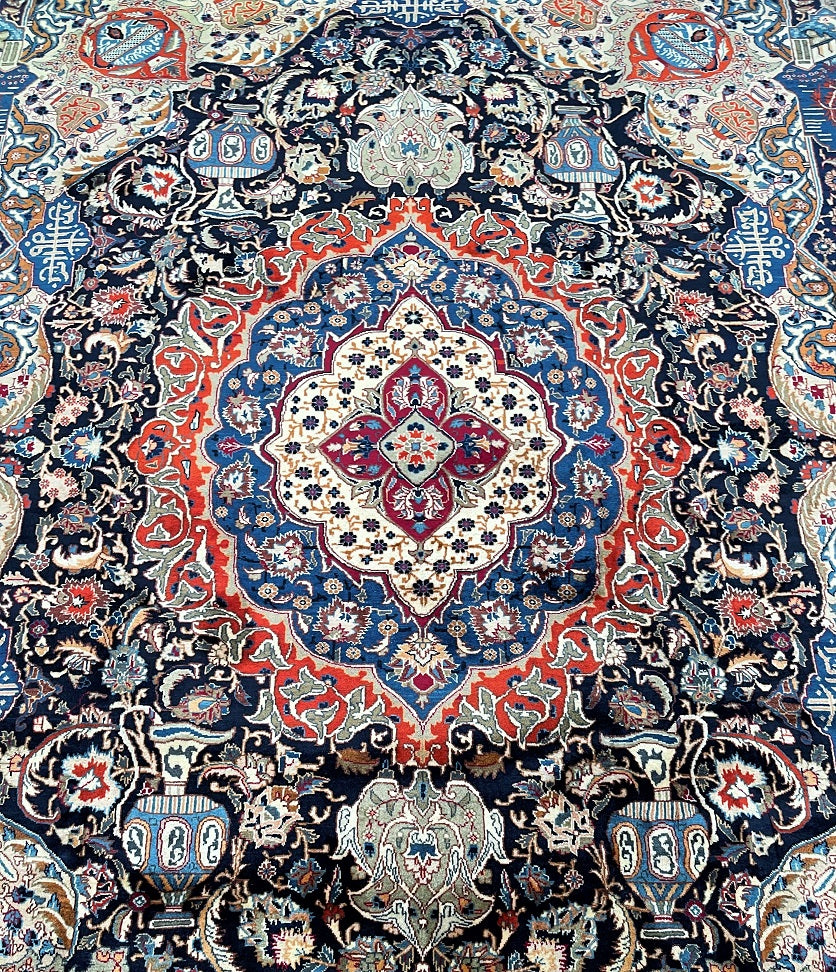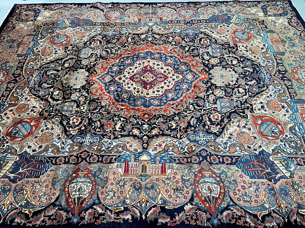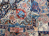 Massive Room Size Archeological Design Handmade Persian Kashmar Rug. Above All This Is A High Quality Version Of Kashmar Rugs (One Of The Best In Our Collection). It Also Has A Pure Lamb’s Wool Pile On Cotton Base, Indigo Blue Background Dyed Using Traditional Methods (Organic Dyes).
