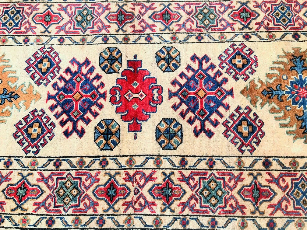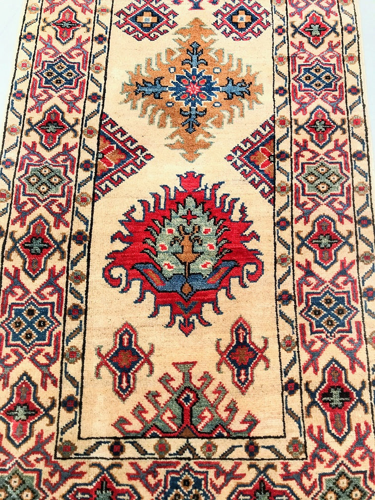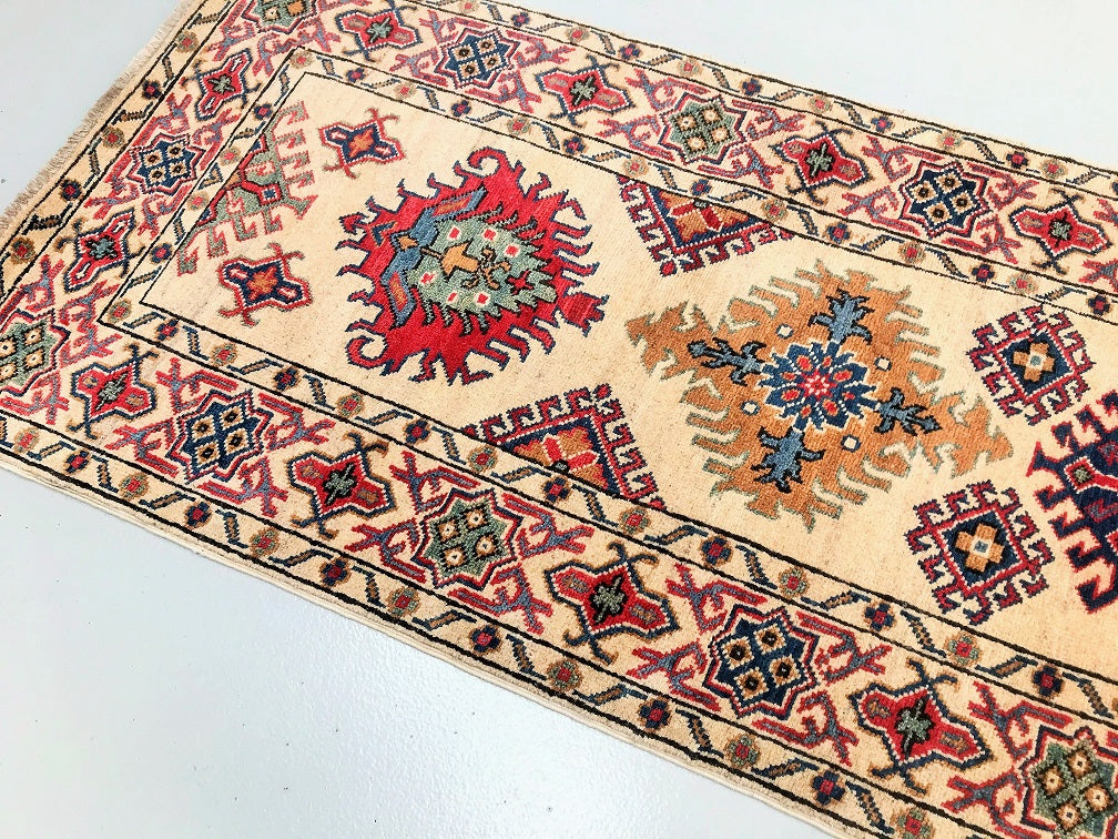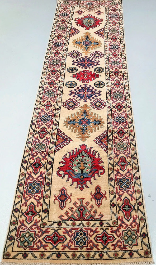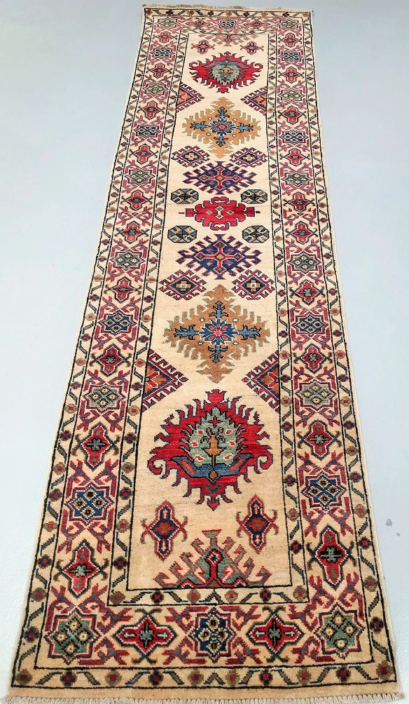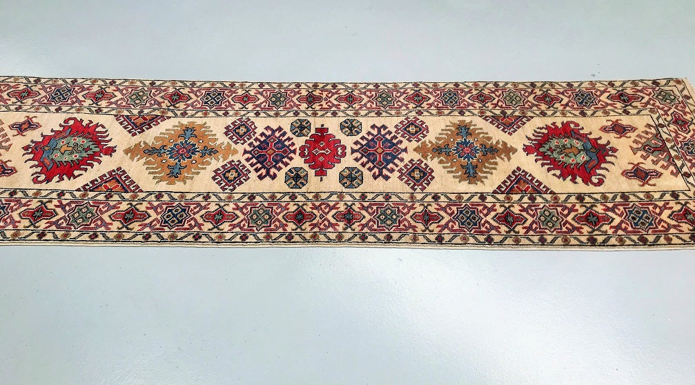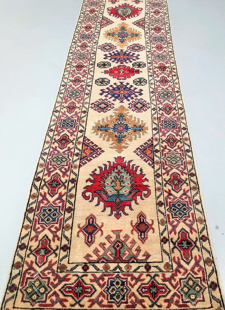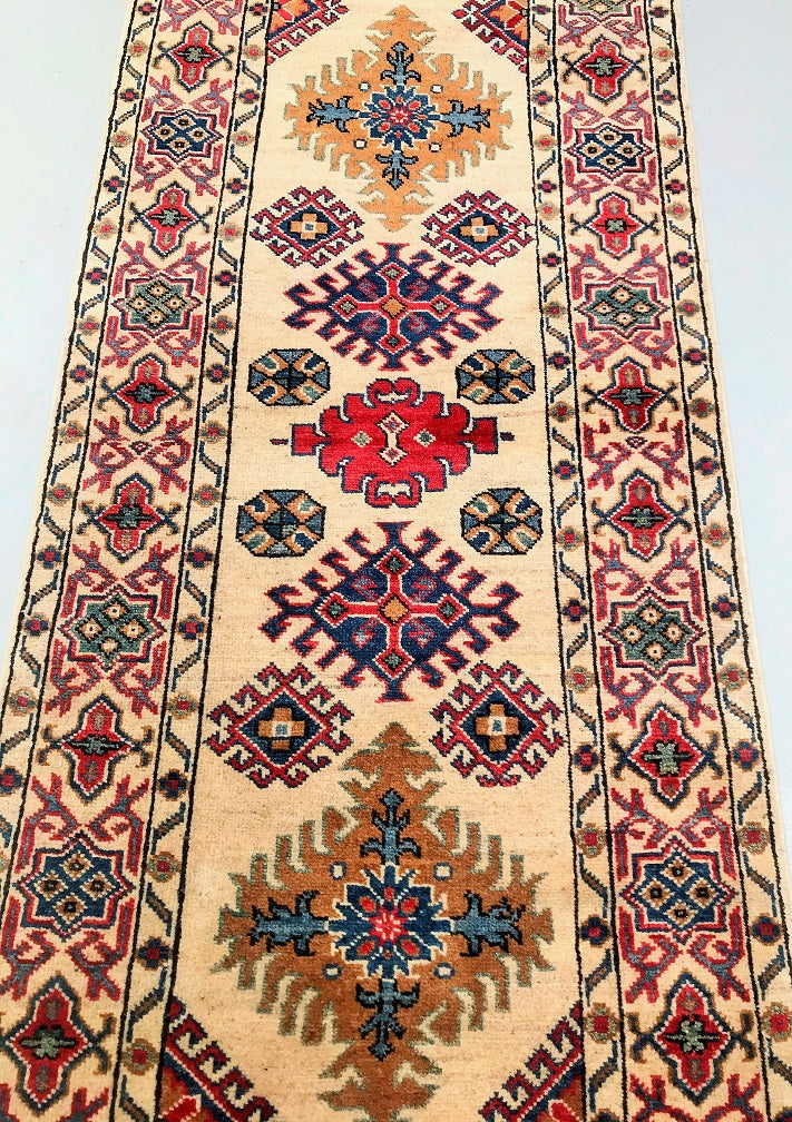 Free Shipping Australia Wide Offered! Certified Hand Knotted Afghan Hall Runner 280x75cm Decorative Handmade Afghan Kazak Hall Runner. Above All Its Rare To Get Kazak Runner In Beige Tone. It Is Pure Hand Spun Wool Pile On Cotton Base. Gorgeous Be...