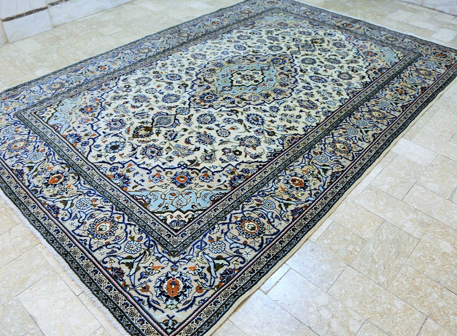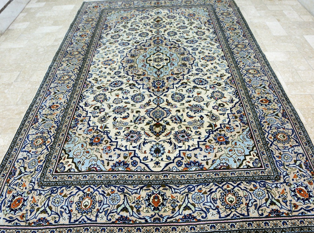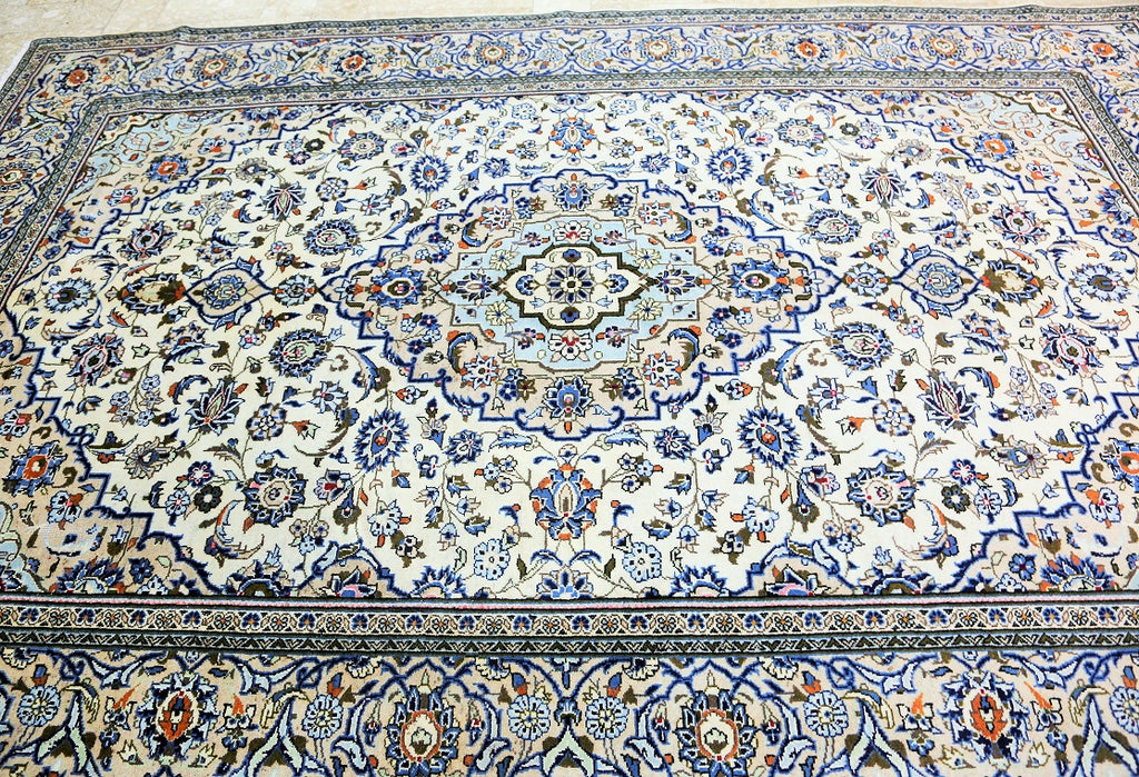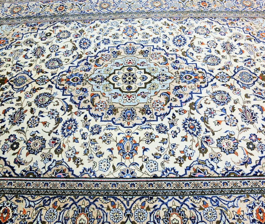 Full Room Size Authentic Persian Kashan Rug. Above All It Is Hard To Weave This Quality Original Handmade Rug In Larger Sizes. Kashan Is A City In Central Persia. This Rug Has A Pure Lamb’s Wool Pile On Cotton Base. Beige And Blue Tone Dyed Using Traditional Methods. Fine Quality Piece That Would Last A Life Time.