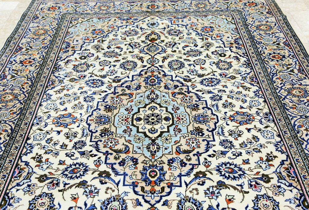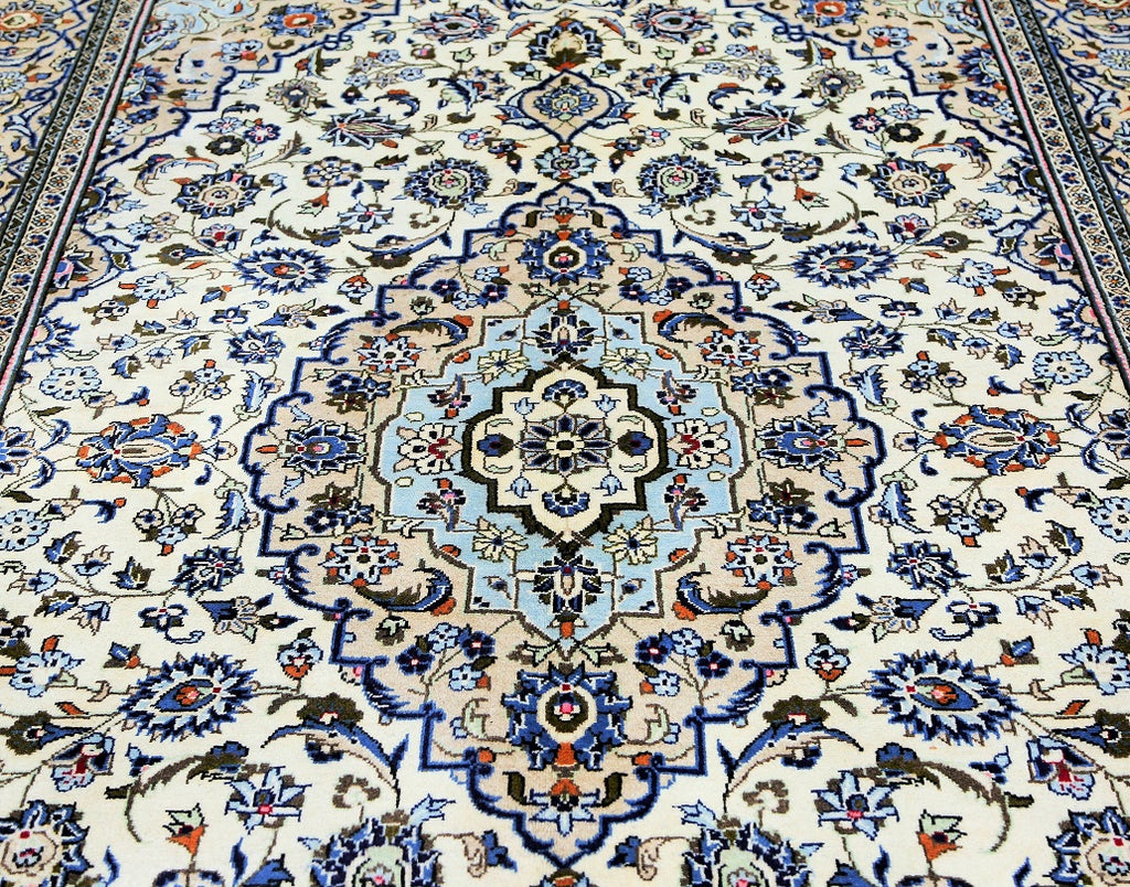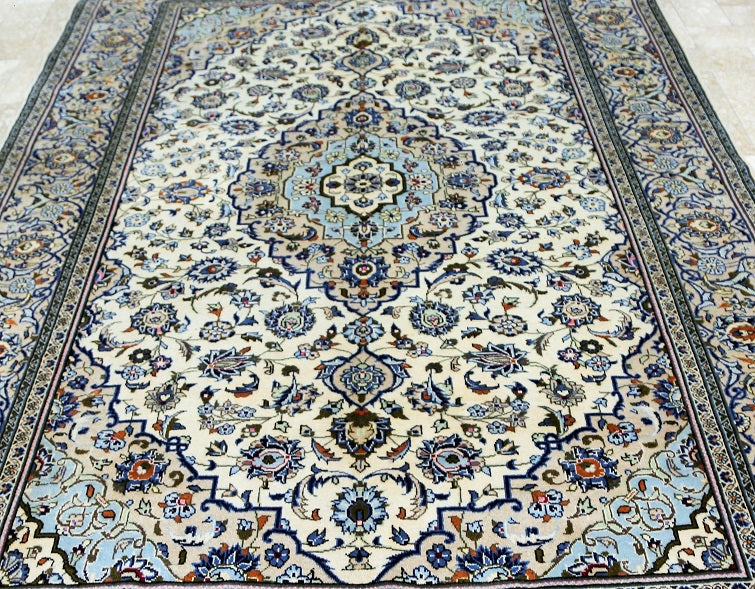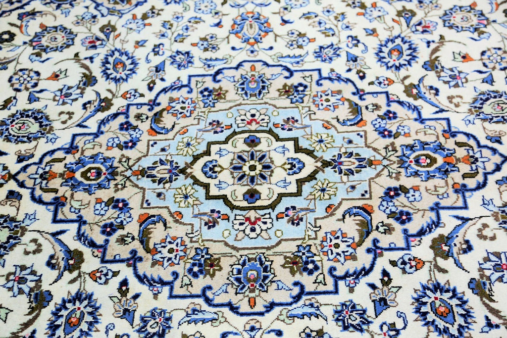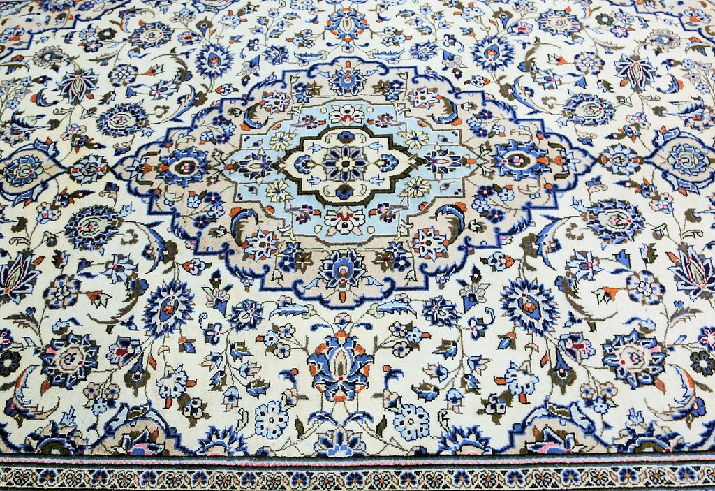 Full Room Size Authentic Persian Kashan Rug. Above All It Is Hard To Weave This Quality Original Handmade Rug In Larger Sizes. Kashan Is A City In Central Persia. This Rug Has A Pure Lamb’s Wool Pile On Cotton Base. Beige And Blue Tone Dyed Using Traditional Methods. Fine Quality Piece That Would Last A Life Time.
