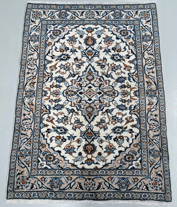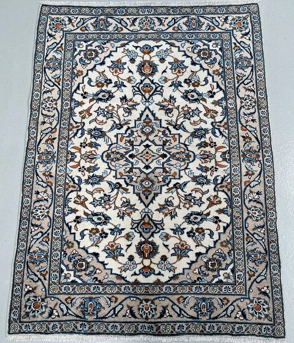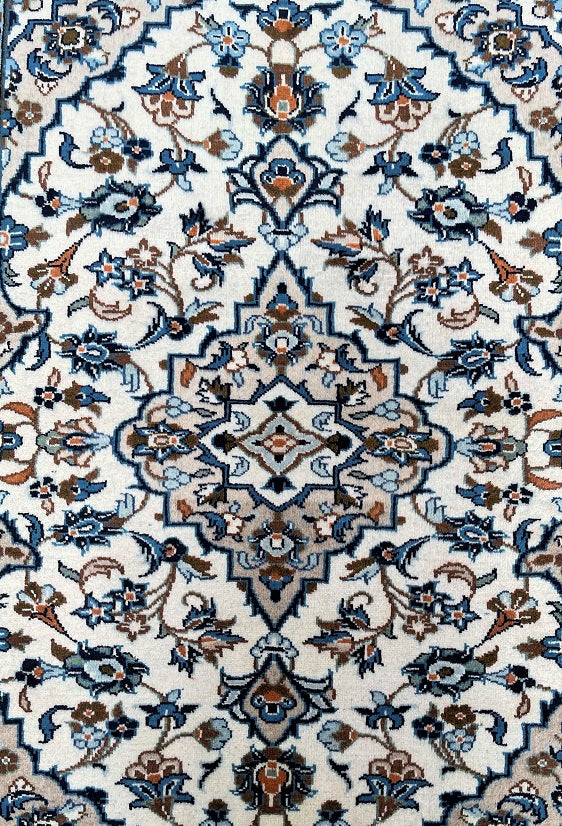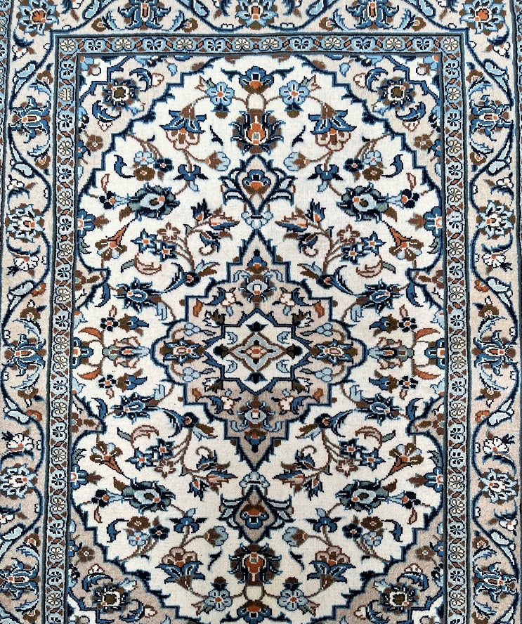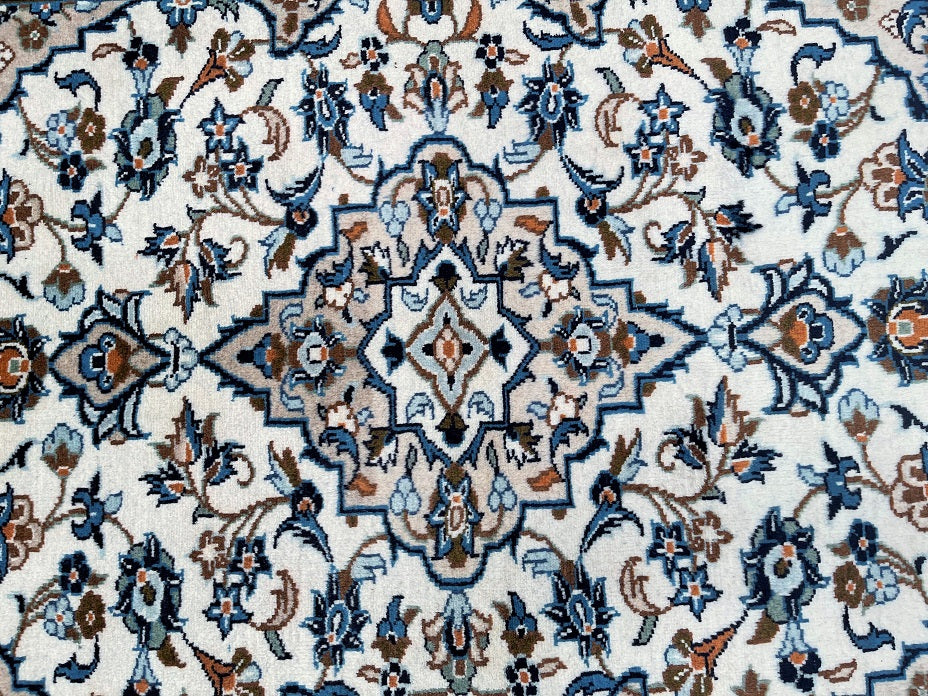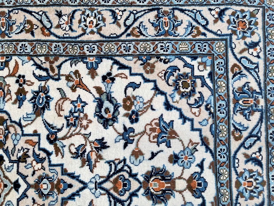 Hard Wearing Coffee Table Size Authentic Handmade Persian Kashan Rug. Above All It Is Pure Lamb’s Wool Pile On Cotton Base. It Also Has Beige, Blue, Orange, Aqua And Brown Tones Dyed Using Traditional Methods.