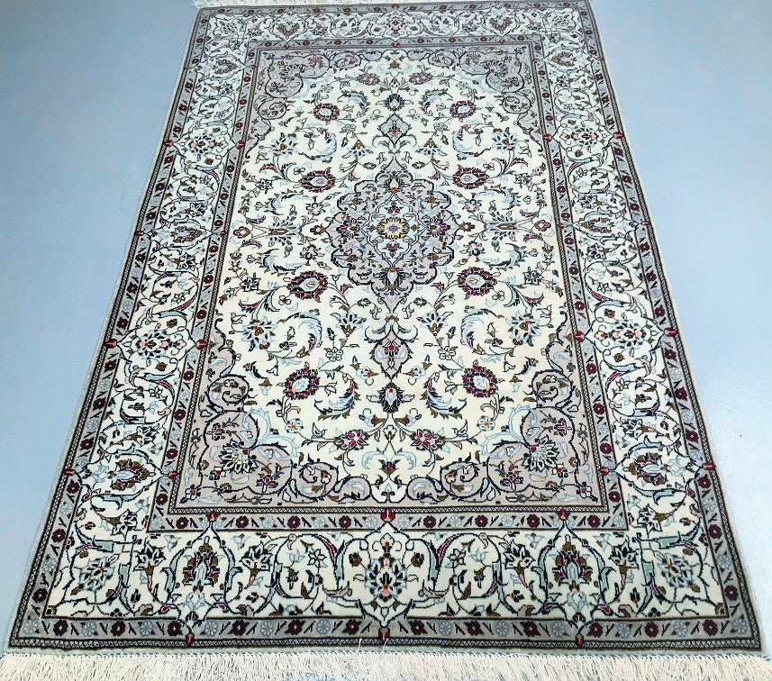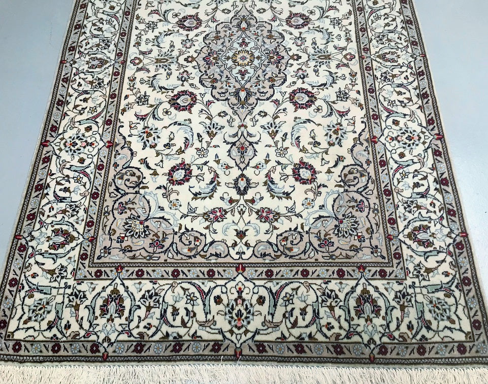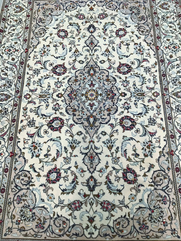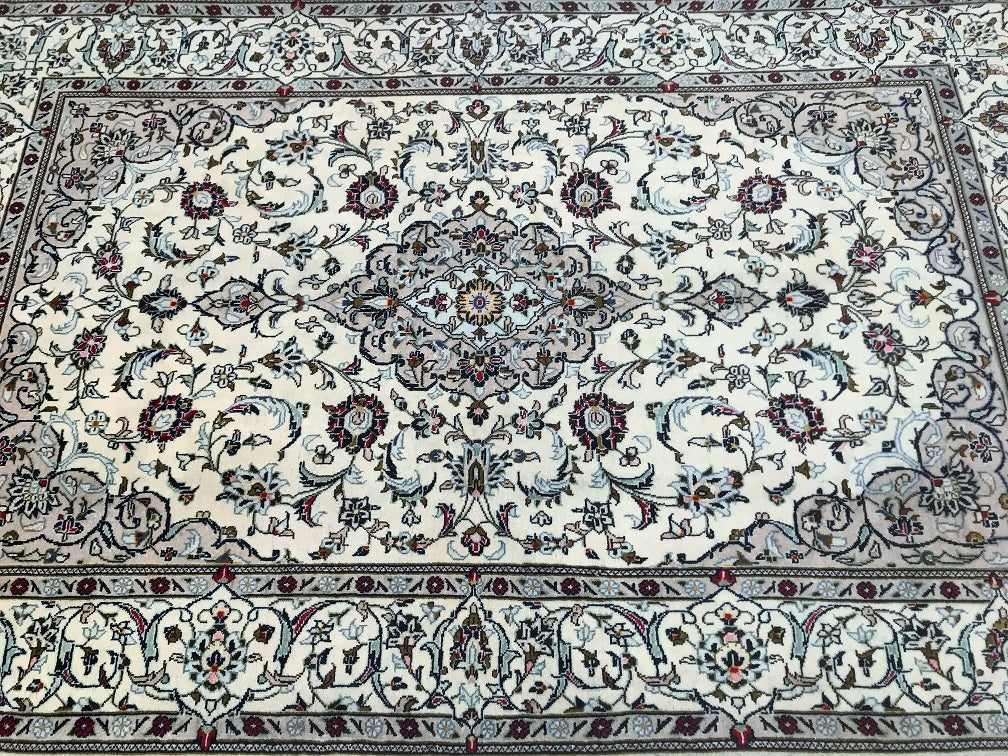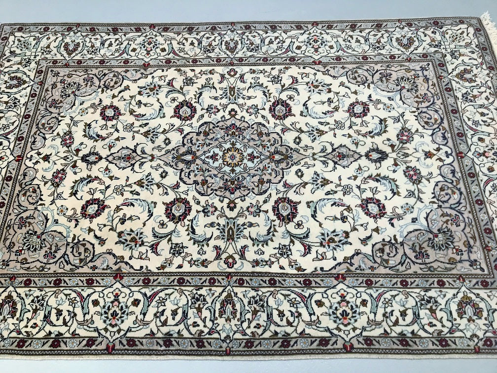 Fine Coffee Table Size Hand Knotted Vintage Persian Kashan Rug. It Has A Pure Lamb’s Wool Pile On Cotton Base. Beige, Blue and Touch Of Red And Light Brown Tone Dyed Using Traditional Methods. Superb Quality Piece That Brings Life To Any Room.