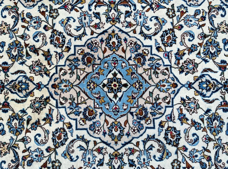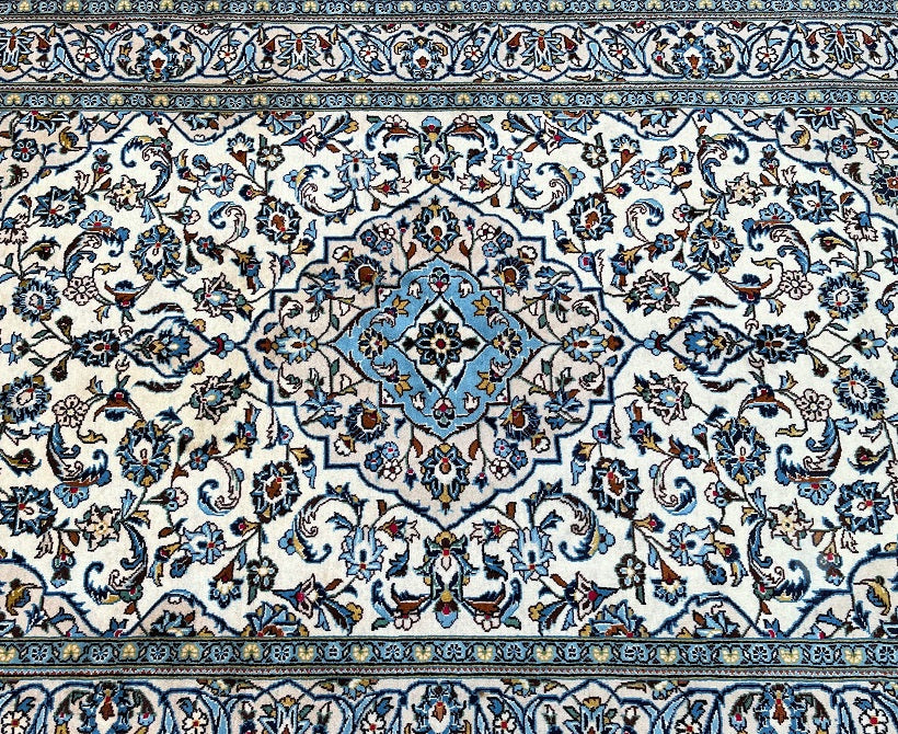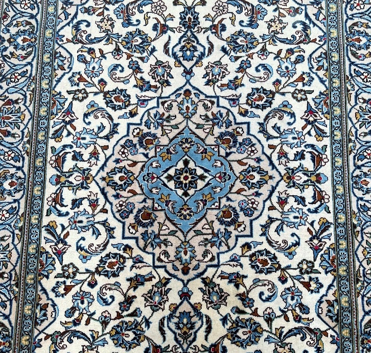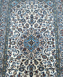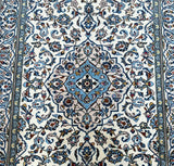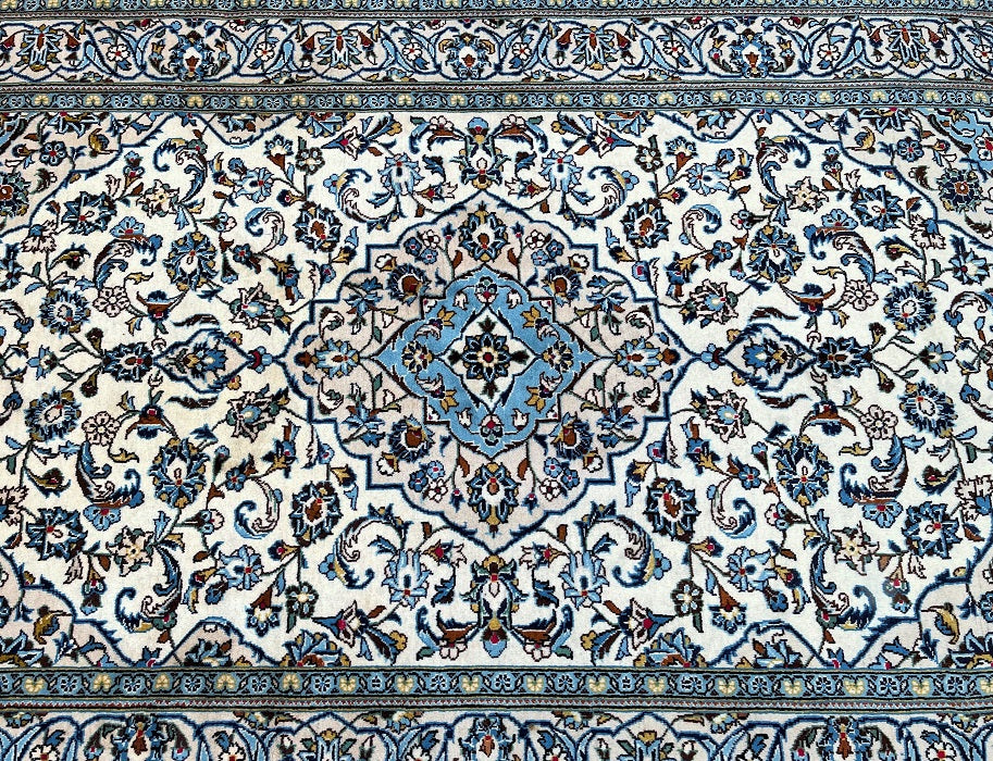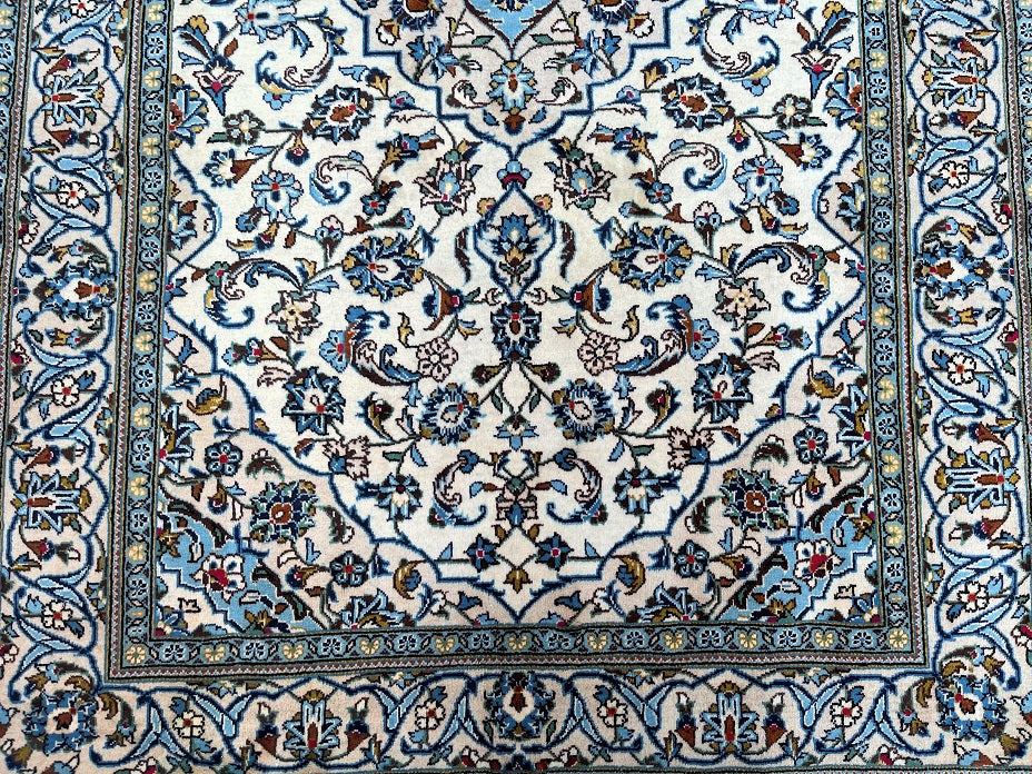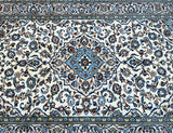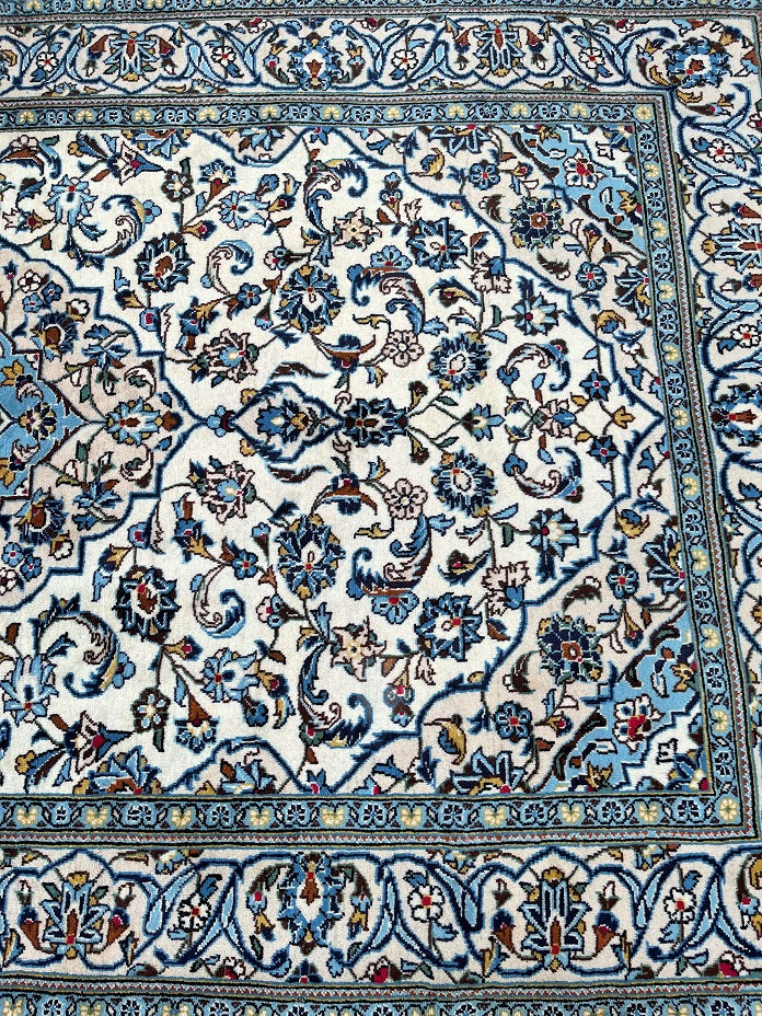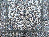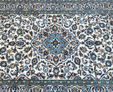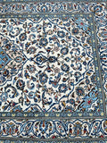 Room Size Authentic Handmade Persian Kashan Rug. It Has A Pure Lamb’s Wool Pile On Cotton Base. Beige, Indigo Blue and Touch Of Brown, Gold, Orange Aqua and Olive Green Tones Dyed Using Traditional Methods.