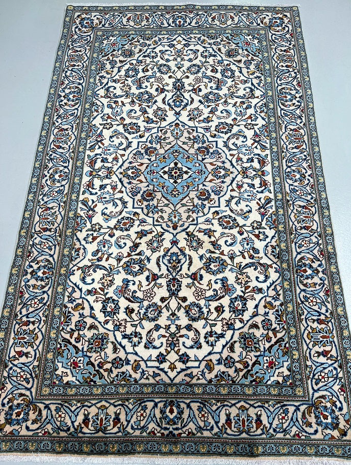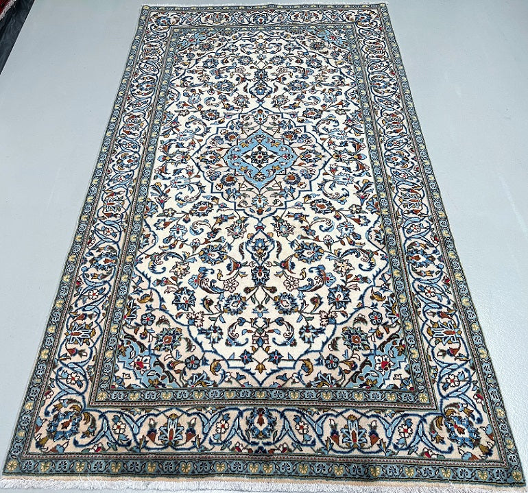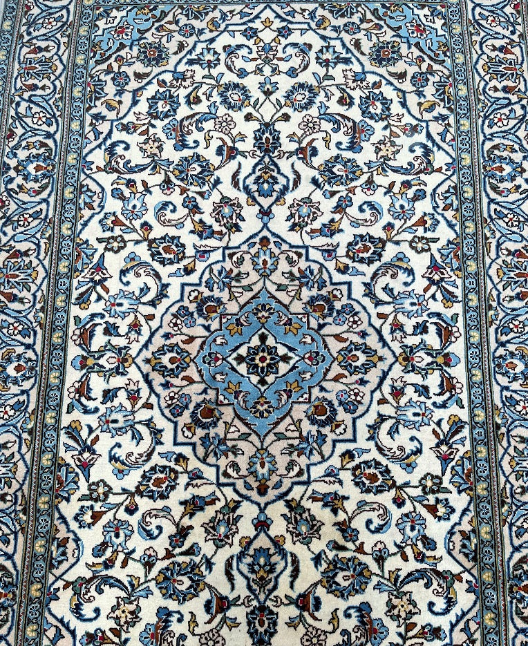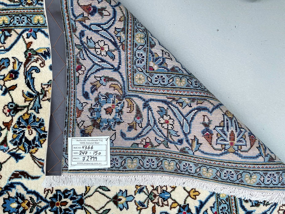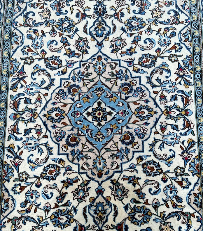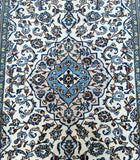 Room Size Authentic Handmade Persian Kashan Rug. It Has A Pure Lamb’s Wool Pile On Cotton Base. Beige, Indigo Blue and Touch Of Brown, Gold, Orange Aqua and Olive Green Tones Dyed Using Traditional Methods.