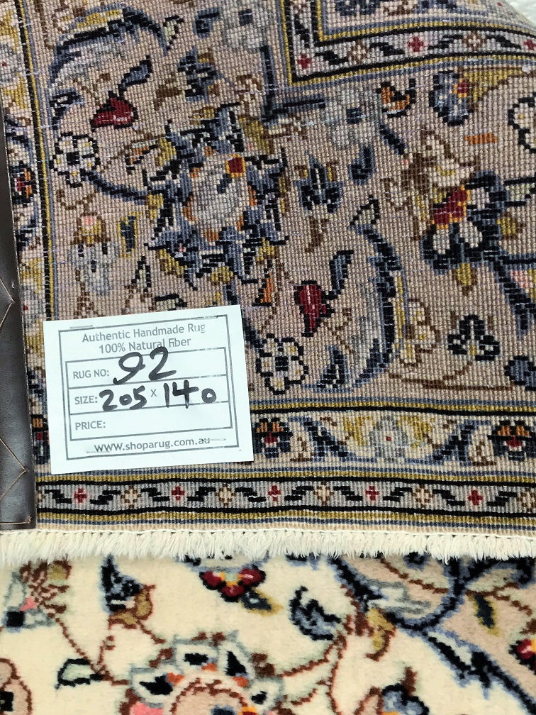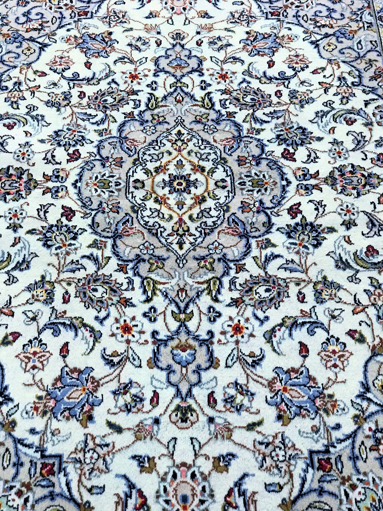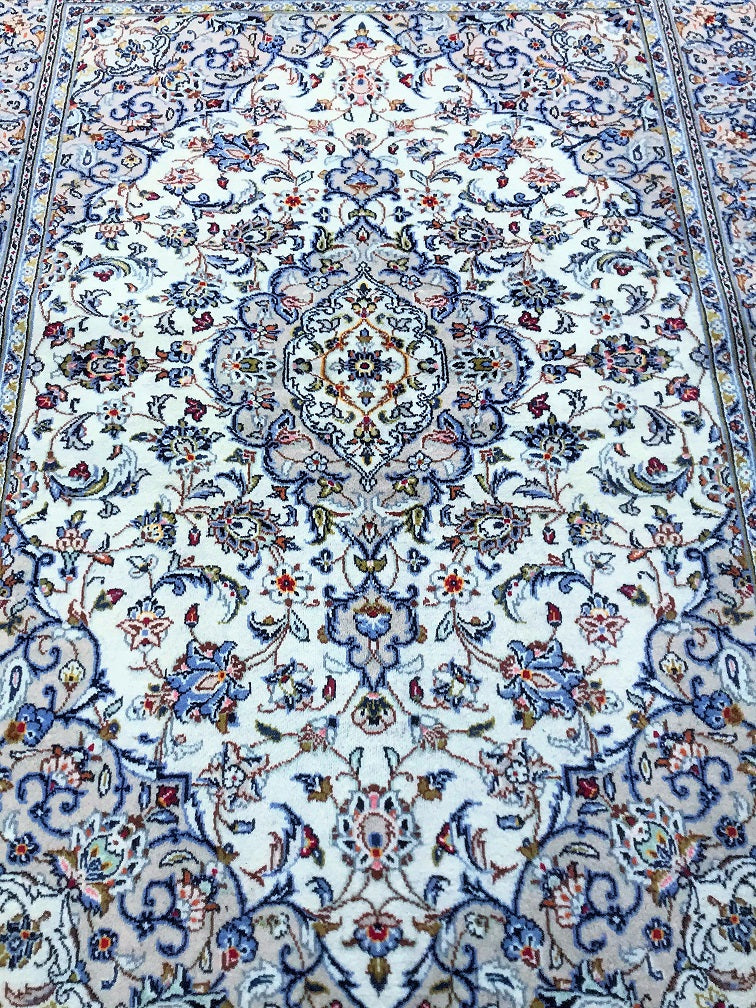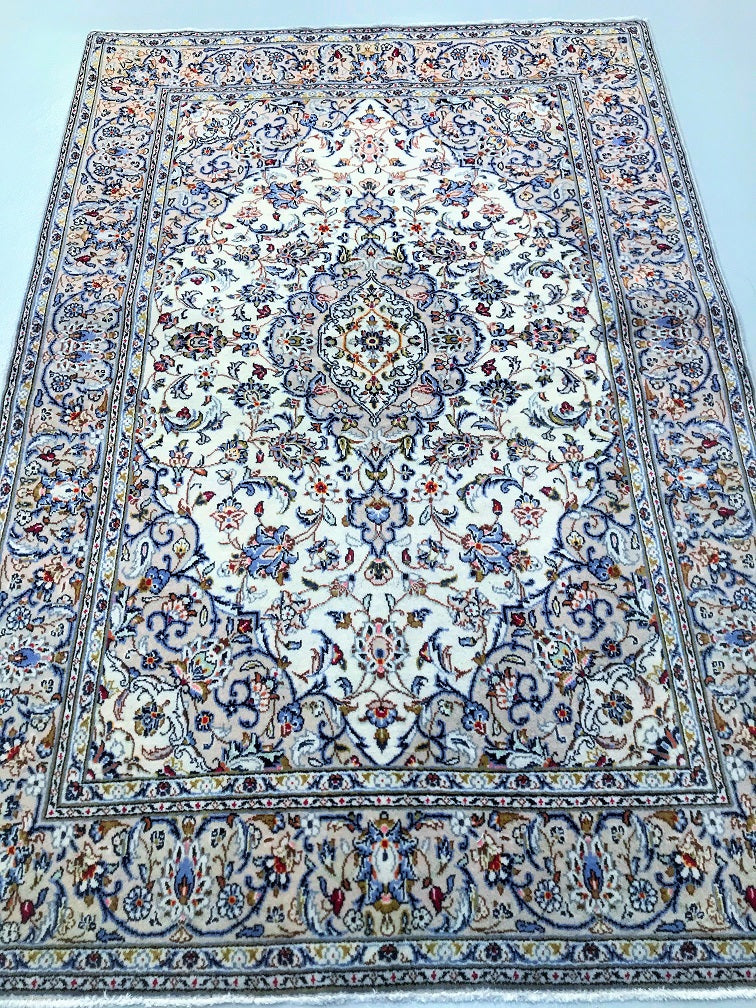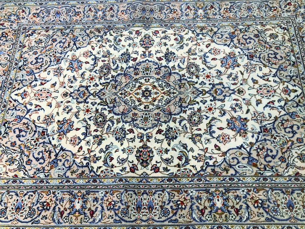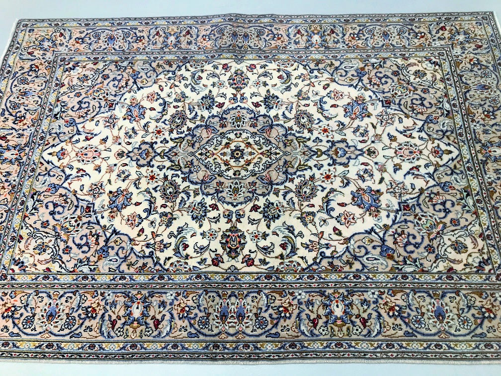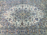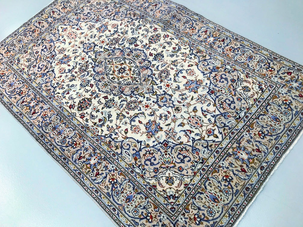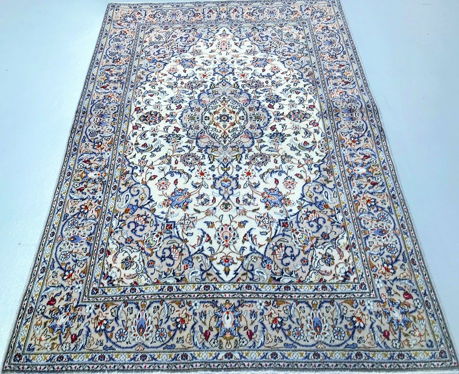Fine Coffee Table Size Hand Knotted Vintage Persian Kashan Rug. It Has A Pure Lamb’s Wool Pile On Cotton Base. Beige, Blue and Touch Of Green And Light Brown Tone Dyed Using Traditional Methods. Superb Quality Piece That Brings Life To Any Room.