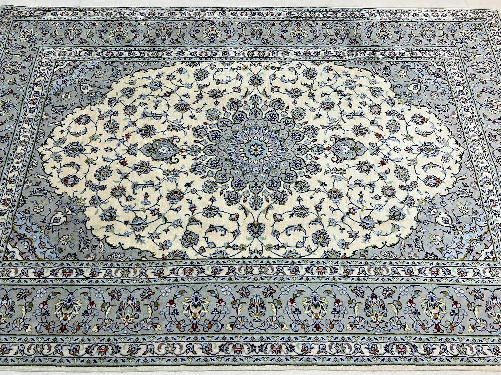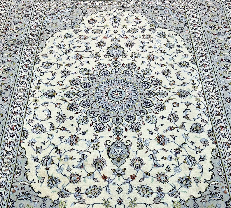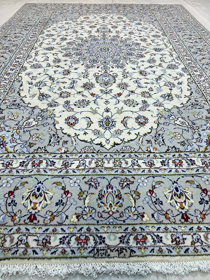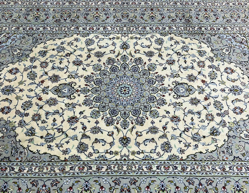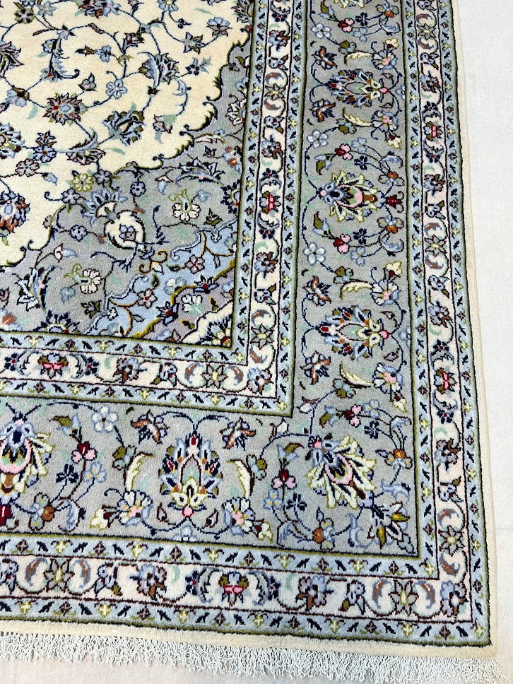 Full Room Size Authentic Handmade Persian Kashan Carpet. Above All It Is Hard To Get This Quality Hand Made Rug In These Colour Tone. It Also Has A Pure Wool Pile On Cotton Base. Beige, Pistachio, Green, Blue With A Touch Of Brown And Pink Tones Dyed Using Traditional Methods.