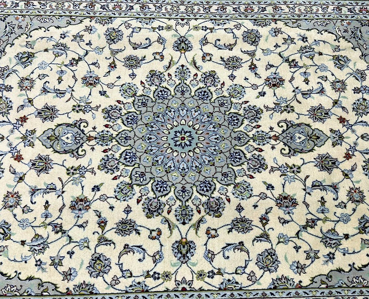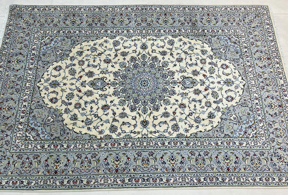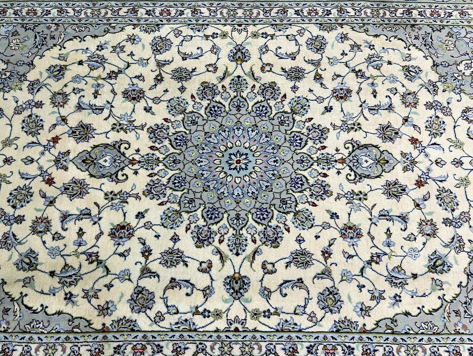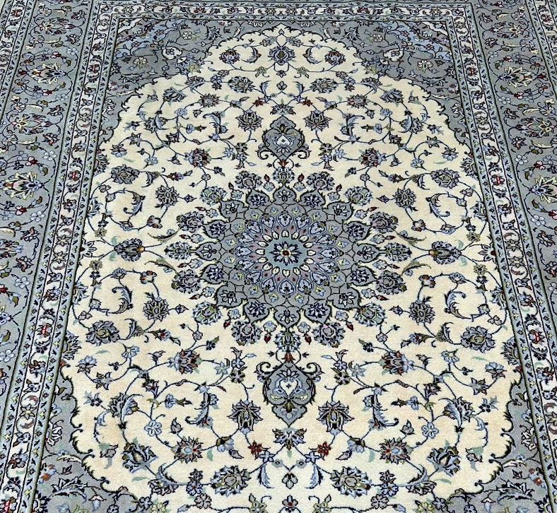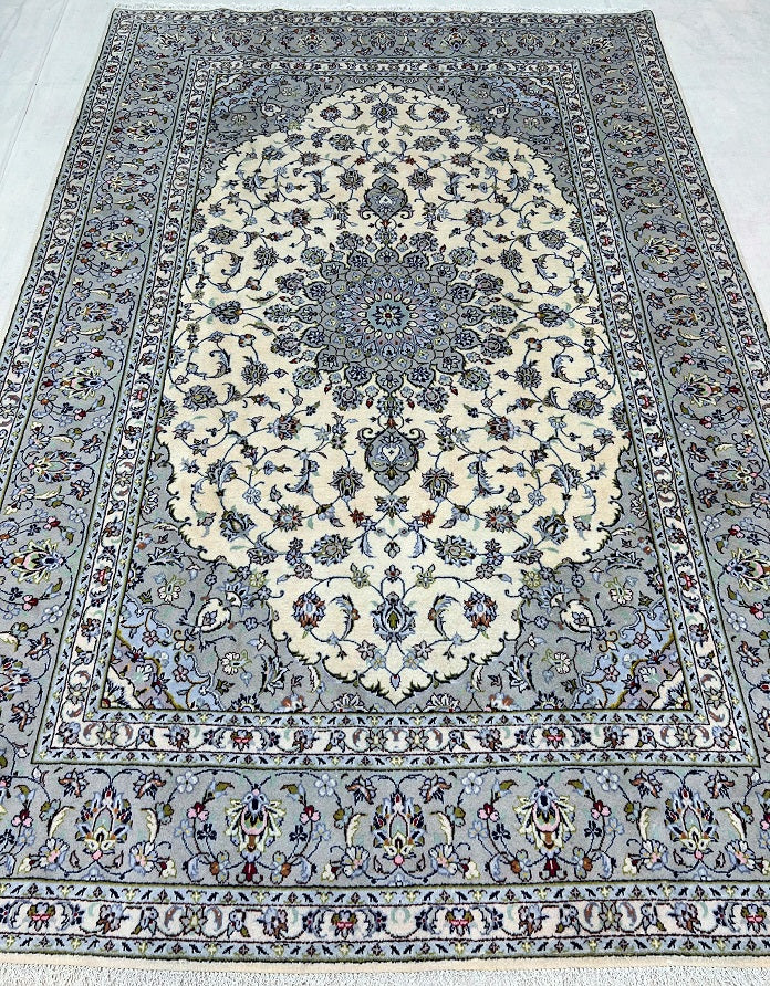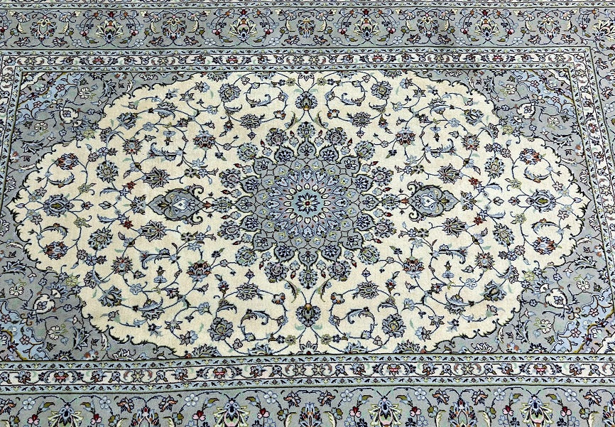 Full Room Size Authentic Handmade Persian Kashan Carpet. Above All It Is Hard To Get This Quality Hand Made Rug In These Colour Tone. It Also Has A Pure Wool Pile On Cotton Base. Beige, Pistachio, Green, Blue With A Touch Of Brown And Pink Tones Dyed Using Traditional Methods.