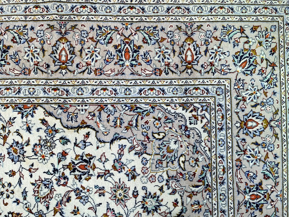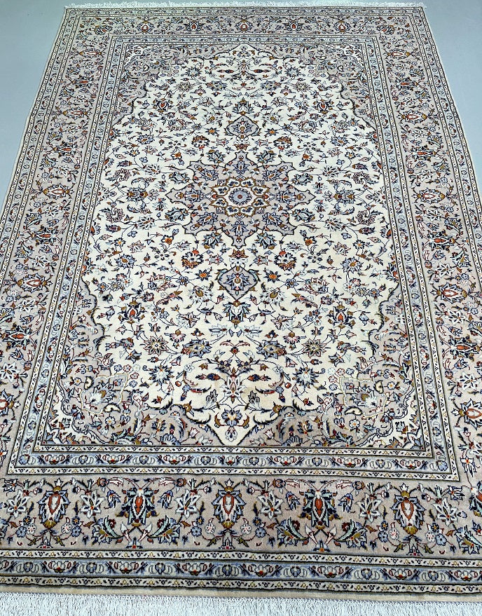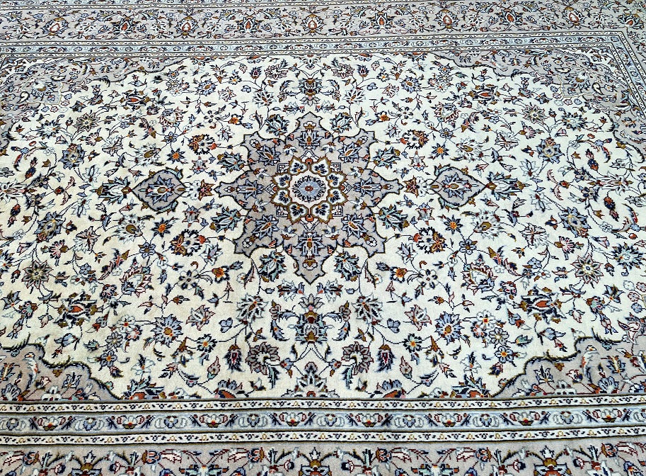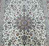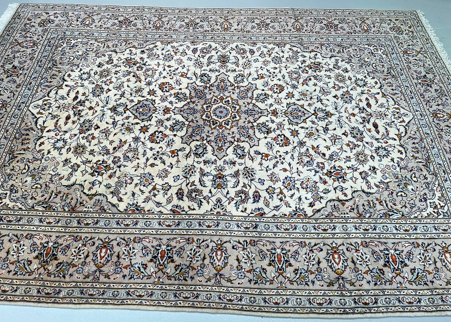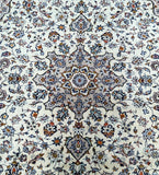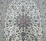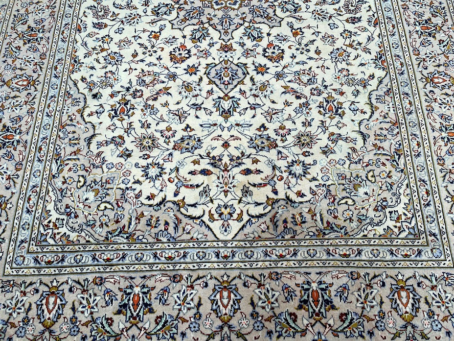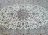 Full Room Size Authentic Handmade Kashan Rug. Above All It Is A Hard Wearing Rug Ideal For Every Day Usage. It Also Has A Pure Wool Pile On Cotton Base. Gorgeous Beige, Blue, Brown, Orange And Mustard Green Tones Dyed Using Traditional Methods.
