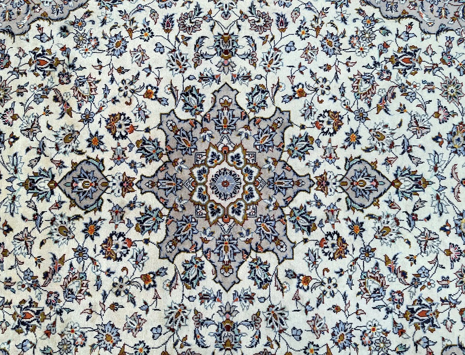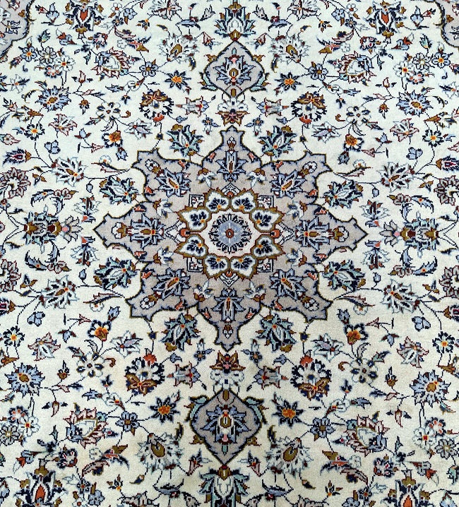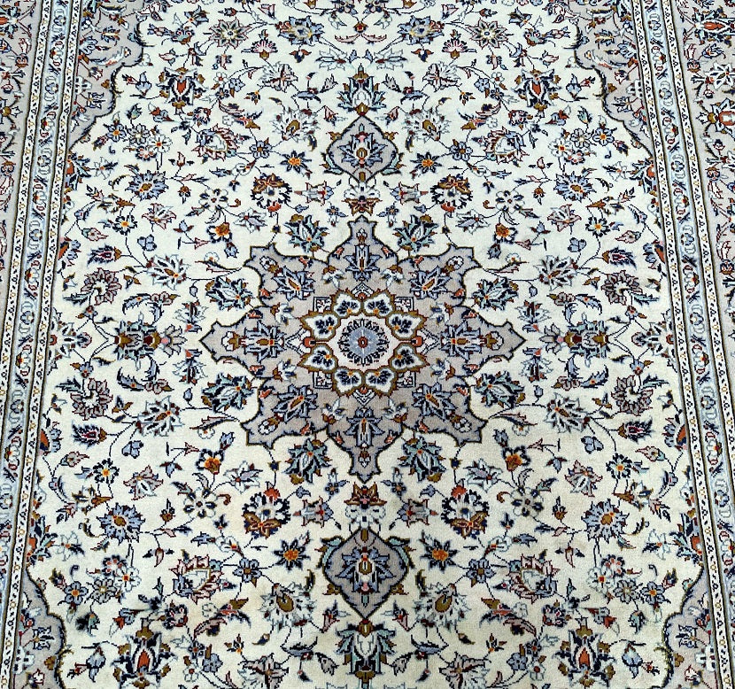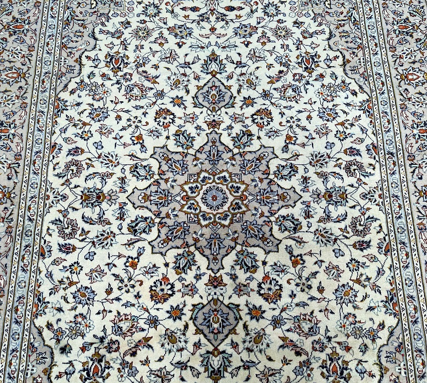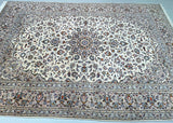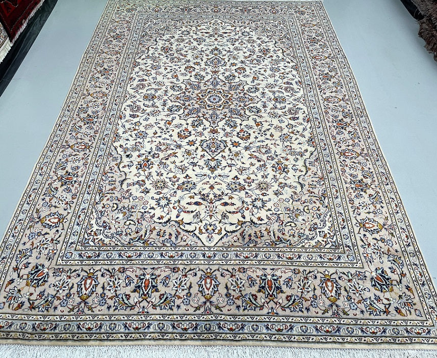 Full Room Size Authentic Handmade Kashan Rug. Above All It Is A Hard Wearing Rug Ideal For Every Day Usage. It Also Has A Pure Wool Pile On Cotton Base. Gorgeous Beige, Blue, Brown, Orange And Mustard Green Tones Dyed Using Traditional Methods.