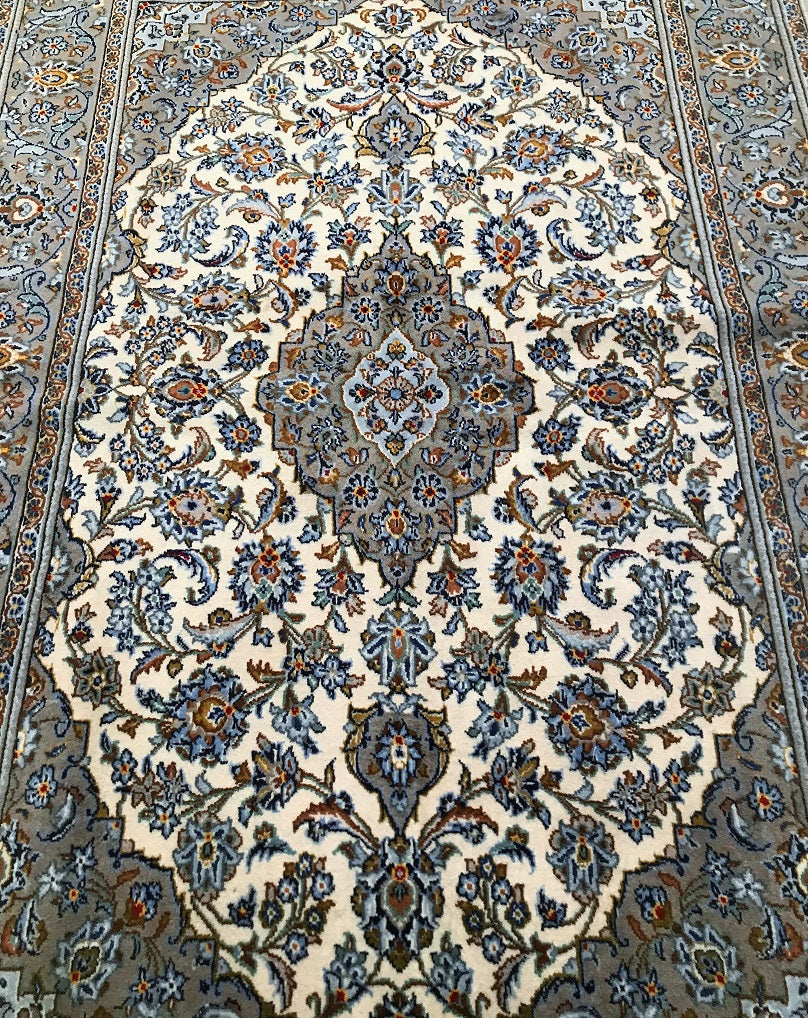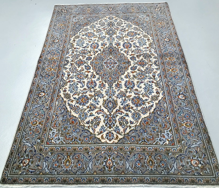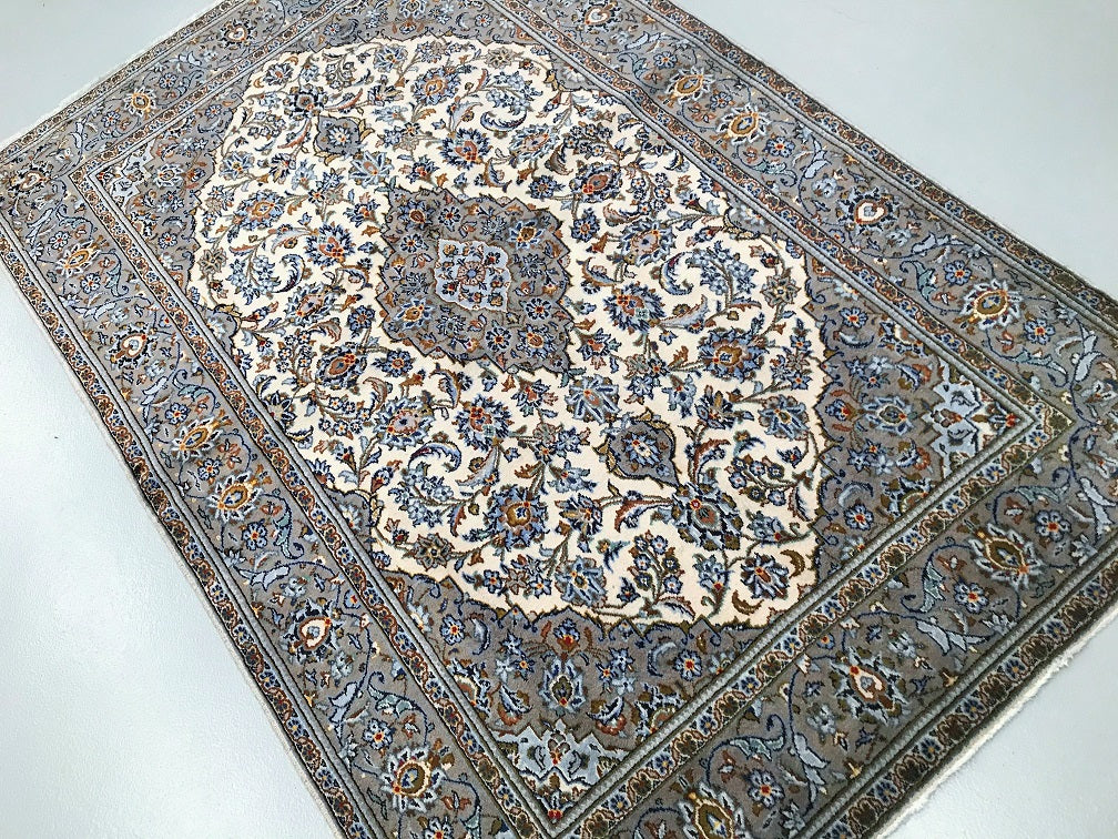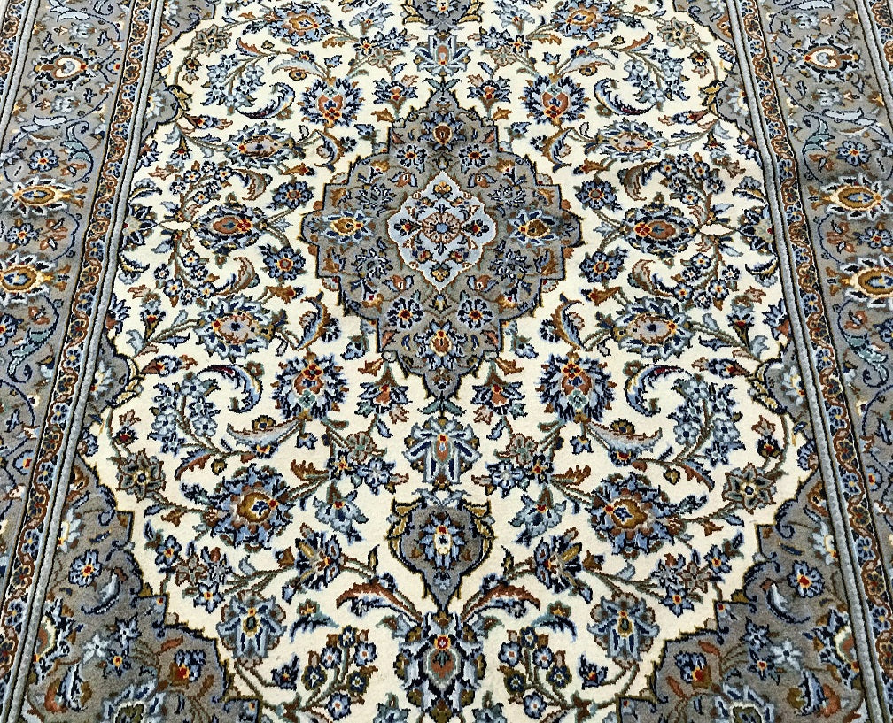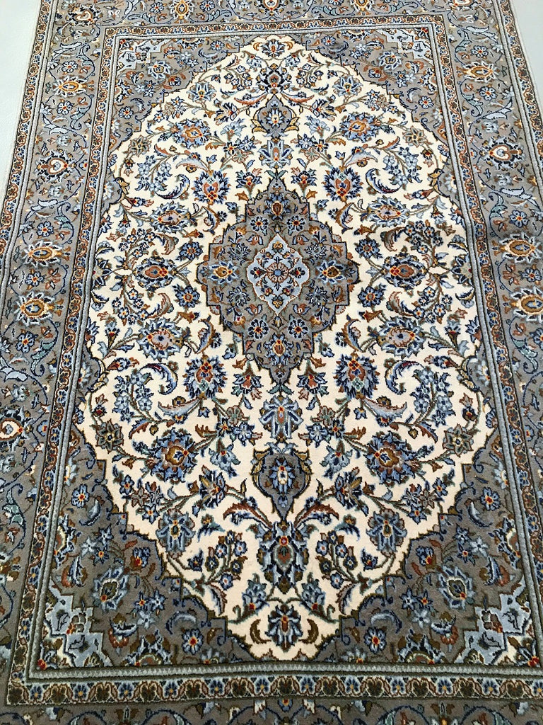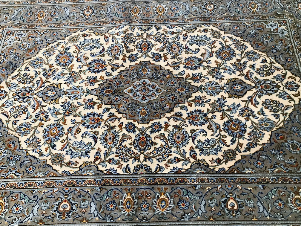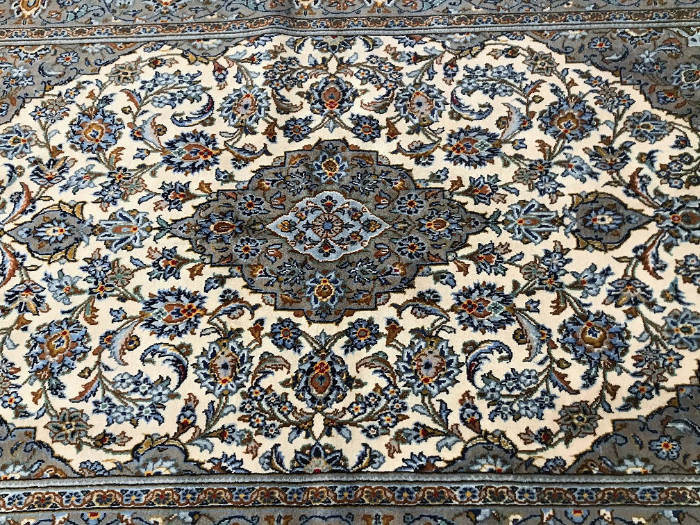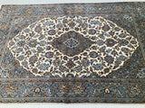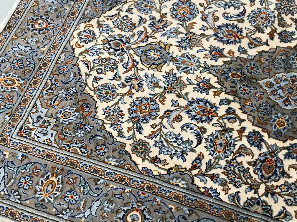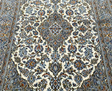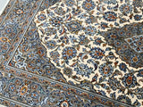 Fine Coffee Table Size Authentic Hand Knotted Persian Kashan Rug. It Has A Pure Lamb’s Wool Pile On Cotton Base. Beige, Pistachio, Burnt Orange, Indigo Blue and Touch Of Aqua and Brown Tone Dyed Using Traditional Methods.