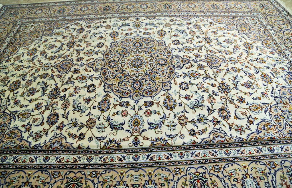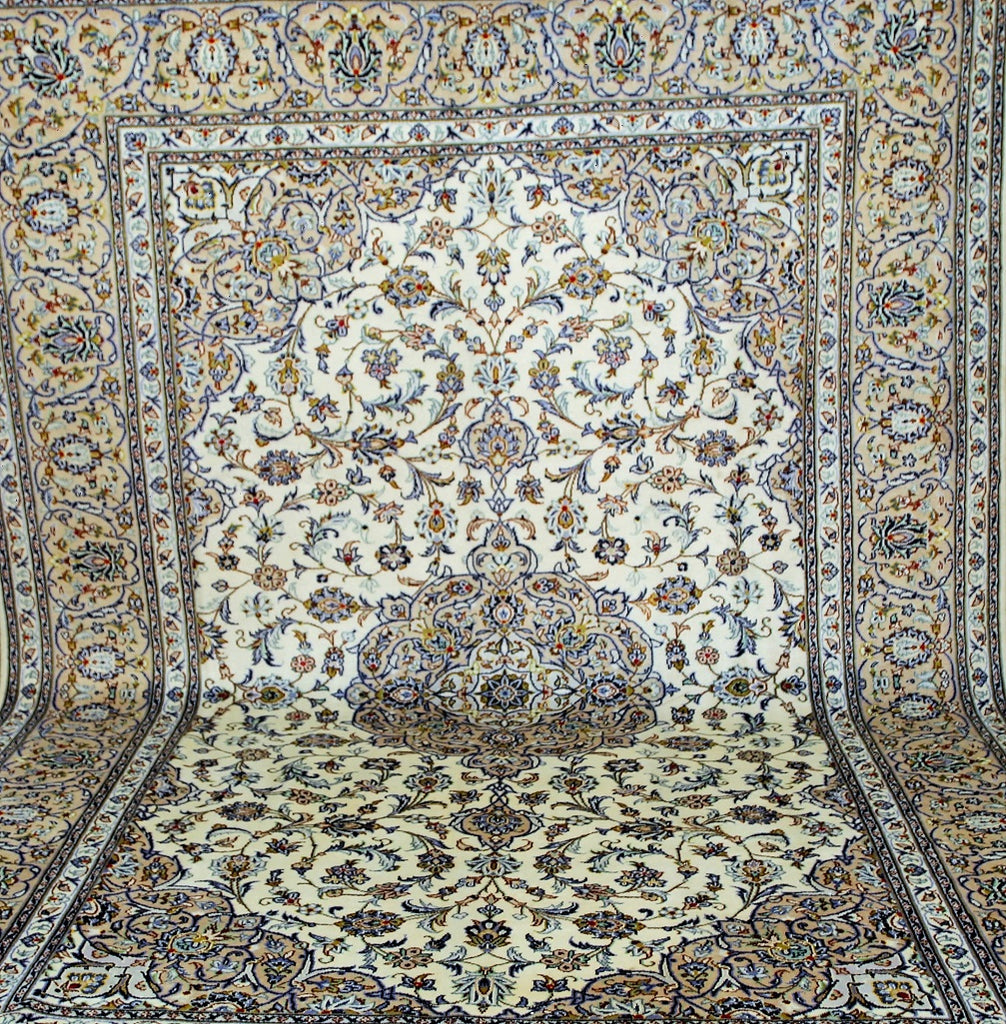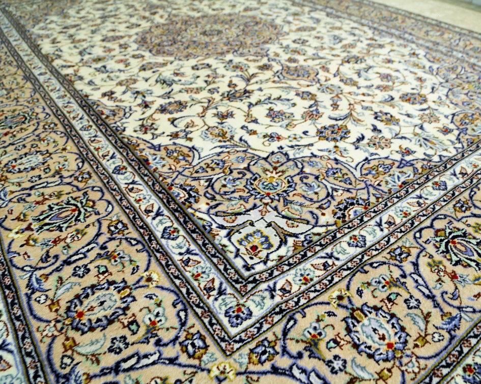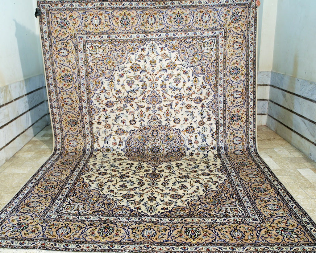 Large Room Size Authentic Persian Beige Kashan Rug. Above All It Is Hard To Weave This Quality Hand Made Rug In Larger Sizes. Kashan Is A City In Central Persia. It Is Renowned To Produce Some Of The Best Quality Wool Rugs And It Is Popular Among Persians. This Rug Has A Pure Lamb’s Wool Pile On Cotton Base. Beige, Blue Tones Dyed Using Traditional Methods. Dense Quality Piece That Would Last A Life Time.