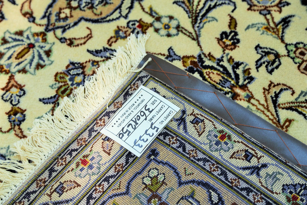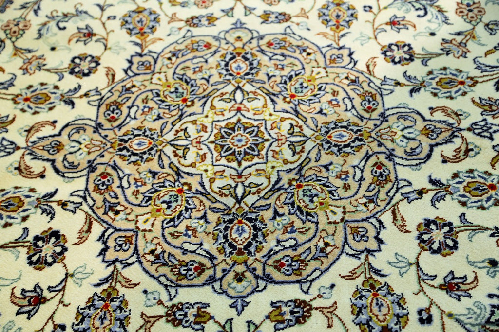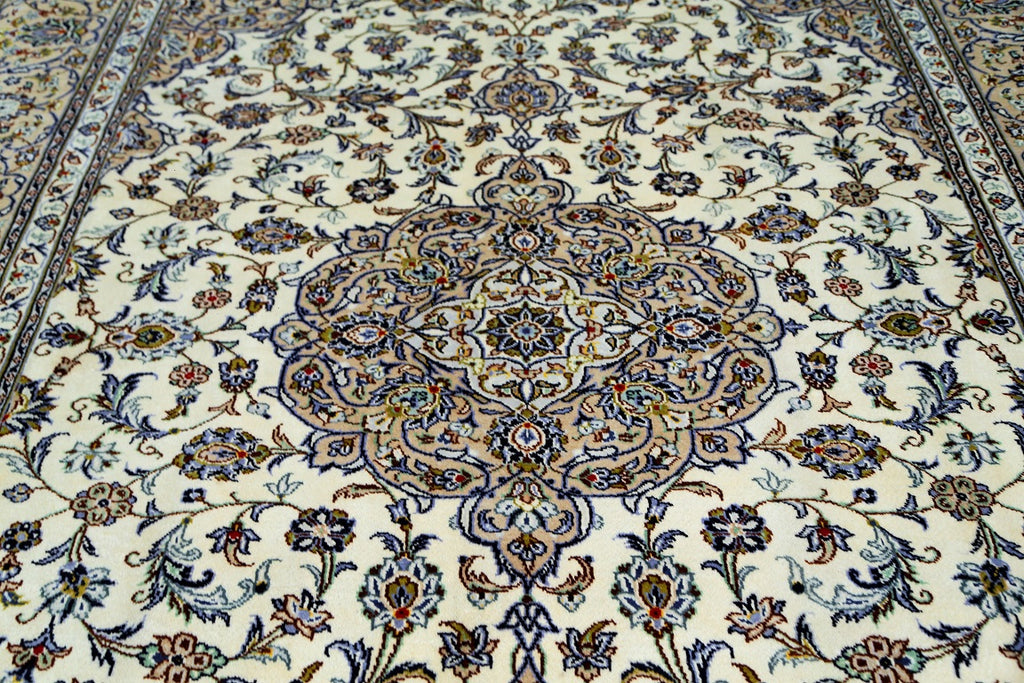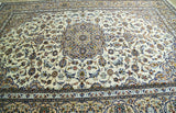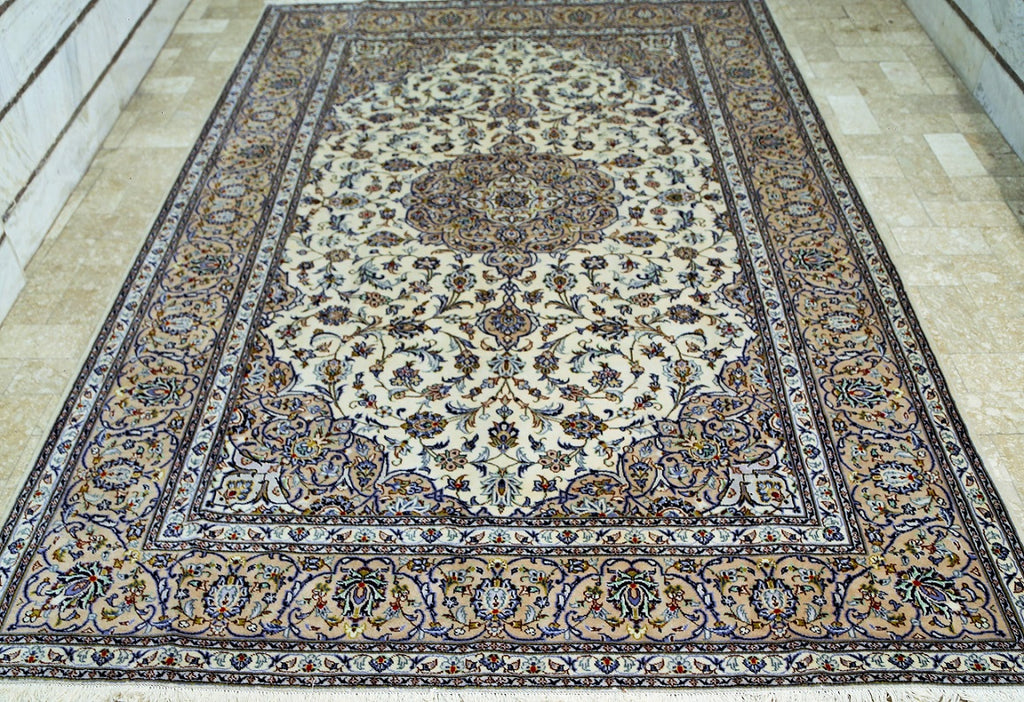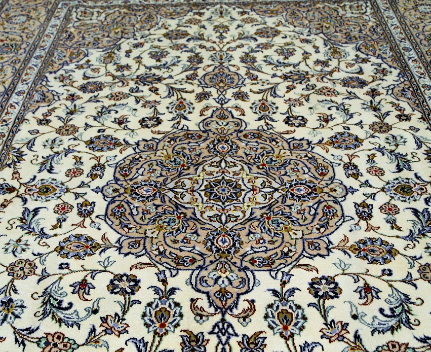 Large Room Size Authentic Persian Beige Kashan Rug. Above All It Is Hard To Weave This Quality Hand Made Rug In Larger Sizes. Kashan Is A City In Central Persia. It Is Renowned To Produce Some Of The Best Quality Wool Rugs And It Is Popular Among Persians. This Rug Has A Pure Lamb’s Wool Pile On Cotton Base. Beige, Blue Tones Dyed Using Traditional Methods. Dense Quality Piece That Would Last A Life Time.
