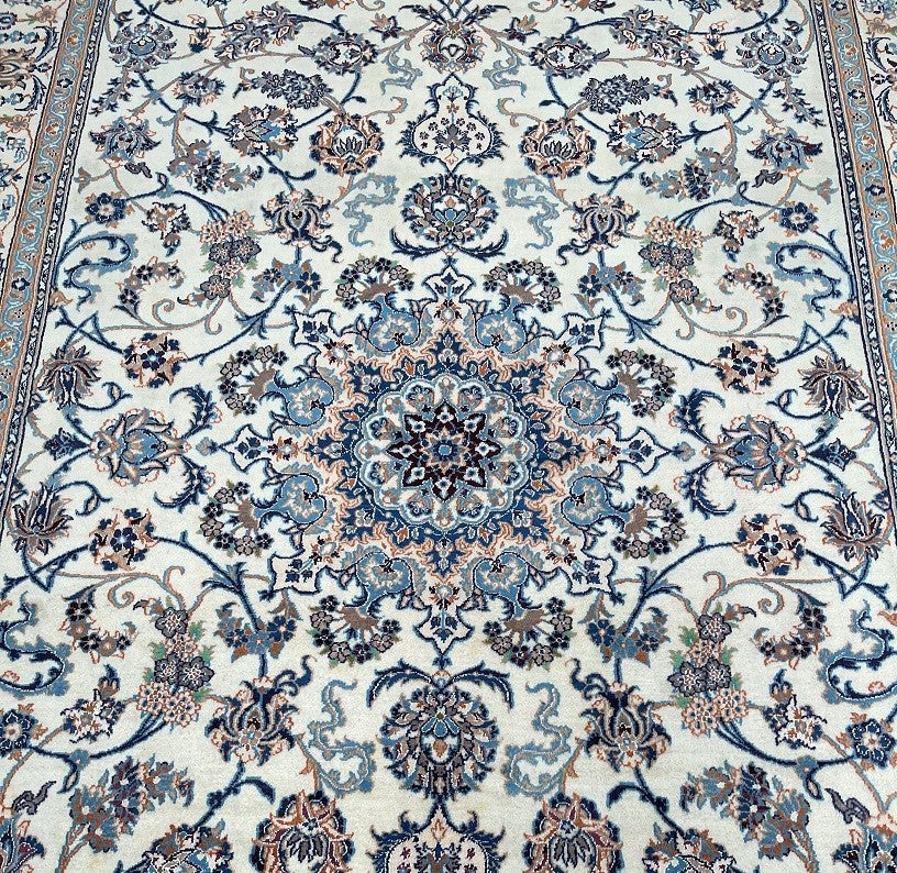 Full Room Size Authentic Beige Tone Persian Nain Rug. Above All It Is Hard To Get This Quality Hand Made Rug In Larger Sizes. Lamb’s Wool And Silk-inlaid On Pile Cotton Base. Beige And Blue Tone Dyed Using Traditional Methods. Dense Quality Rug Ideal For Every Day Usage.