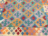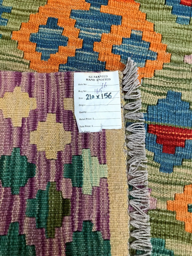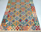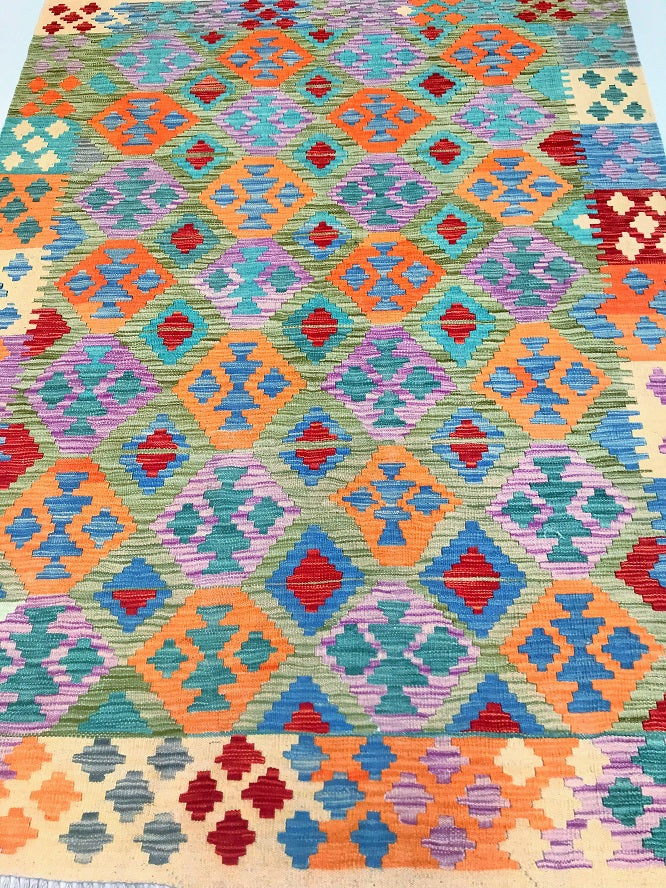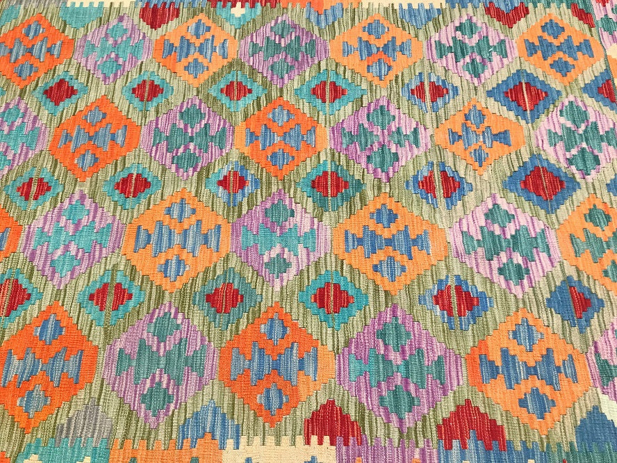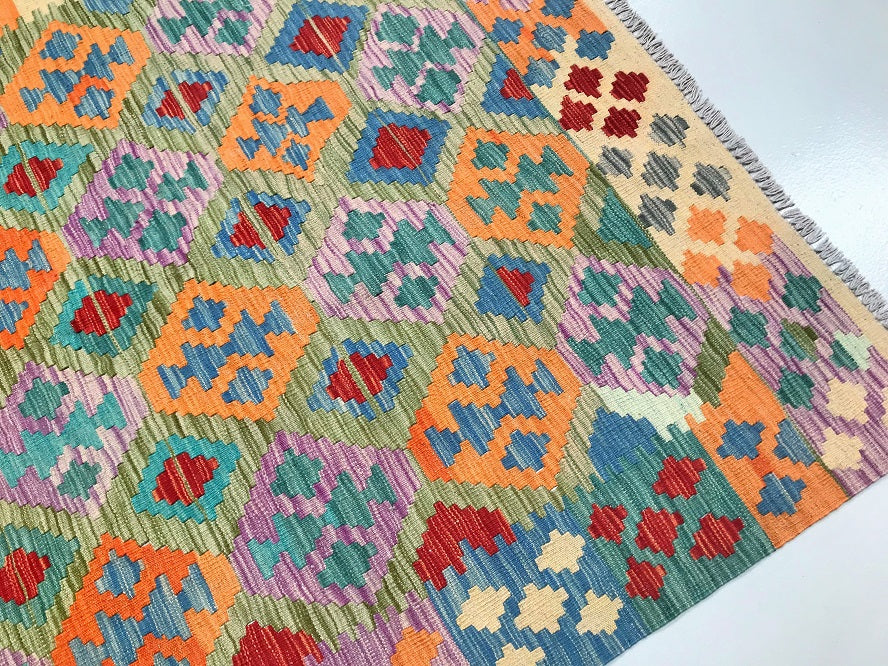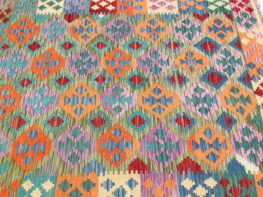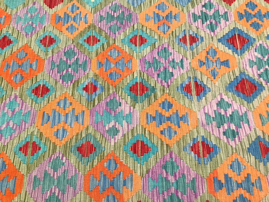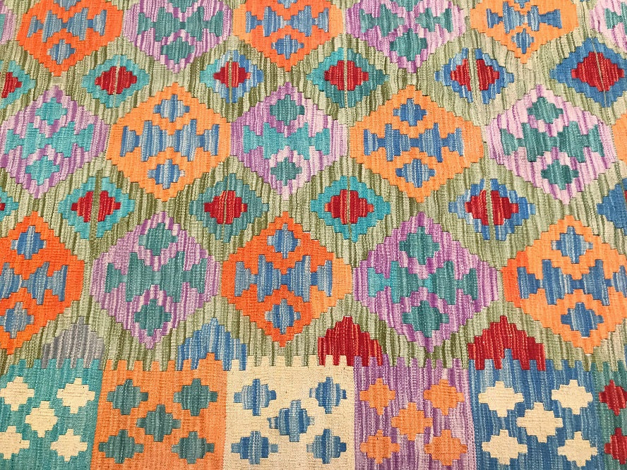 Boho Hand Woven Afghan Kyber Kilim Rug. Above All It Has A Pure Hand Spun Wool Pile On Wool Base. Green, Burnt Orange And Blue Tone Dyed Using Vegetable Roots.