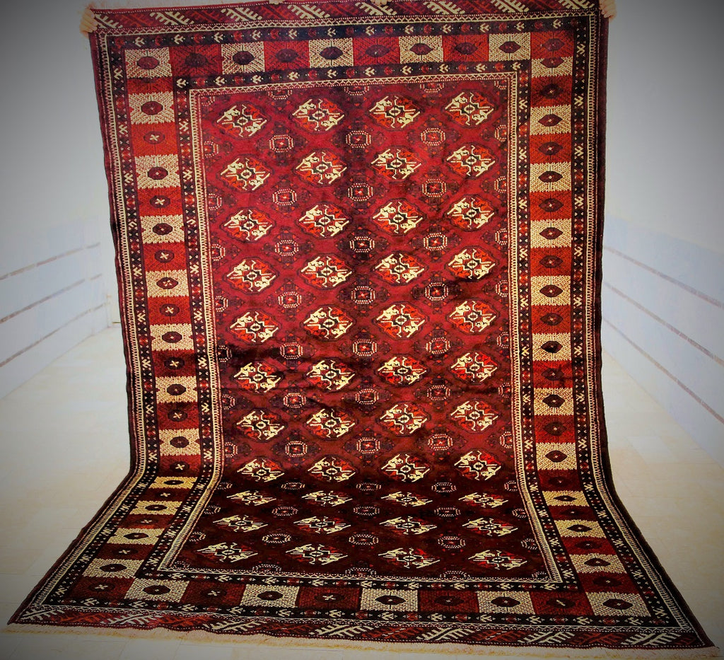 Unique Full Room Size Hand Knotted Persian Turkoman Rug. It Is Pure Hand Spun Wool Pile On Wool Base. It Also Has A Dark Brown Tone Dyed Using Traditional Methods.