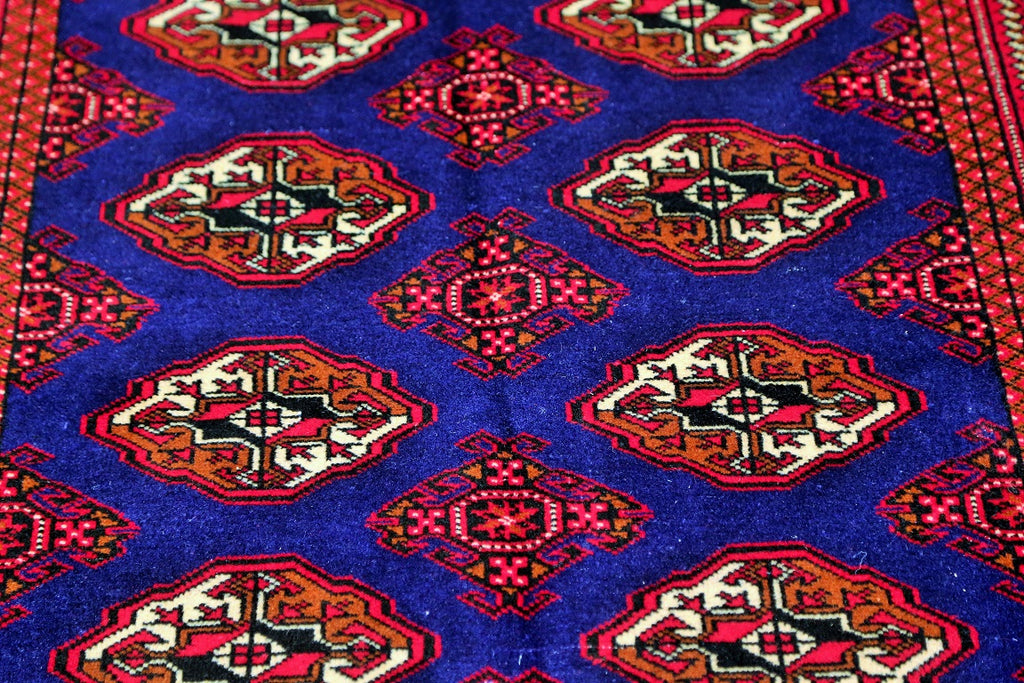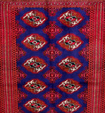 Hand Knotted Tribal Bokhara Turkoman Rug. Above All It Is Pure Hand Spun Wool Pile On Wool Base. It Also Has Rare Indigo Blue And Red Tone Dyed Using Traditional Methods.