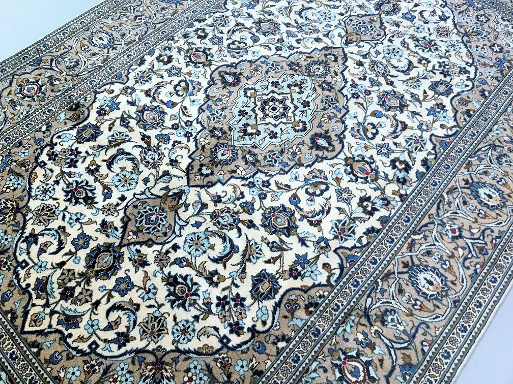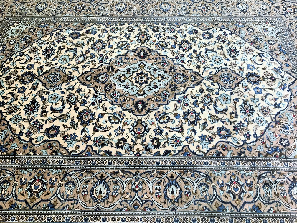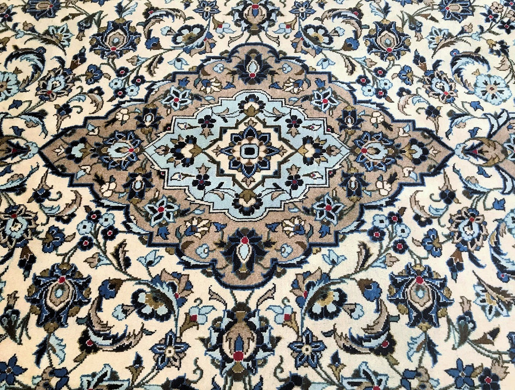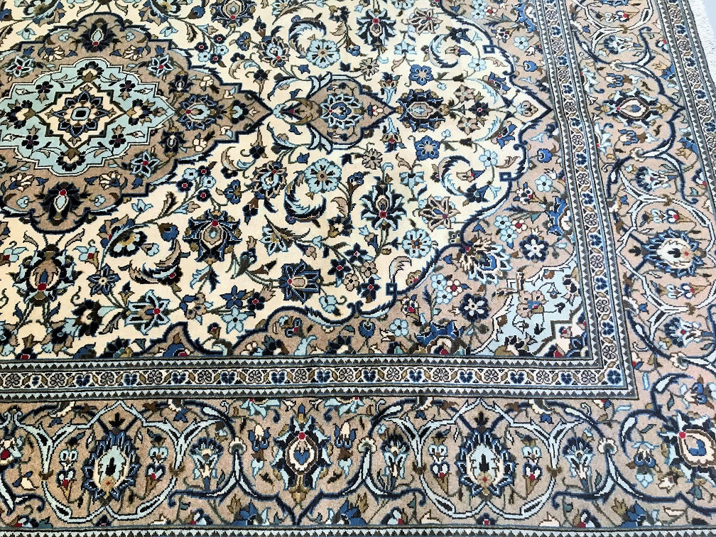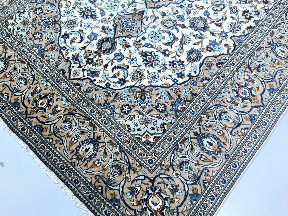 Full Room Size Authentic Persian Kashan Carpet. Persian Rugs Are Also Known As Oriental Carpets In The Western World. Above All It Is Hard To Get This Quality Original Handmade Rug In Larger Sizes. It Also Has Pure Lamb’s Pile On Cotton Base. Gorgeous Beige, Grey, Blue and Light Brown Tone Dyed Using Traditional Methods.