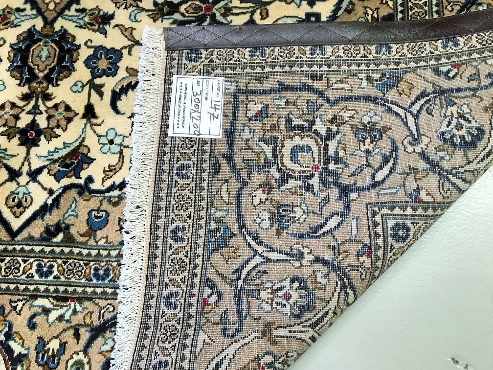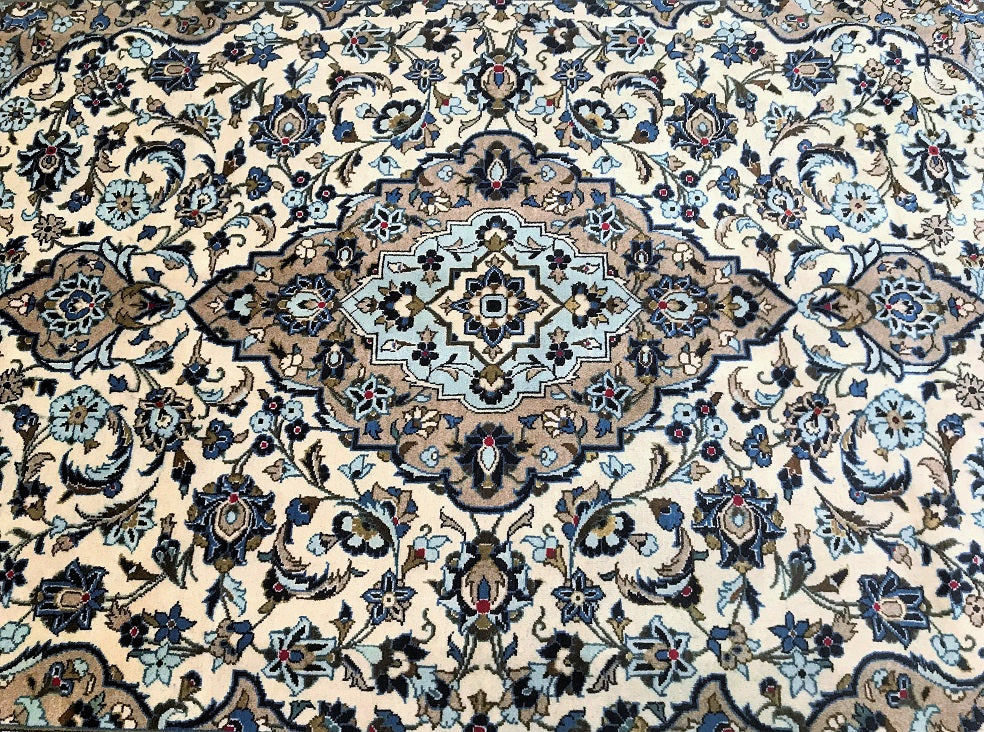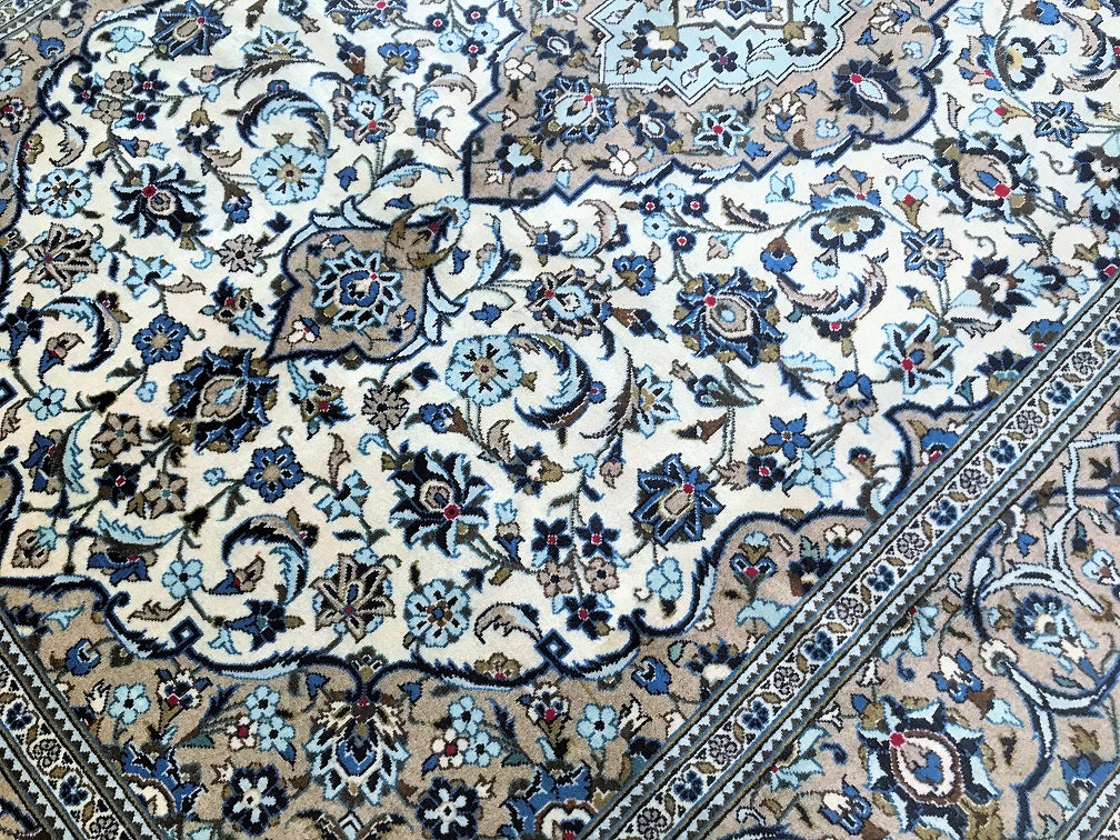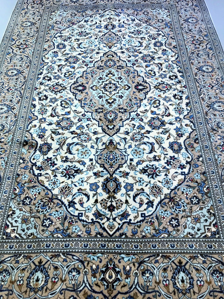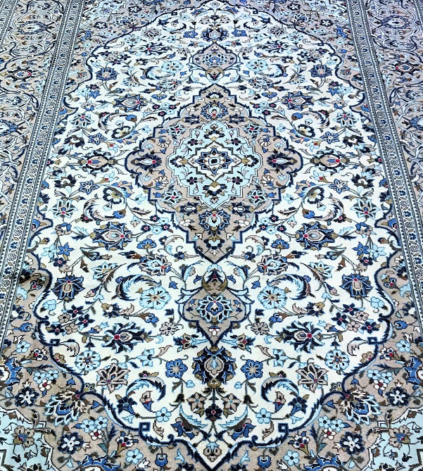 Full Room Size Authentic Persian Kashan Carpet. Persian Rugs Are Also Known As Oriental Carpets In The Western World. Above All It Is Hard To Get This Quality Original Handmade Rug In Larger Sizes. It Also Has Pure Lamb’s Pile On Cotton Base. Gorgeous Beige, Grey, Blue and Light Brown Tone Dyed Using Traditional Methods.