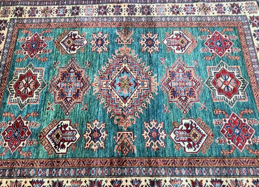 Coffee Table Size Hand Knotted Afghan Super Kazak Rug. Above All This Quality of Kazak Rugs Are Rare And Are Made Using Merino Wool Pile on Cotton Base. Emerald Green Tone Dyed Using Traditional Methods (Vegetable Dyes). Last of True Woven Nomadic Art.