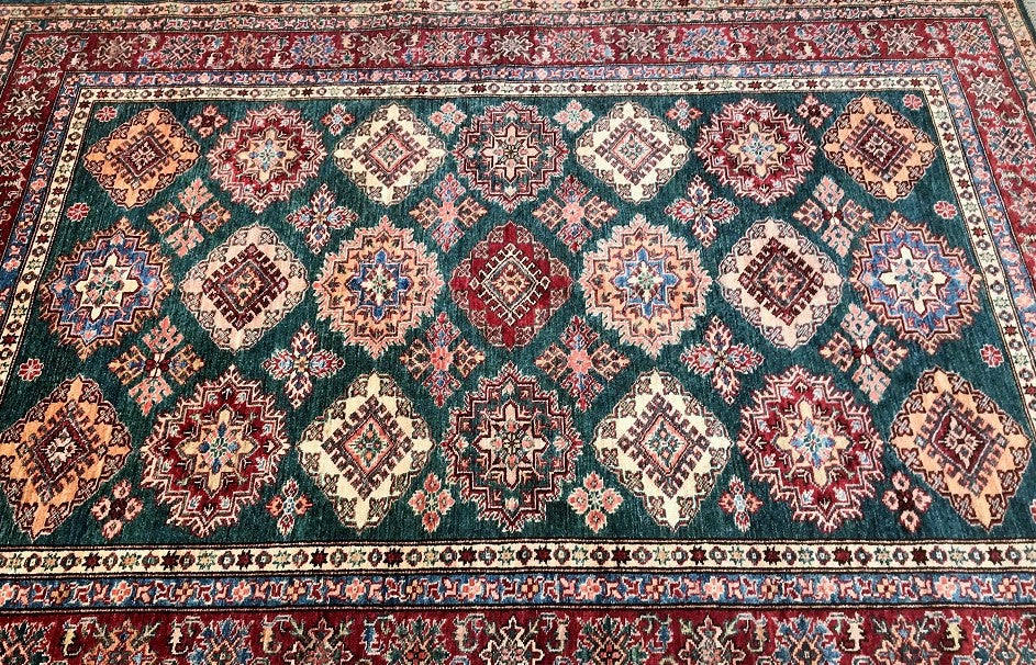Free Shipping Australia Wide Offered! Certified Handmade Afghan Rug 242x175cm  Decorative Room Size Hand Knotted Afghan Super Kazak Rug. Above All This Quality of Kazak Rugs Are Rare And Are Made Using Merino Wool Pile on Cotton Base. Emerald Gree...
