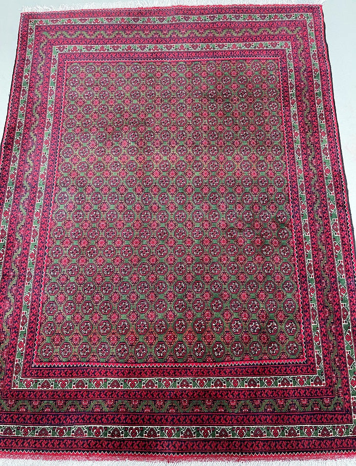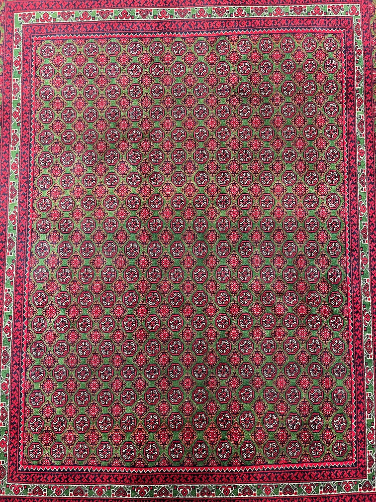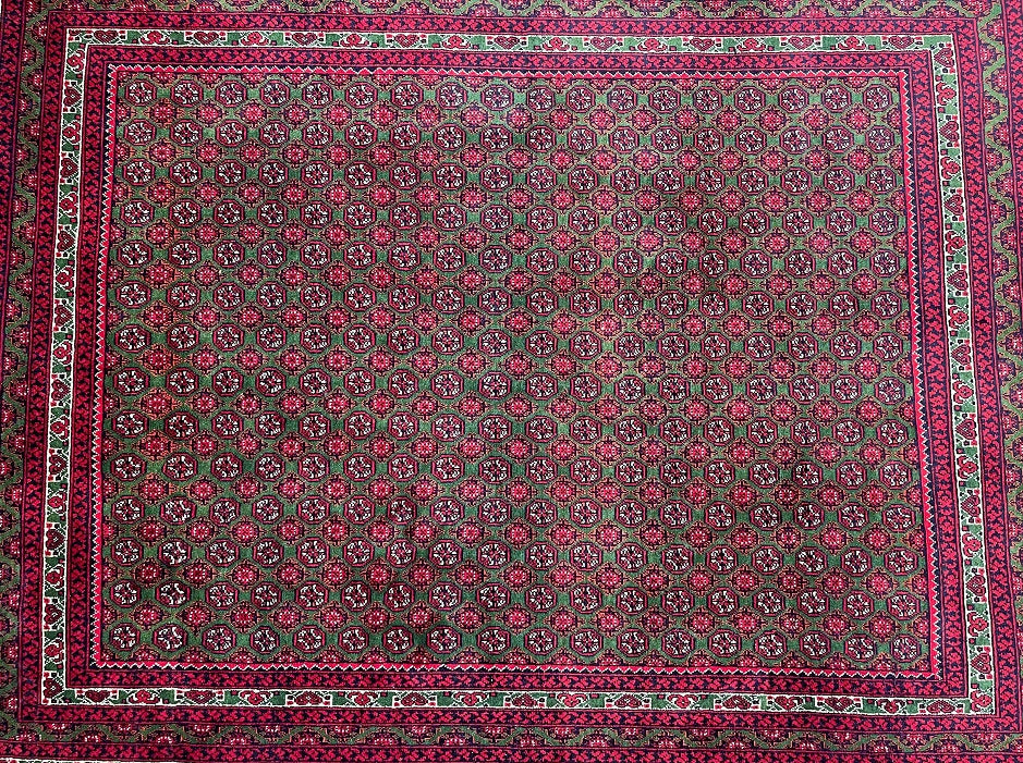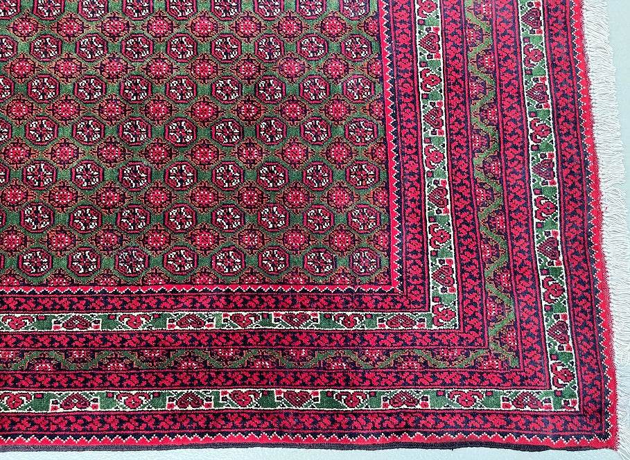 Superb Coffee Table Size Authentic Handmade Afghan Roshnai Rug. Above All It Is Pure Hand Spun Wool Pile On Wool Base. Main Colors Are Green, Black/Indigo Blue, Beige and Burgundy Tones Dyed Using Traditional Methods.