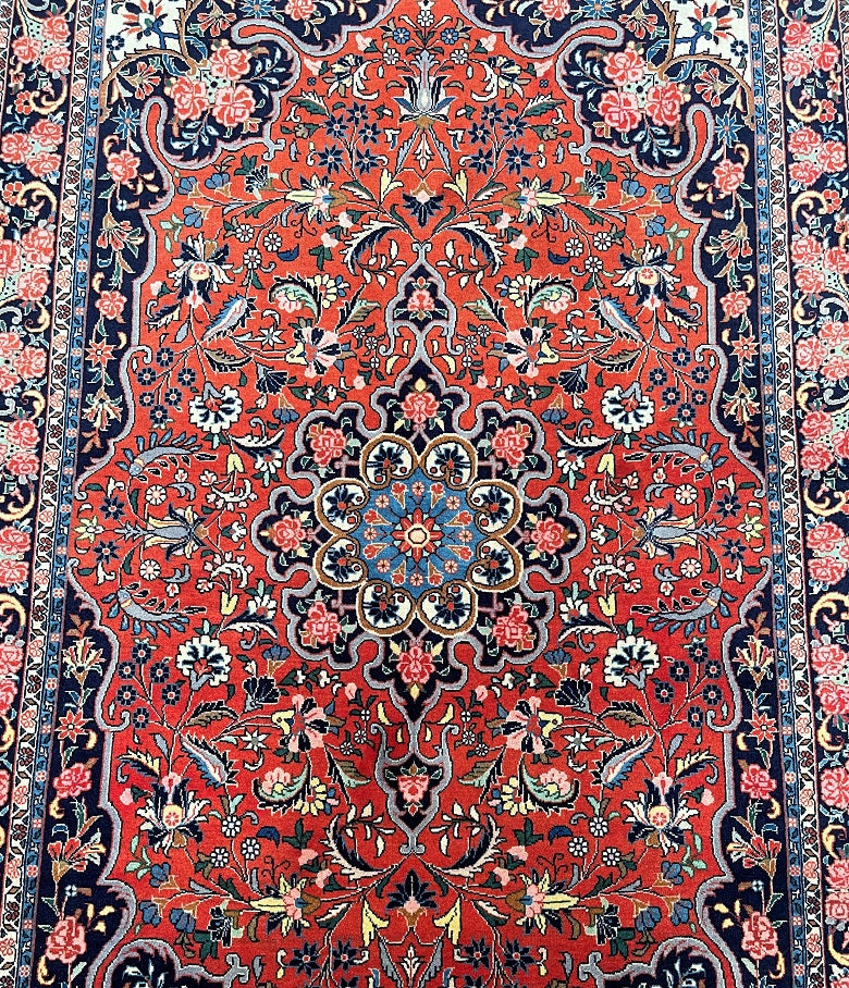 Fine Authentic Handmade Persian Bijar Rug. Above All Bijar Rugs Are Renowned To Be The Iron Carpet Of Persian Rugs. It Is Hard To Find This Quality Handmade From Kurdistan. It Also Has A Pure Lamb’s Wool Pile On Cotton. Burnt Orange/Red, Indigo Blue, Beige, Pink With Touch Of Green and Yellow Tone Dyed Using Traditional Methods.