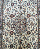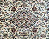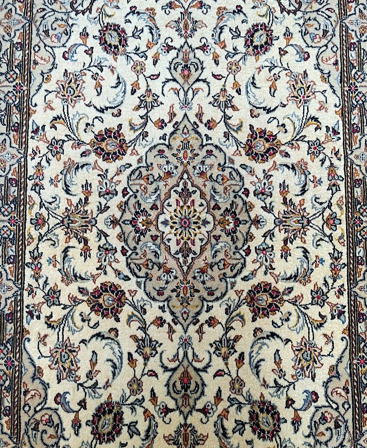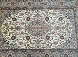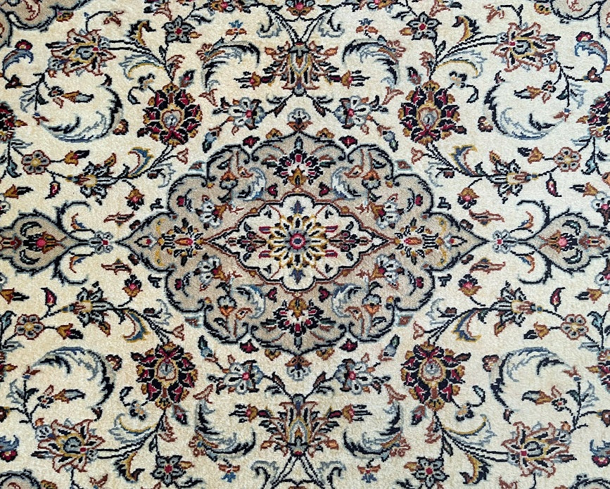 Superb coffee table size authentic Handmade Persian Kashan Rug Signed. It also has a pure lamb’s wool pile on cotton base. Beige/gold, blue, burgundy, yellow and Burnt Orange tones dyed using traditional methods. Signed from of of the most famous weaving house in Kashan "Shadsar".