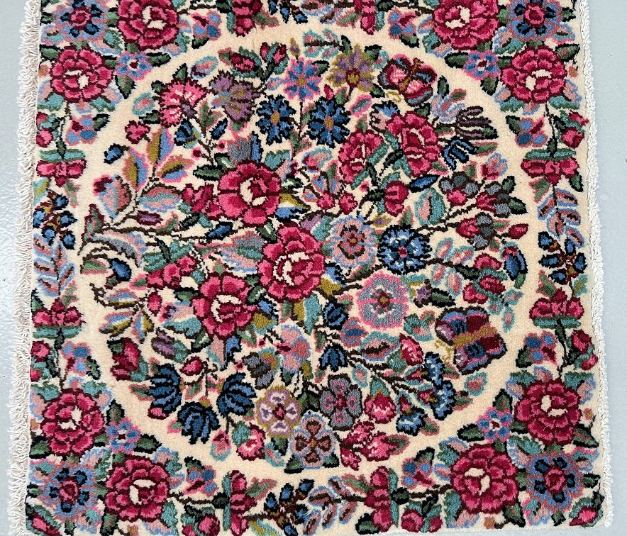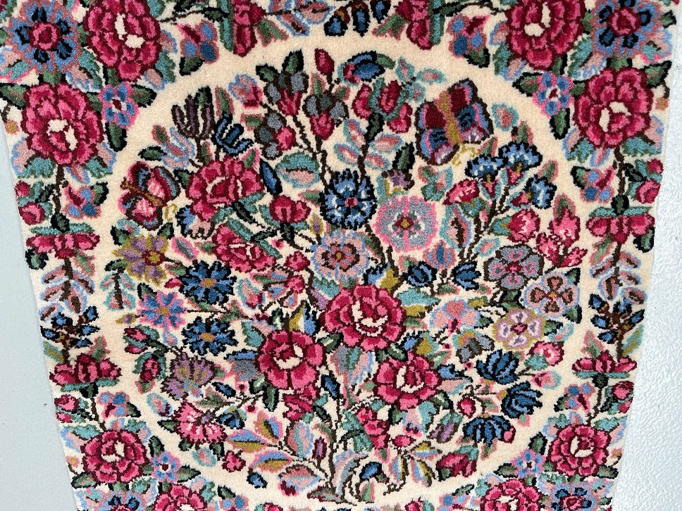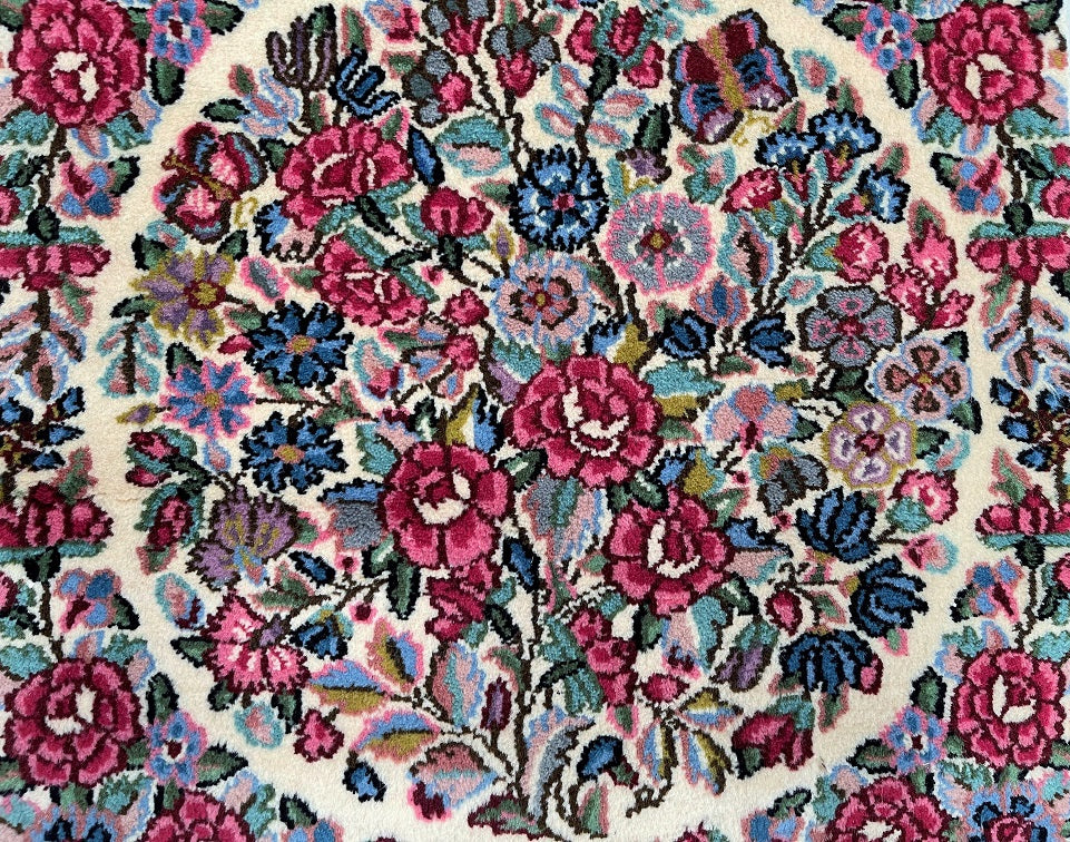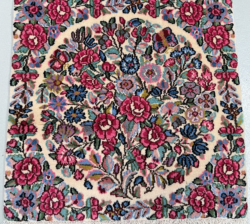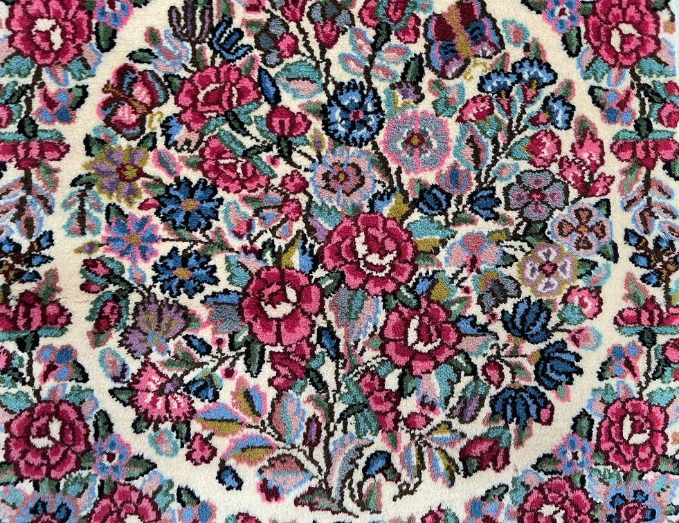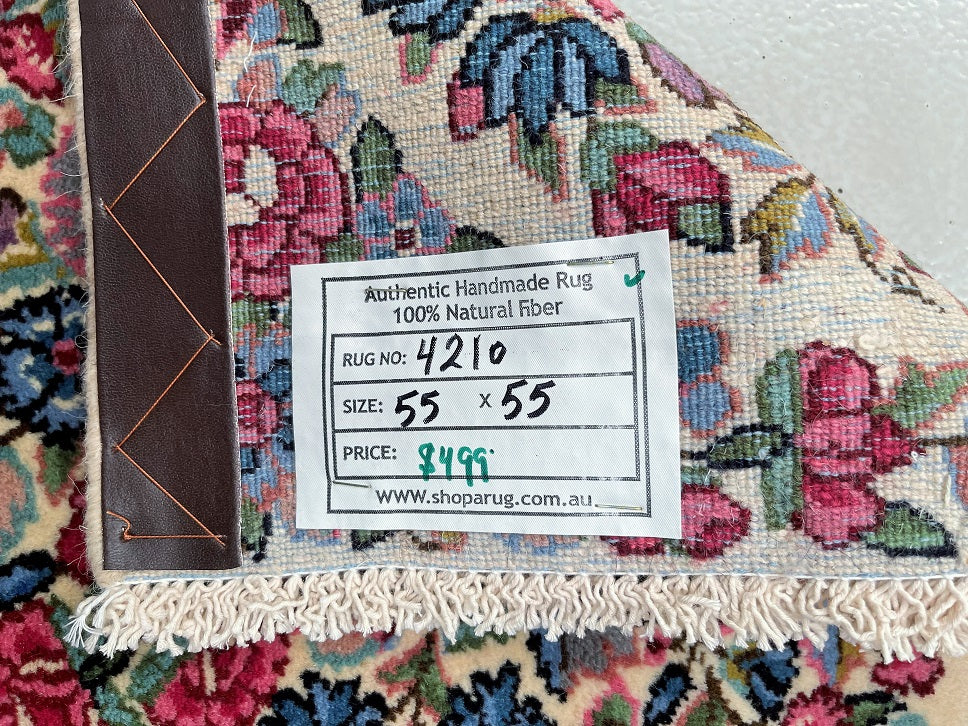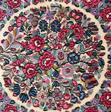 Fine Square Size Authentic Handmade Persian Kerman Rug. Above All We Do Have This Rug In A Matching Pair. It also Has A Pure Lamb’s Wool Pile on Cotton Base. Beige, Blue, Red And Pink Tones Dyed Using Traditional Methods.