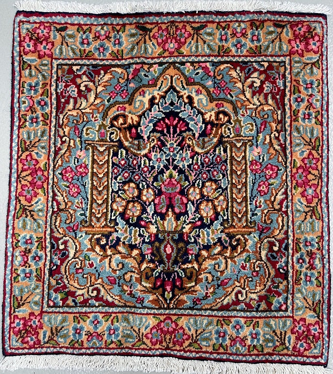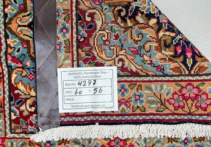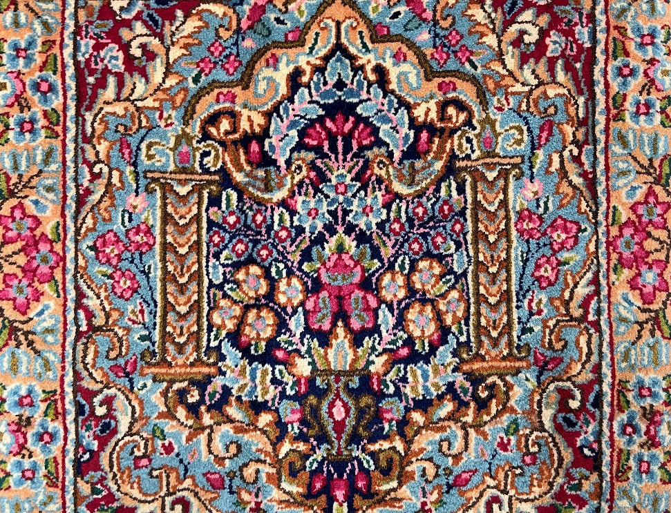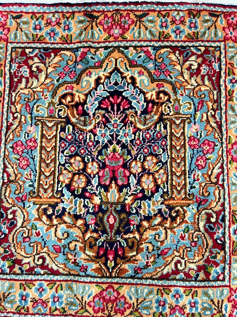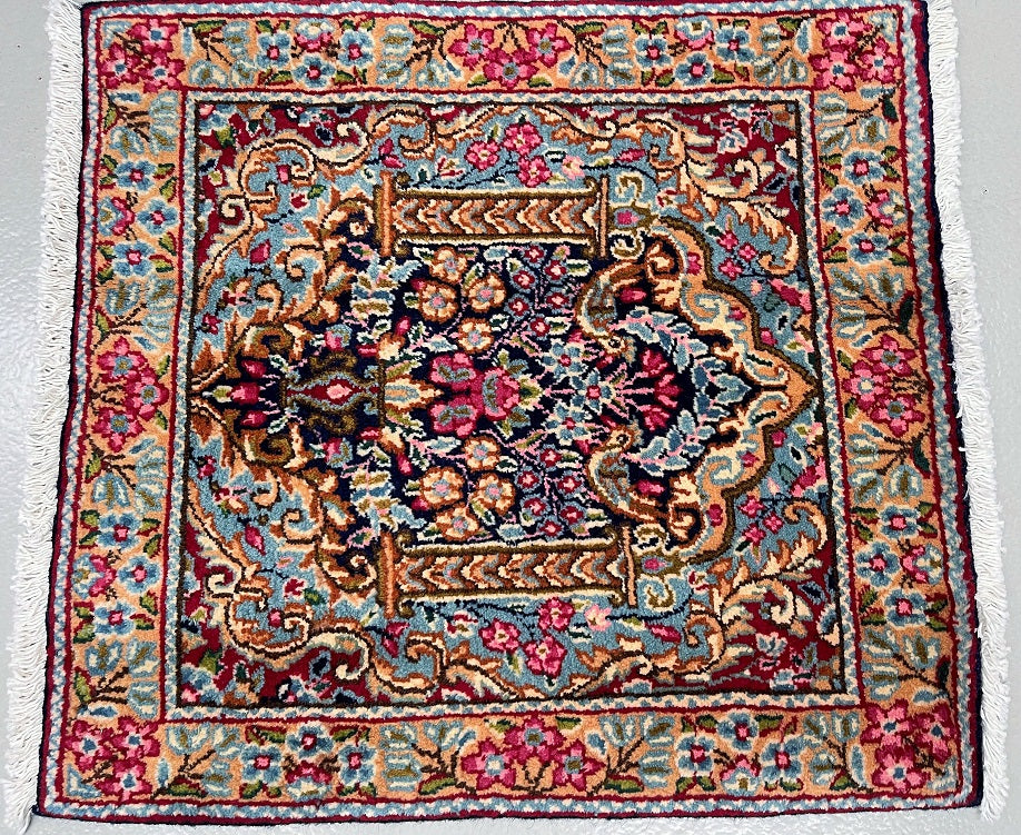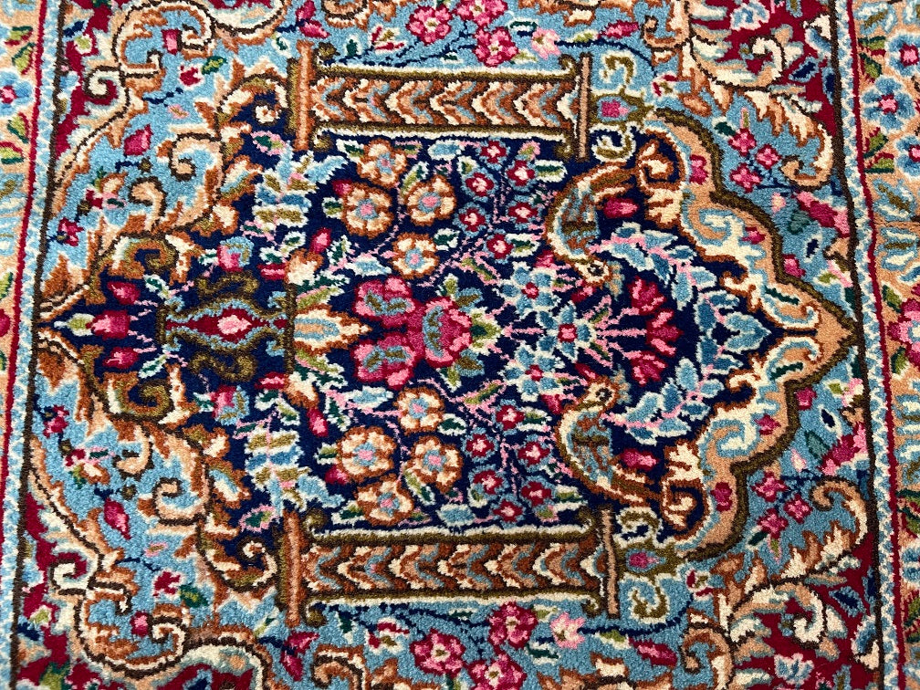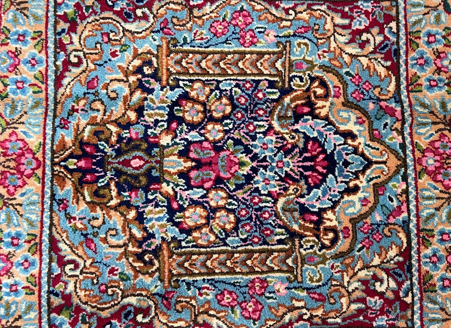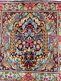 Superb Authentic Handmade Persian Kerman Rug. Above All We Do Have This Rug In A Matching Pair. It also Has A Pure Lamb’s Wool Pile on Cotton Base. Indigo Blue, Beige, green, Pink And Red Tone Dyed Using Traditional Methods.