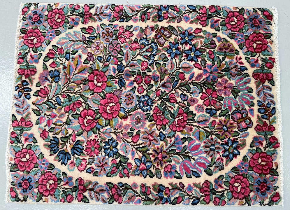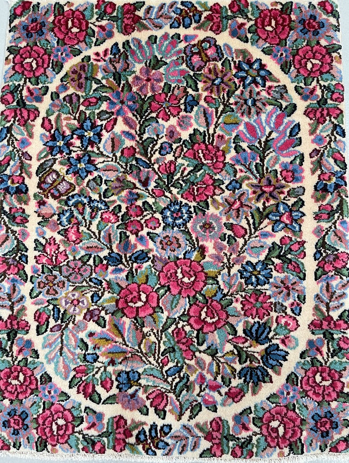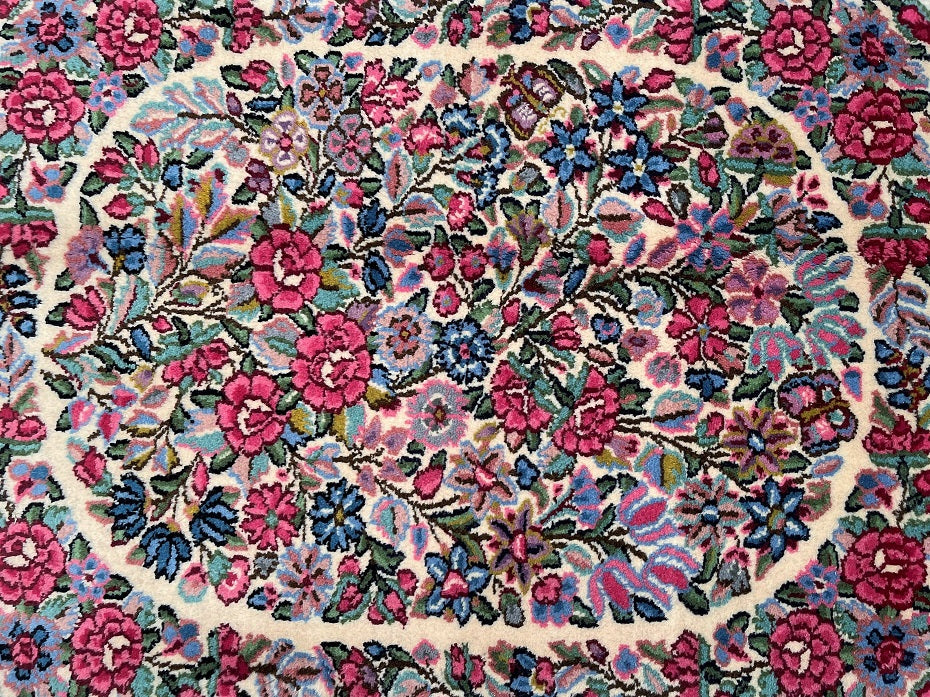 Superb Authentic Handmade Persian Kerman Rug. Above All We Do Have This Rug In A Matching Pair. It also Has A Pure Lamb’s Wool Pile on Cotton Base. Beige, Blue, Red And Pink Tones Dyed Using Traditional Methods.