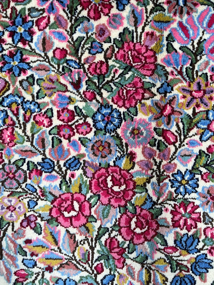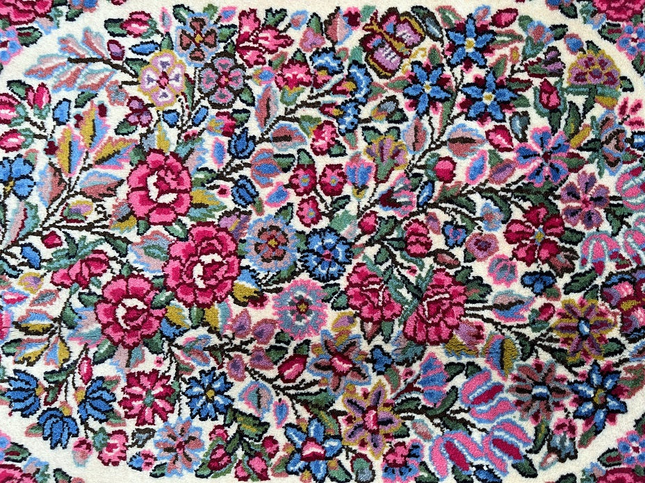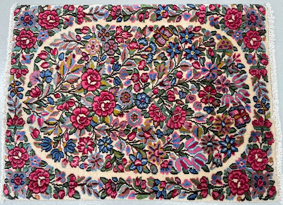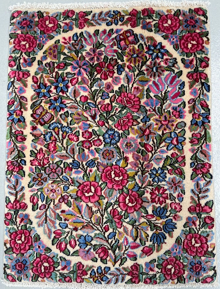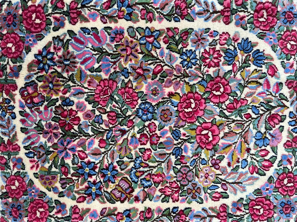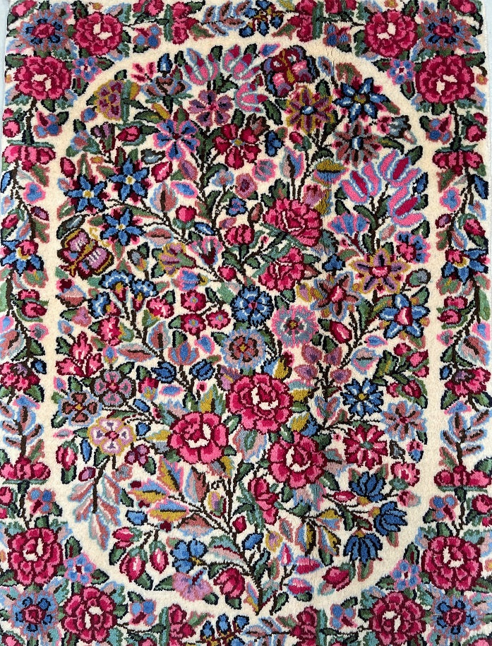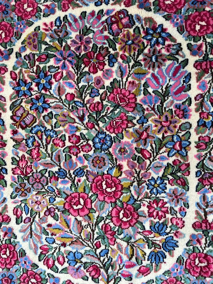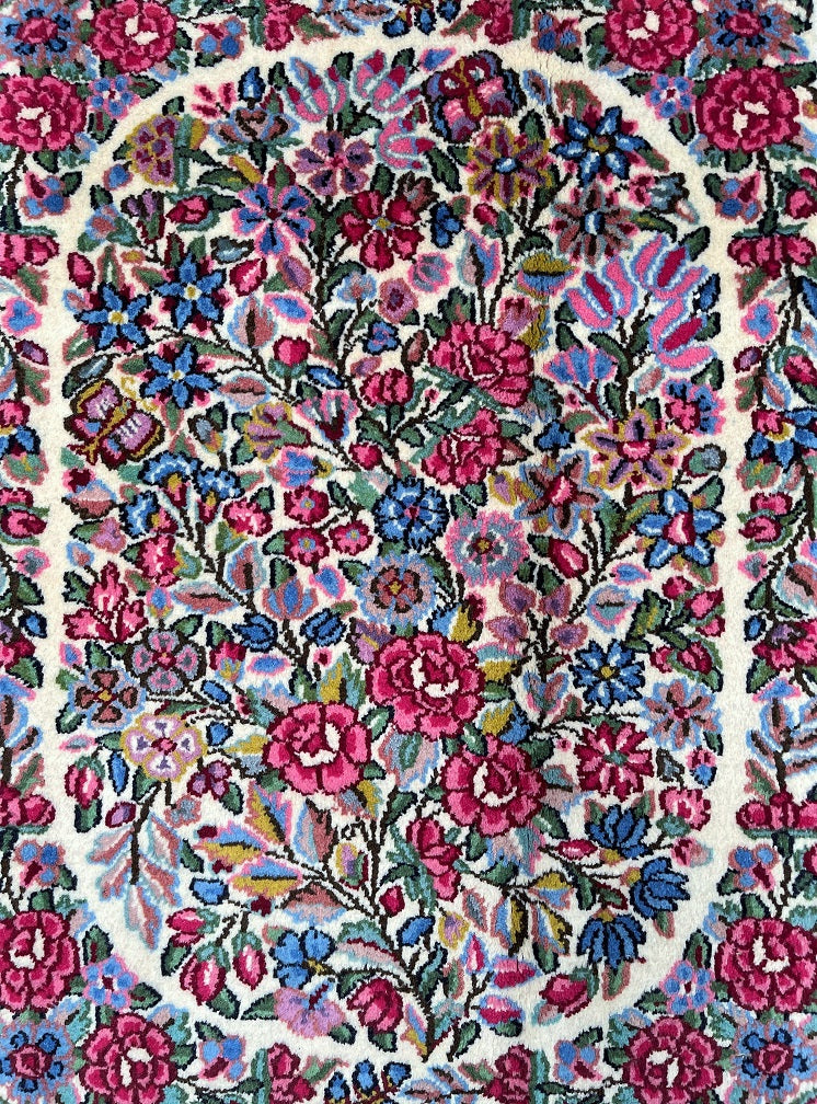 Fine Authentic Handmade Persian Kerman Rug. Above All We Do Have This Rug In A Matching Pair. It also Has A Pure Lamb’s Wool Pile on Cotton Base. Beige, Blue, Red And Pink Tones Dyed Using Traditional Methods.