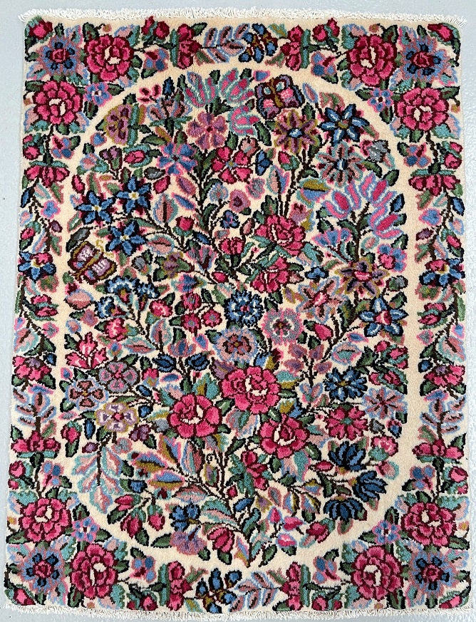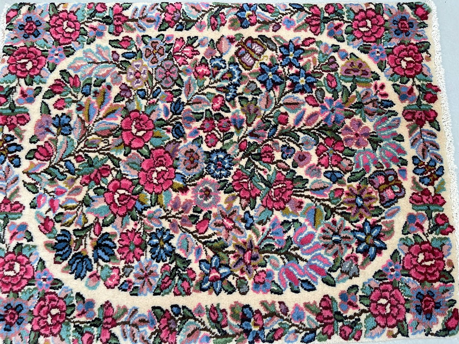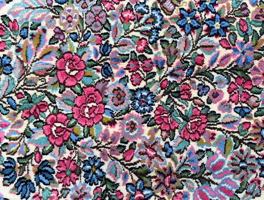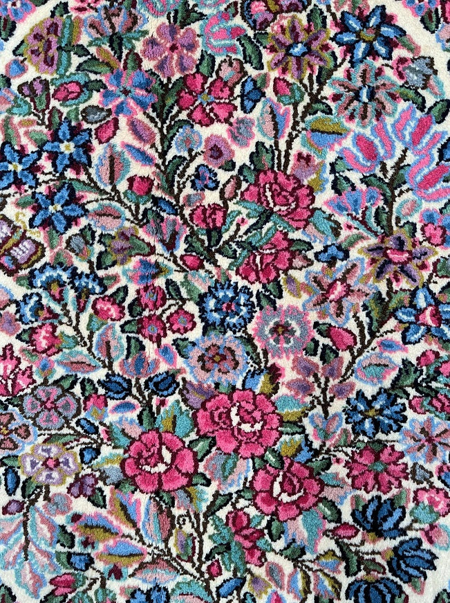 Superb Authentic Handmade Persian Kerman Rug. Above All We Do Have This Rug In A Matching Pair. It also Has A Pure Lamb’s Wool Pile on Cotton Base. Beige, Blue, Red And Pink Tones Dyed Using Traditional Methods.