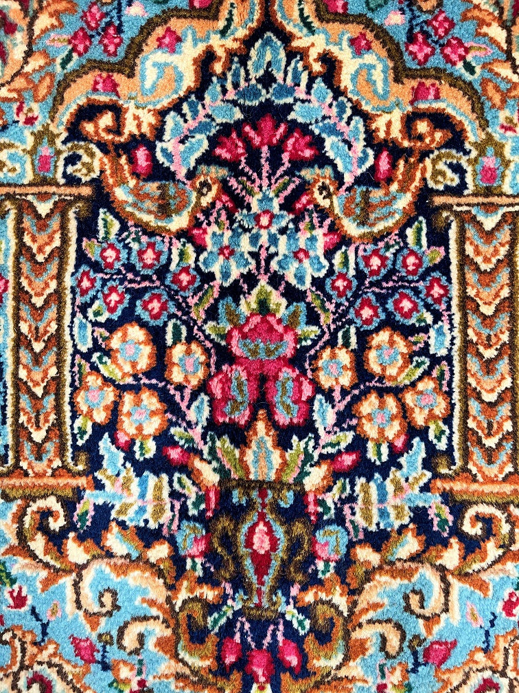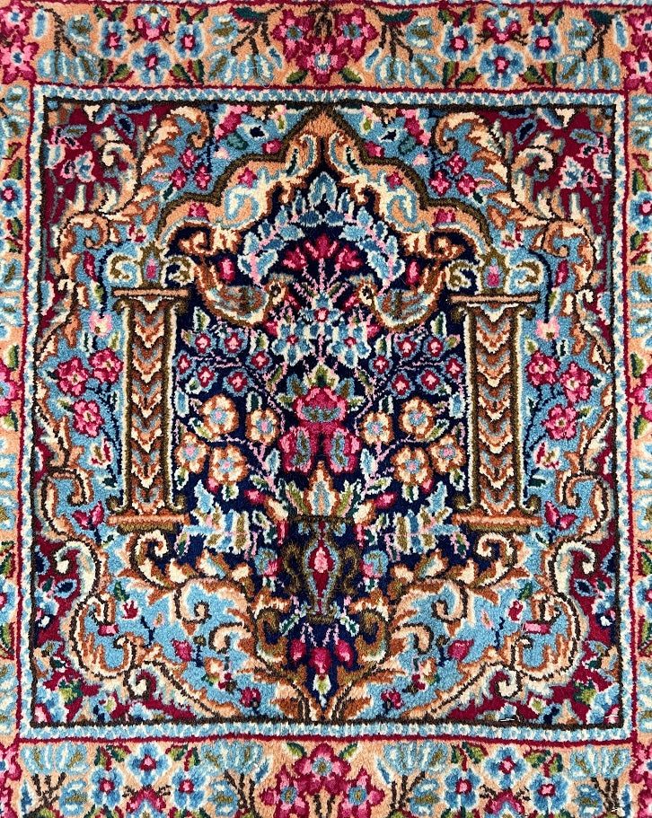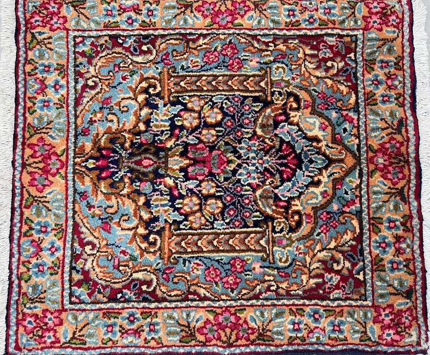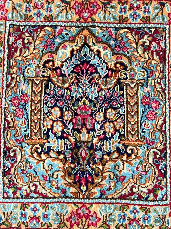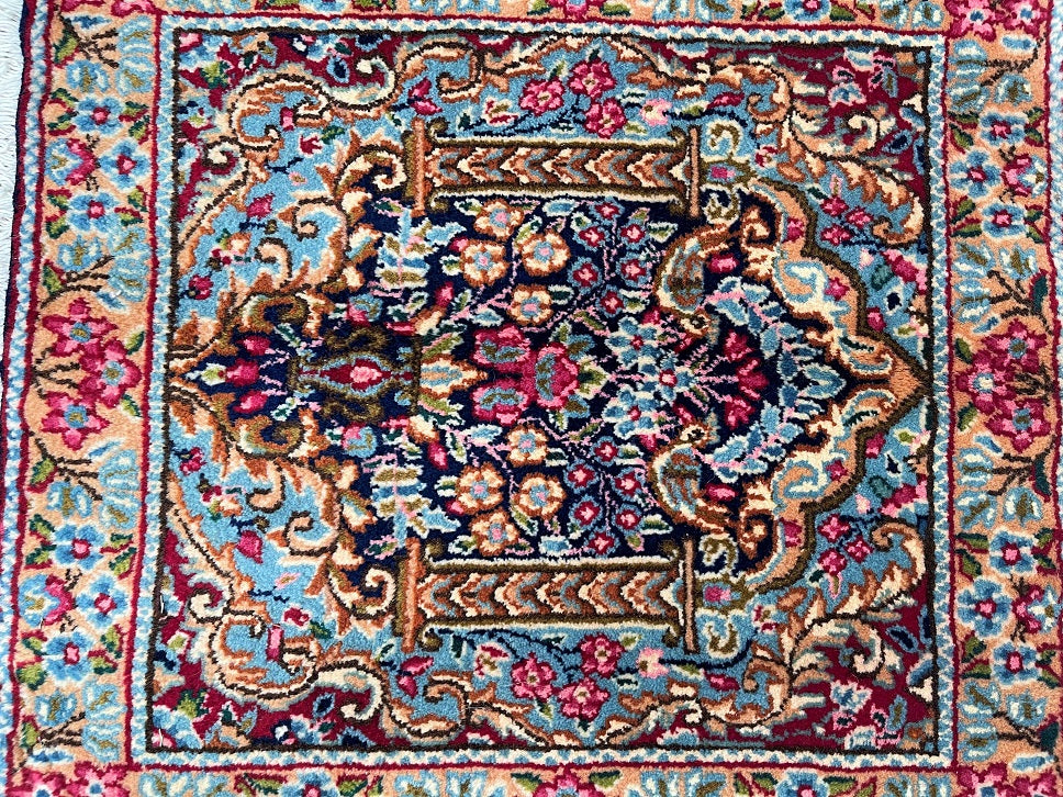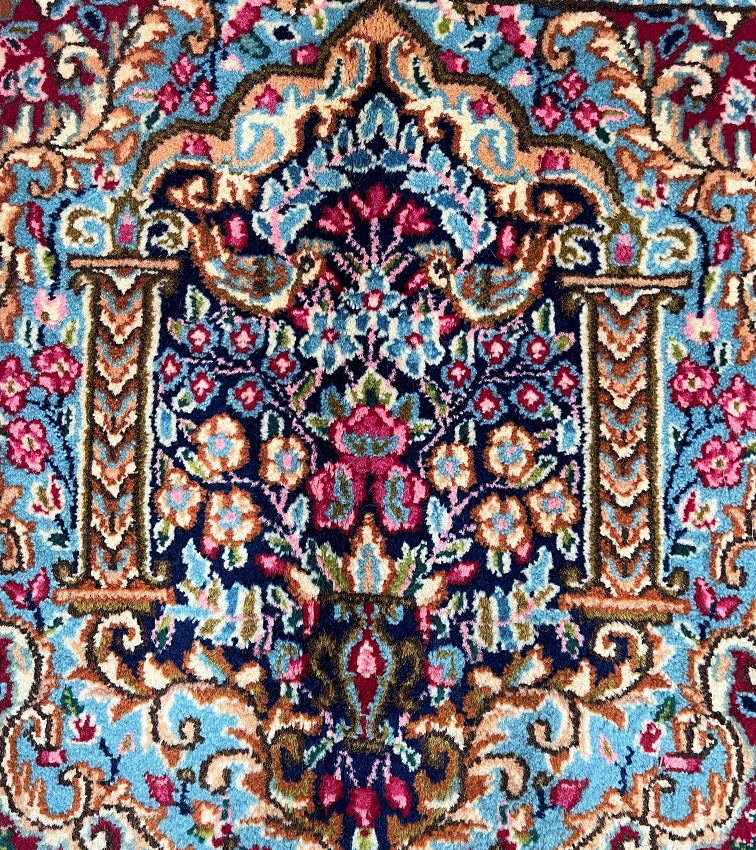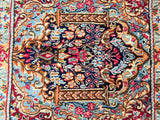 Superb Authentic Handmade Persian Kerman Rug. Above All We Do Have This Rug In A Matching Pair. It Also Has A Pure Lamb’s Wool Pile on Cotton Base. Indigo Blue, Beige, green, Pink And Red Tones Dyed Using Traditional Methods.