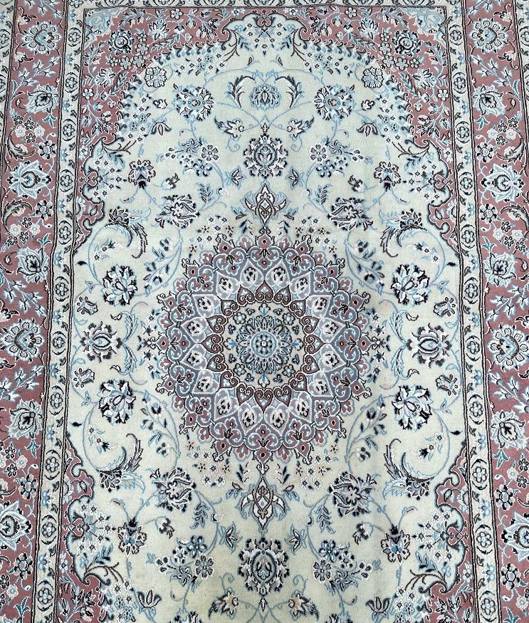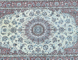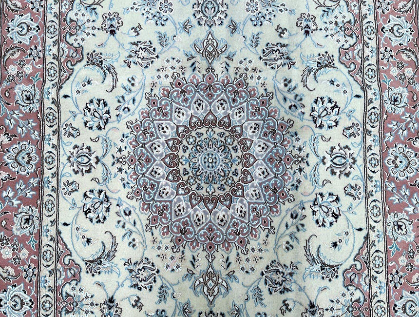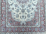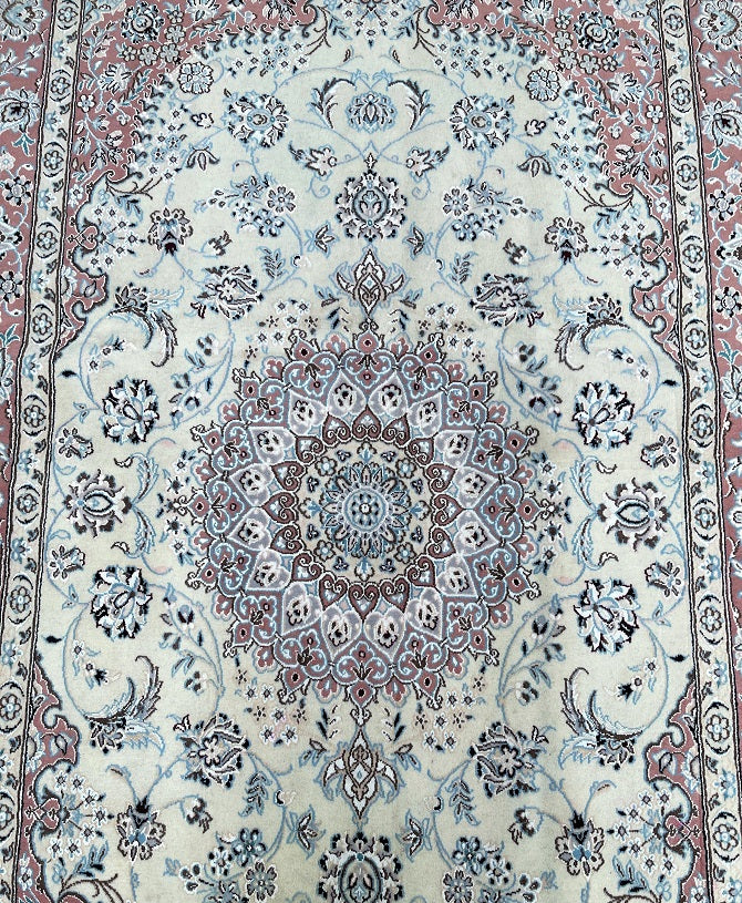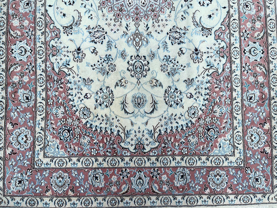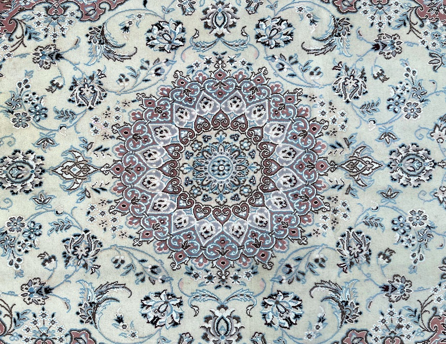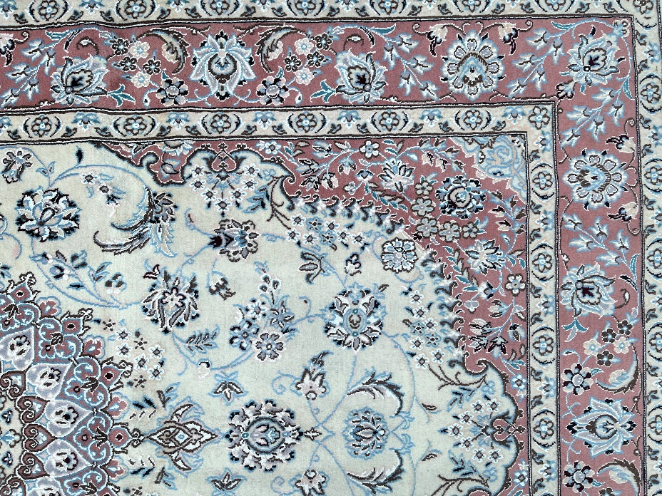 Superb room size authentic handmade Persian Nain rug. Above all this is a fine grade of Nain rug called 9La (9Ply) base. It has a Lamb’s wool and silk inlaid pile on cotton base. Rare beige, blue, pink, brown and black tones dyed using traditional methods.