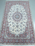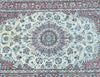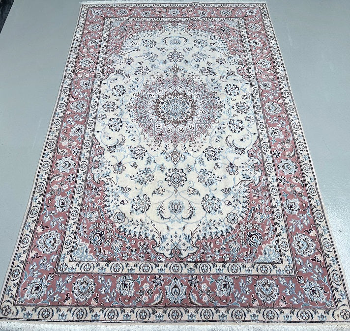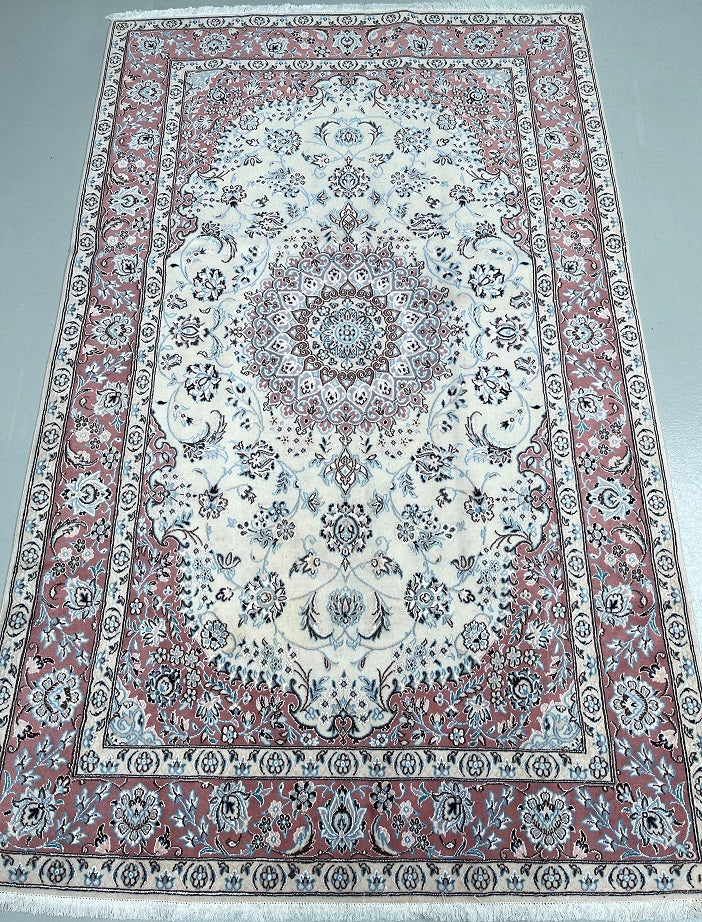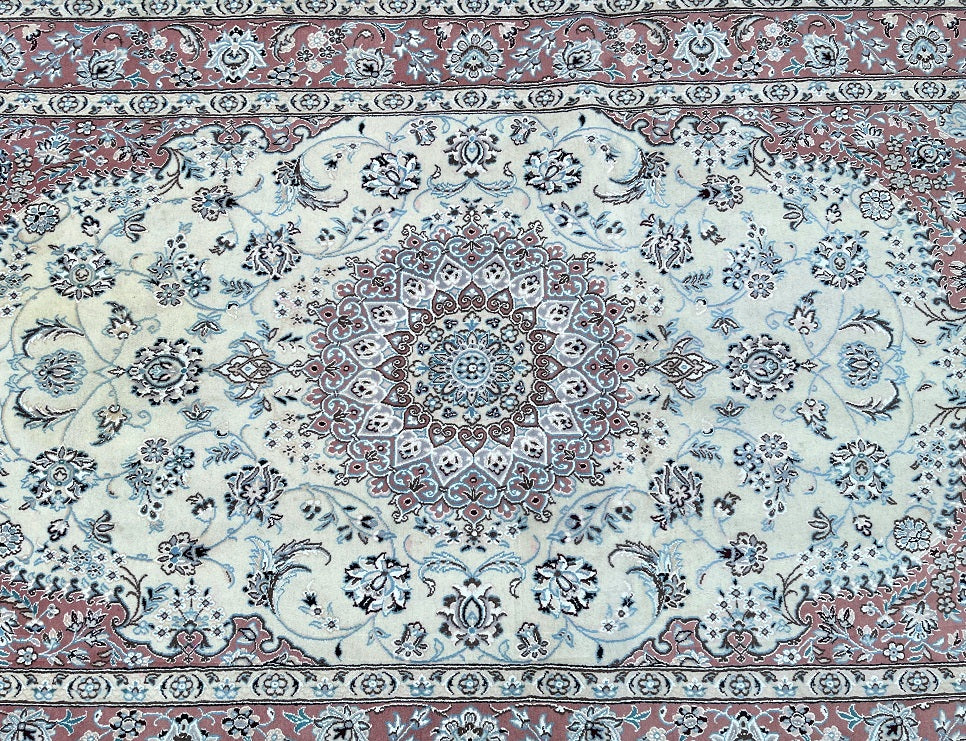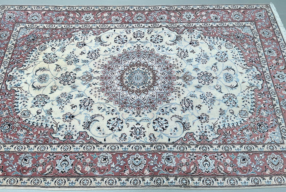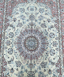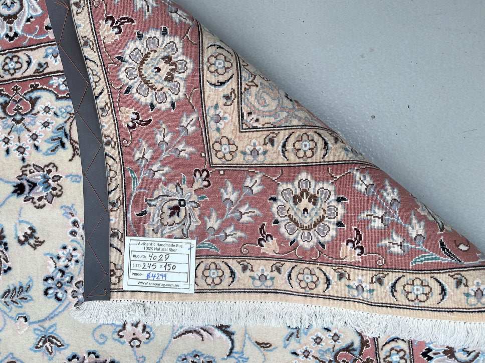 Superb room size authentic handmade Persian Nain rug. Above all this is a fine grade of Nain rug called 9La (9Ply) base. It has a Lamb’s wool and silk inlaid pile on cotton base. Rare beige, blue, pink, brown and black tones dyed using traditional methods.