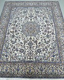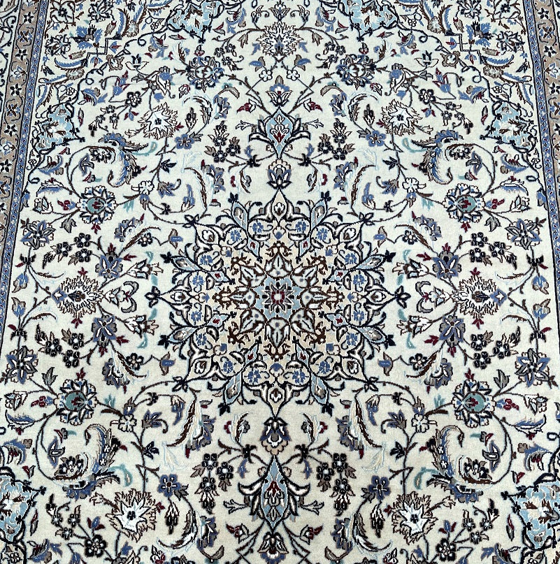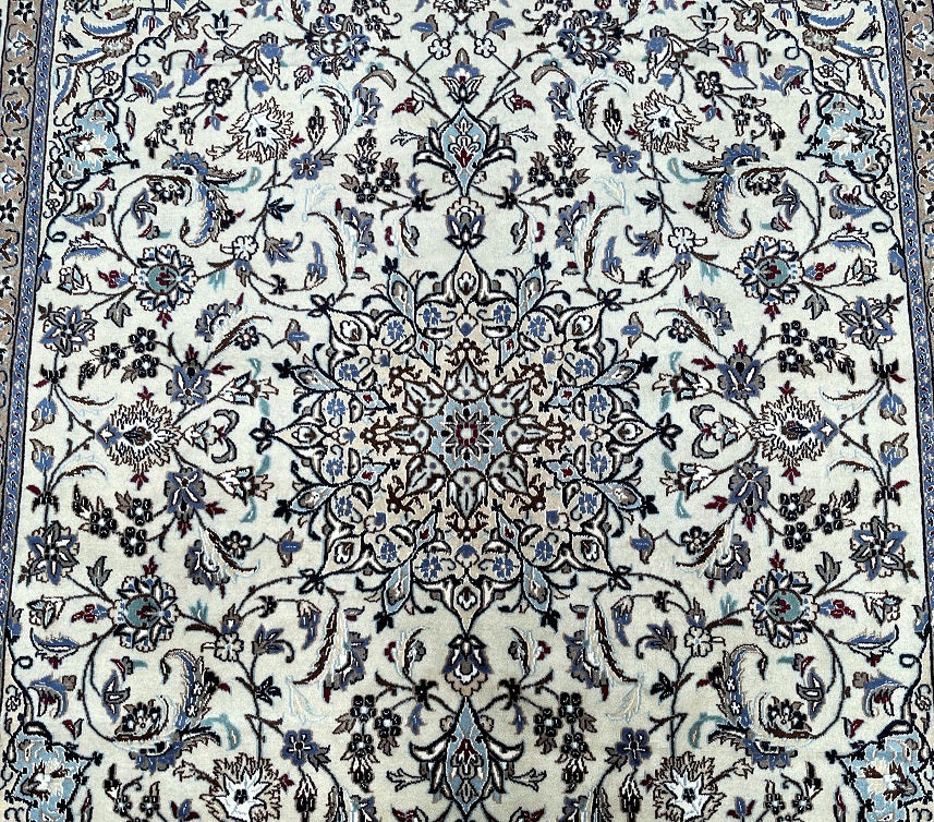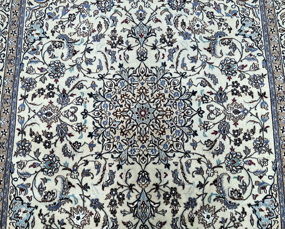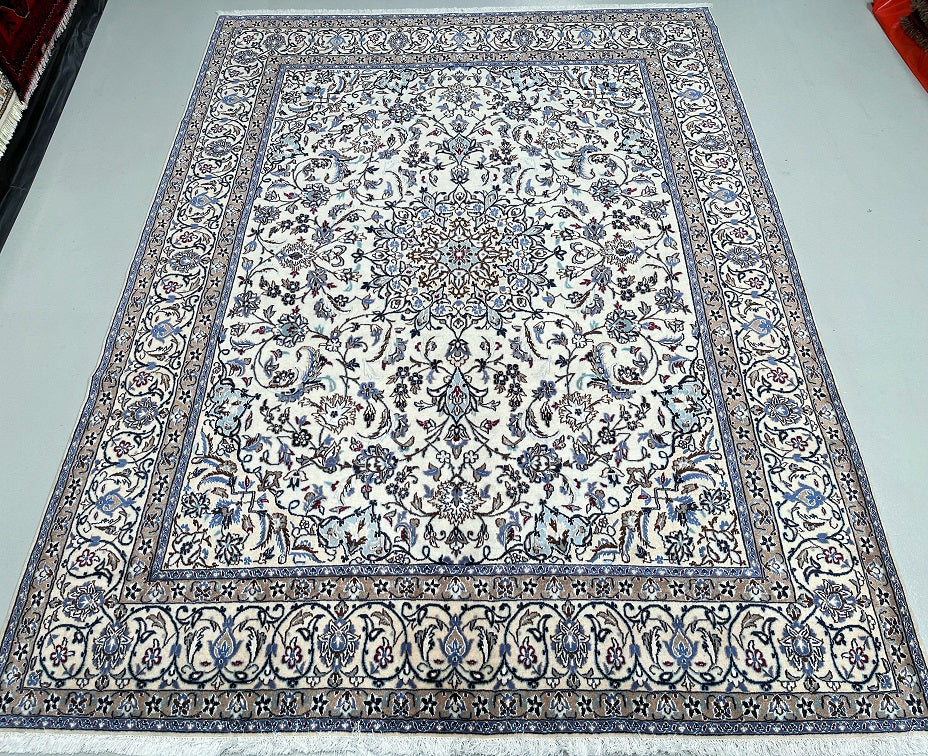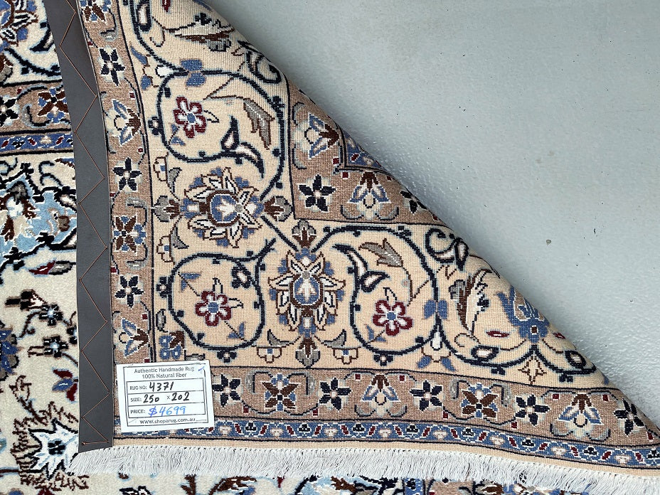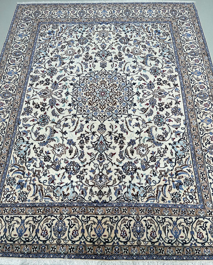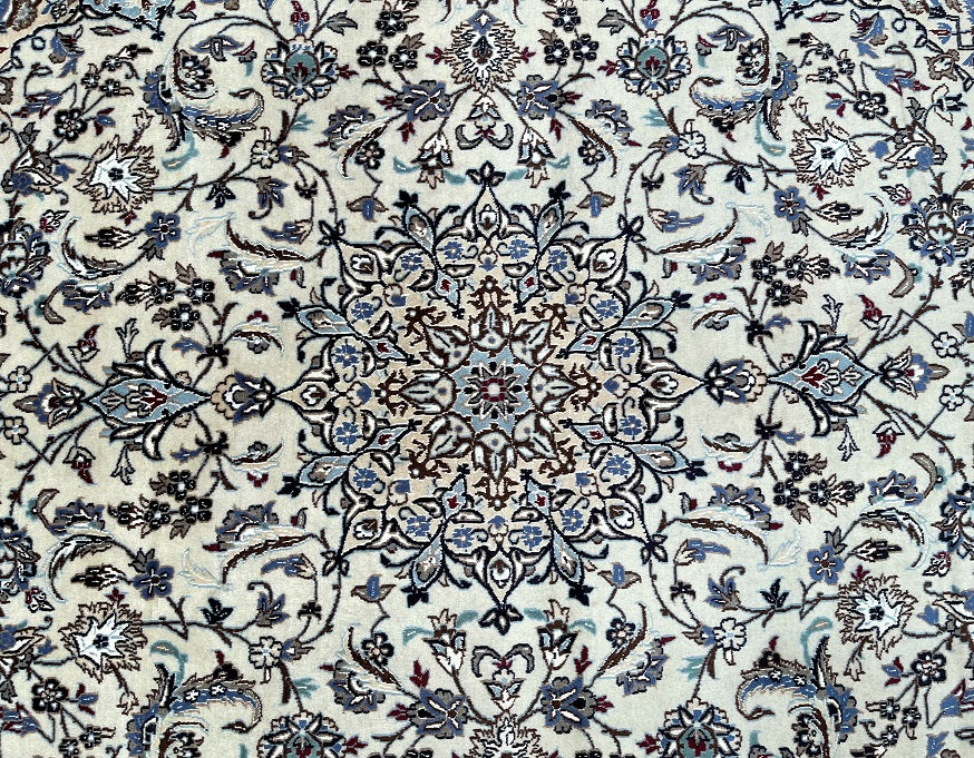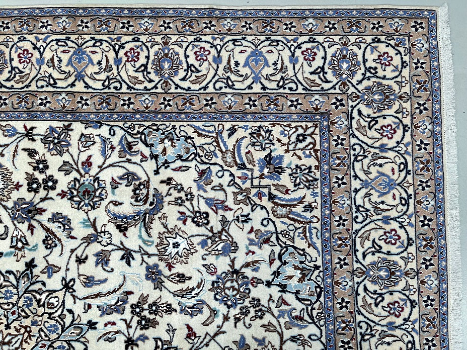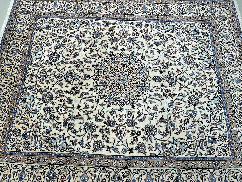 Superb squarish room size authentic handmade Persian Nain rug. Above all it is hard to get this quality original handmade rug in red and beige tone from city of Nain. It has a Lamb’s wool and silk inlaid pile on cotton base. Rare beige, blue, burgundy and brown tones dyed using traditional methods.