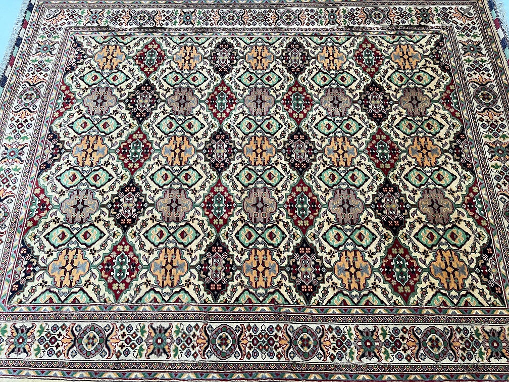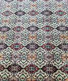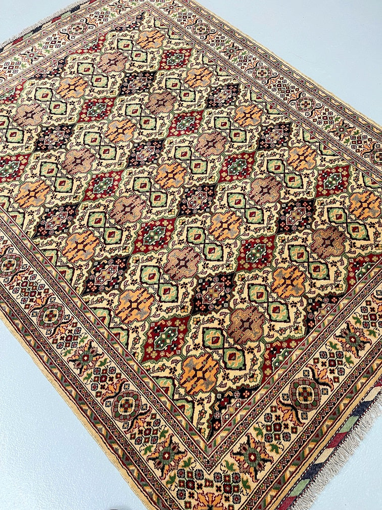 Gorgeous Coffee Table Size Handmade Afghan Roshnai Rug. Above All It Is Merino Wool Pile On Cotton Base. The Main Colors are Gold, Beige, Pistachio, Burgundy and Black Dyed Using Traditional Methods.