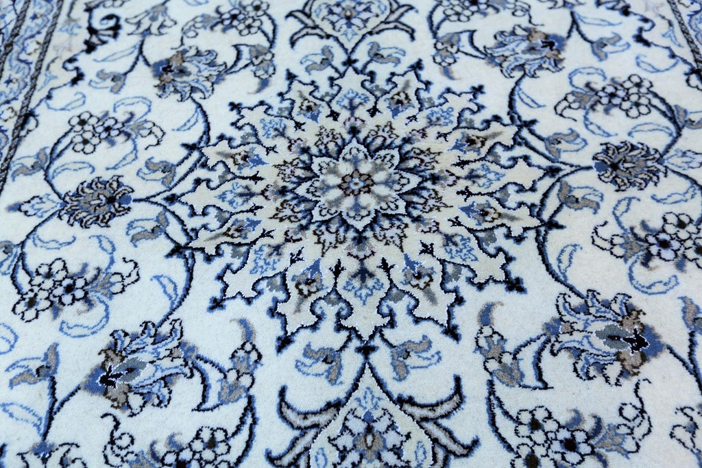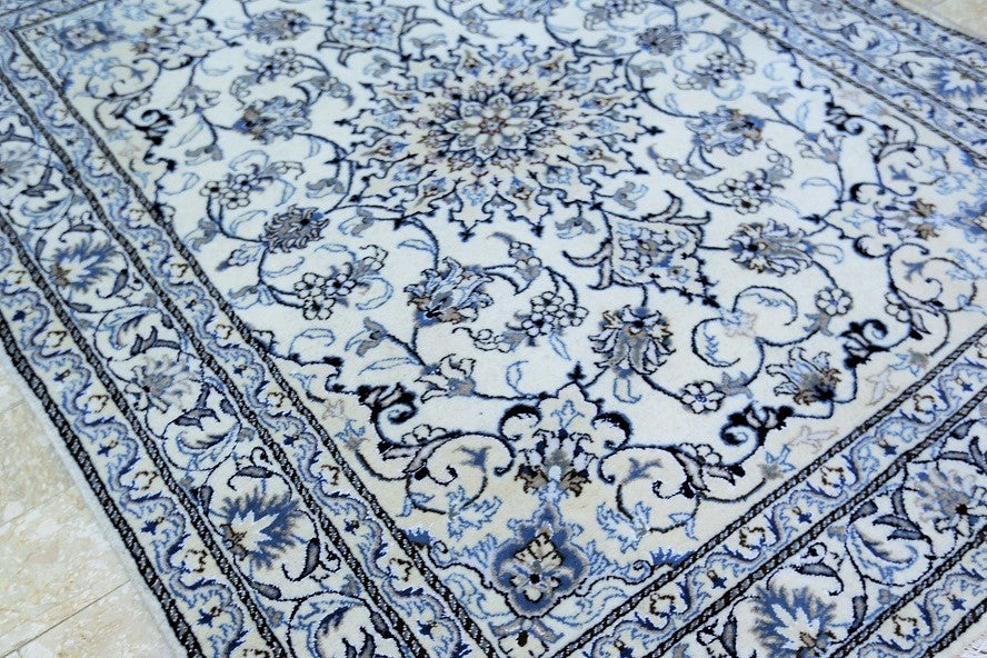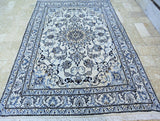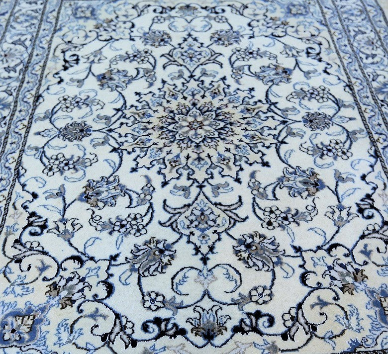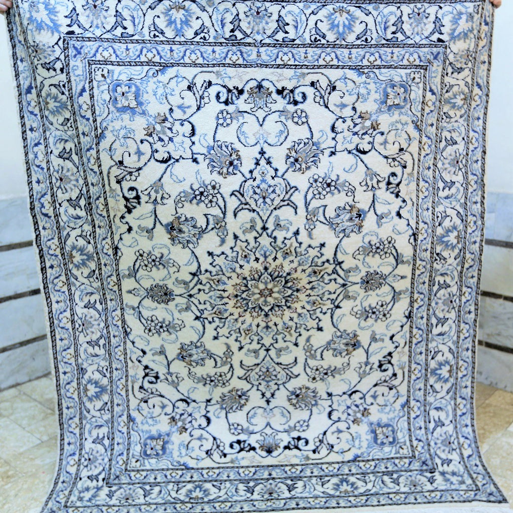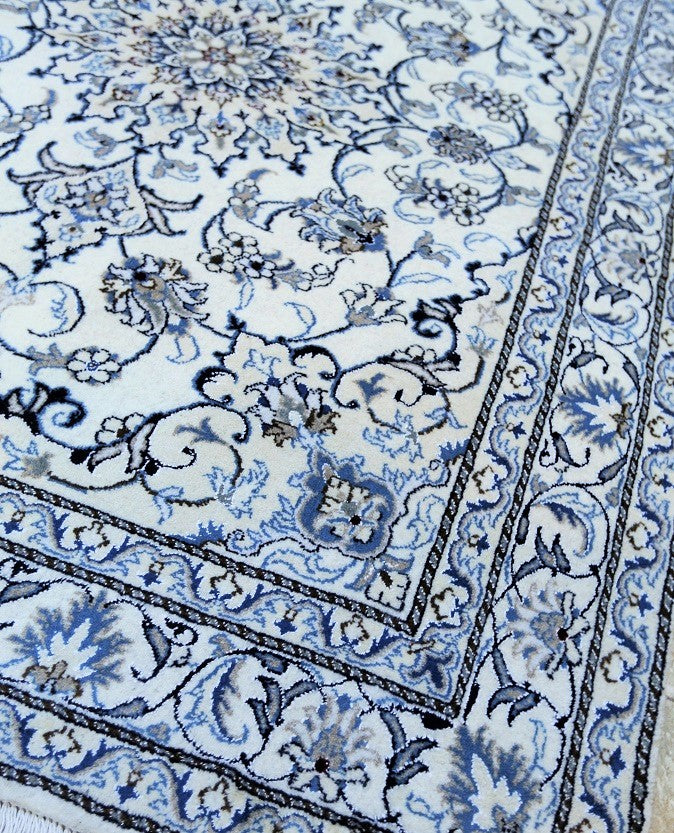 Fine Floral Hand Knotted Persian Nain Carpet. Above. Pure Lamb’s Wool Pile On Cotton Base. Beige And Blue Tones Dyed Using Traditional Methods.